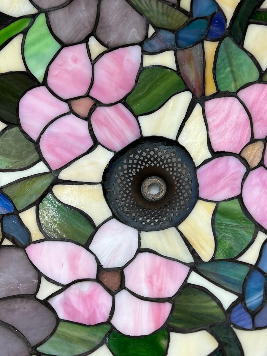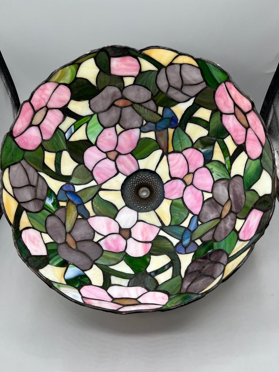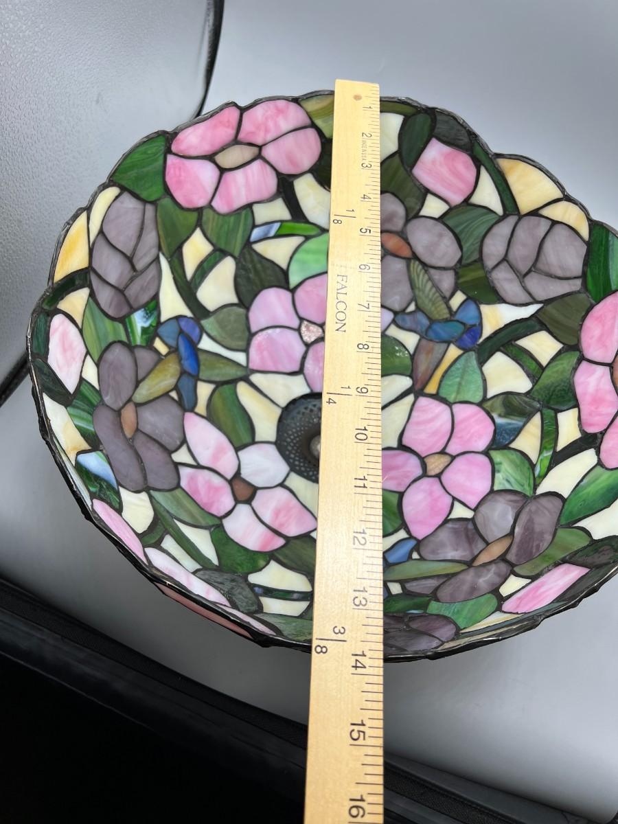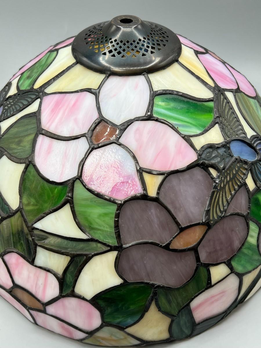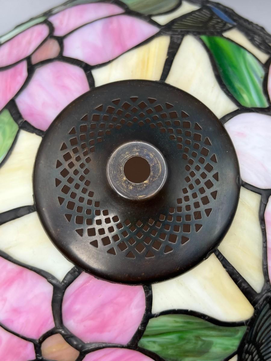 Mid Century Modern Stained Glass Art Hummingbird Pink Flower Motif Lamp Shade