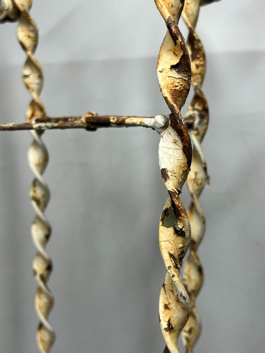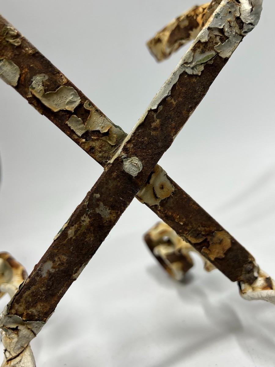The entire piece is rusting and there are some parts that the paint is chipping off, but there is no significant damage and can be restored or used as is for decor. Check pictures for more details and for sizing.