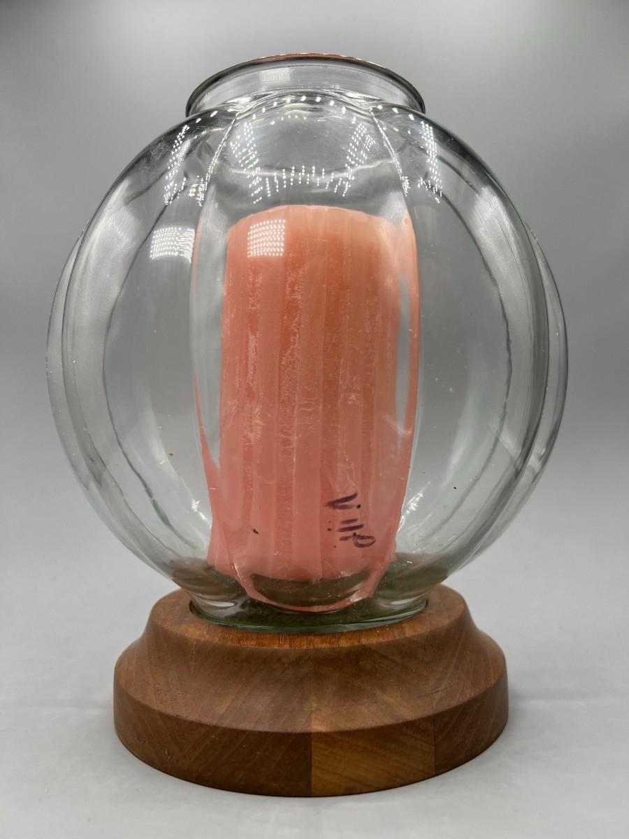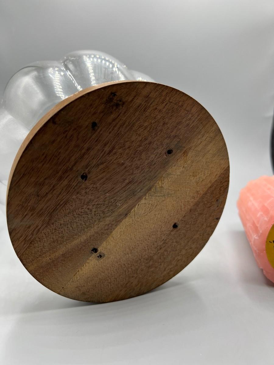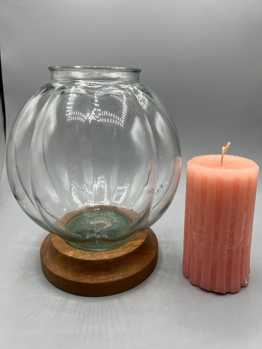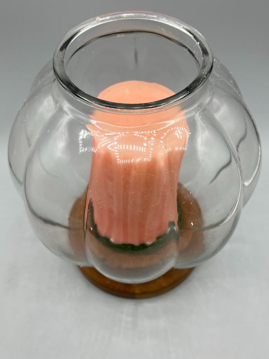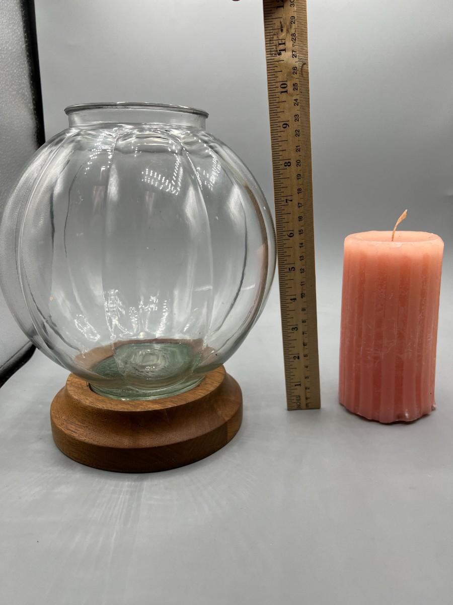 There is no significant damage to the glass or wood and is in overall good displayable condition. The candle has not been used, check pictures for more details and for sizing.