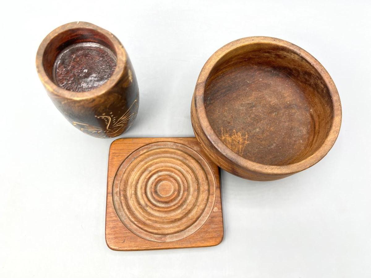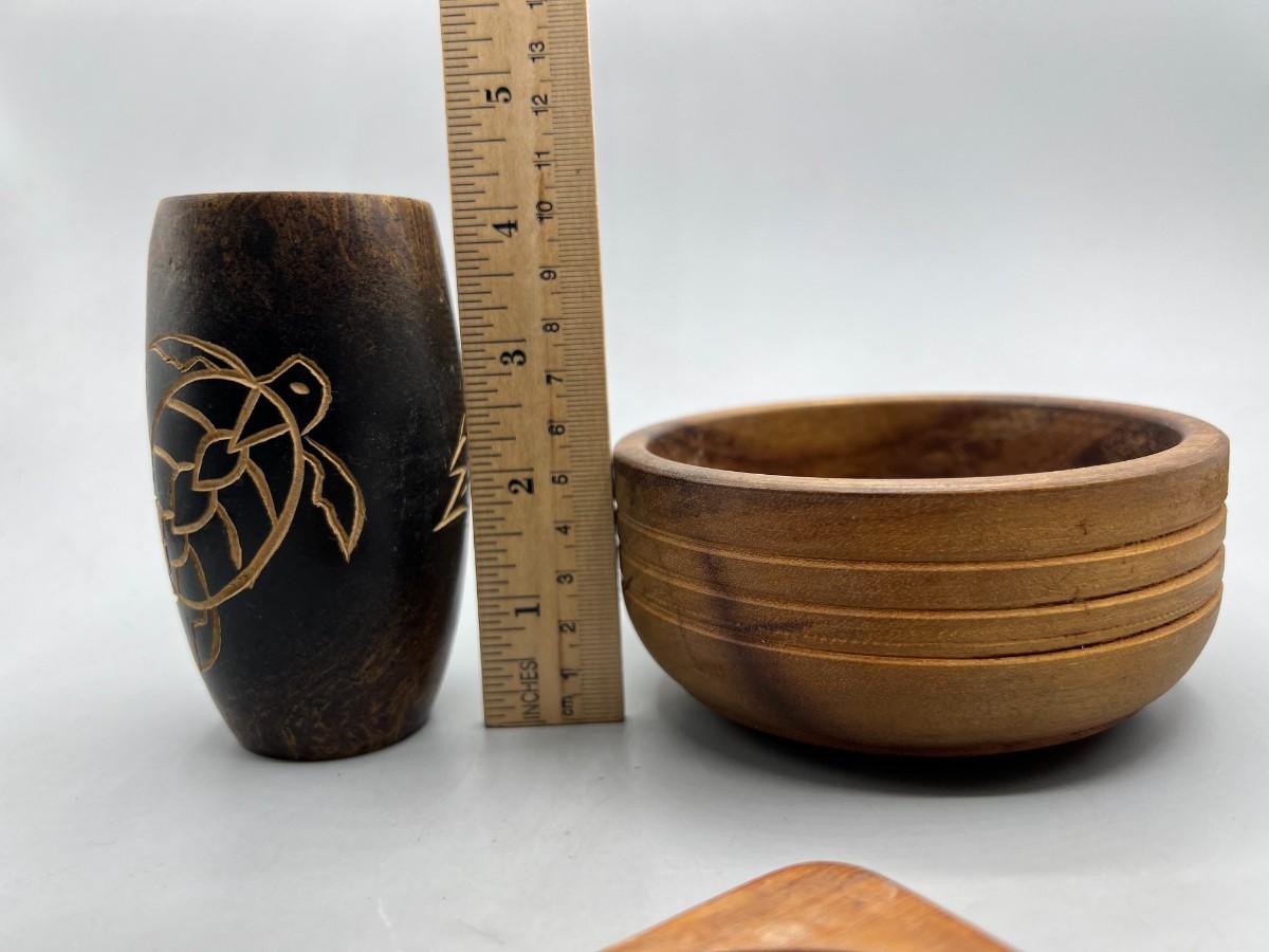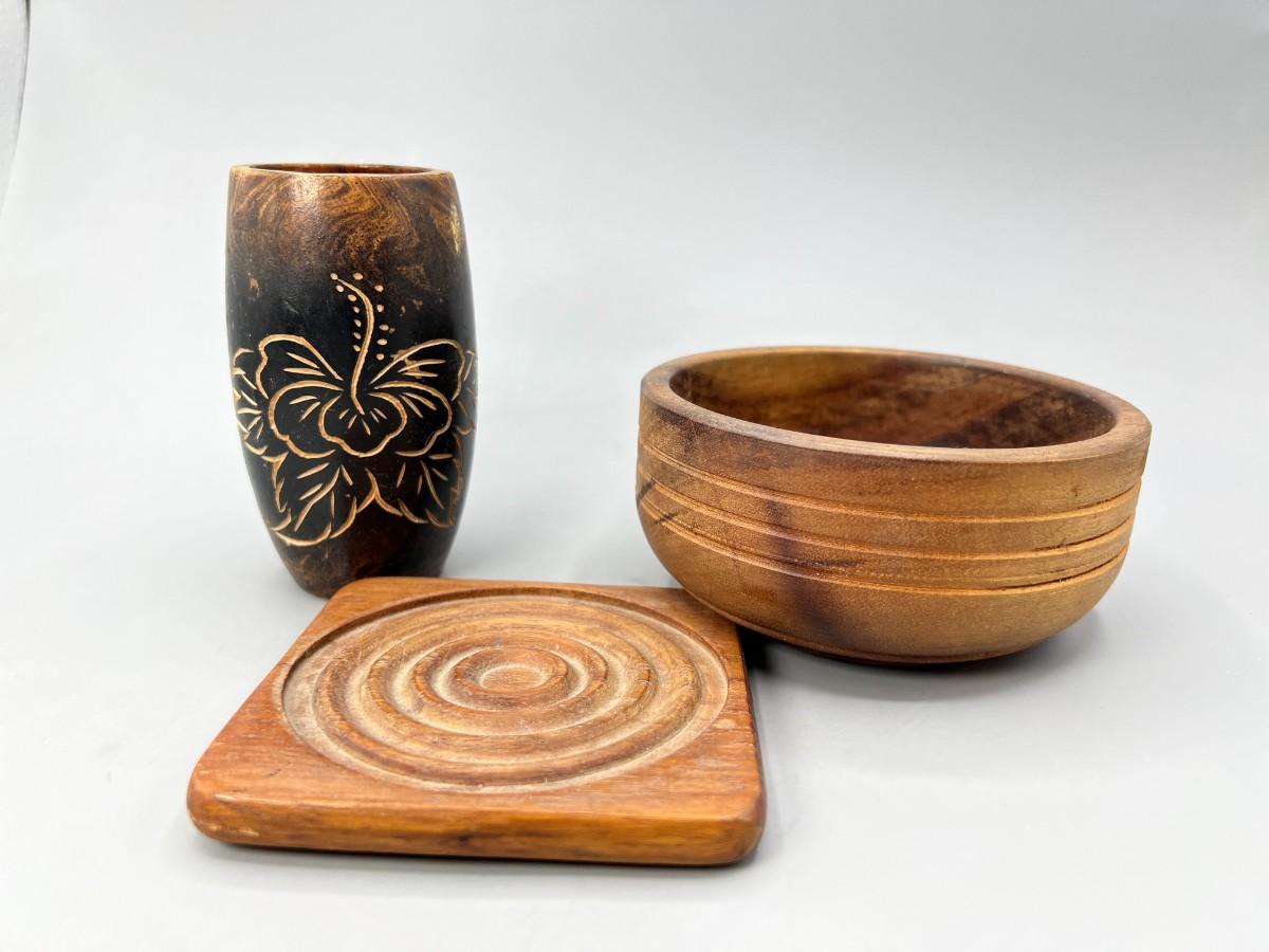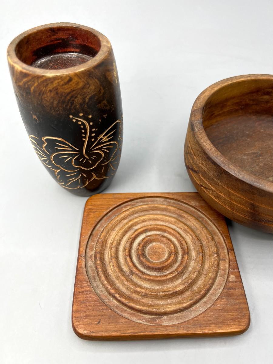 Lot of Handcarved Wooden Trinkets Souvenir Kauai Hibiscus Candle Holder, Drink Coaster & More