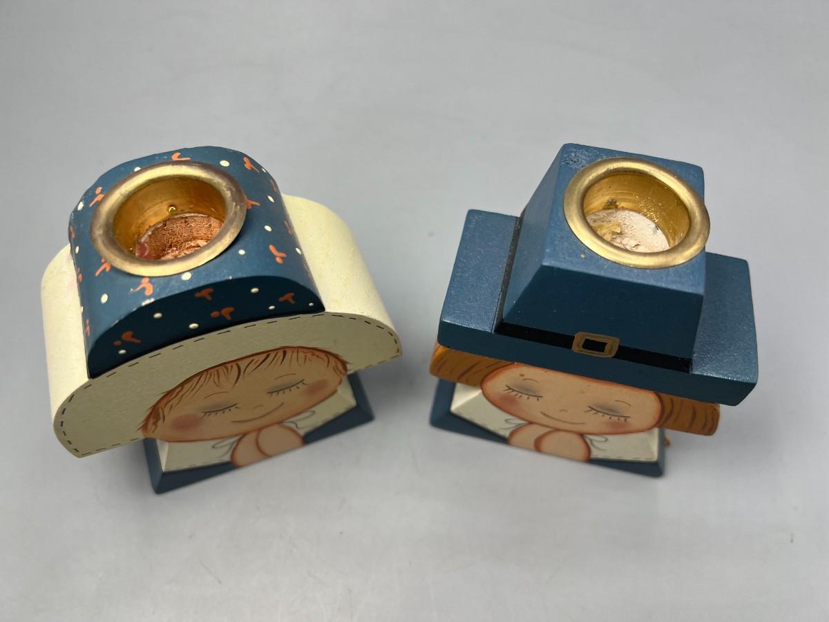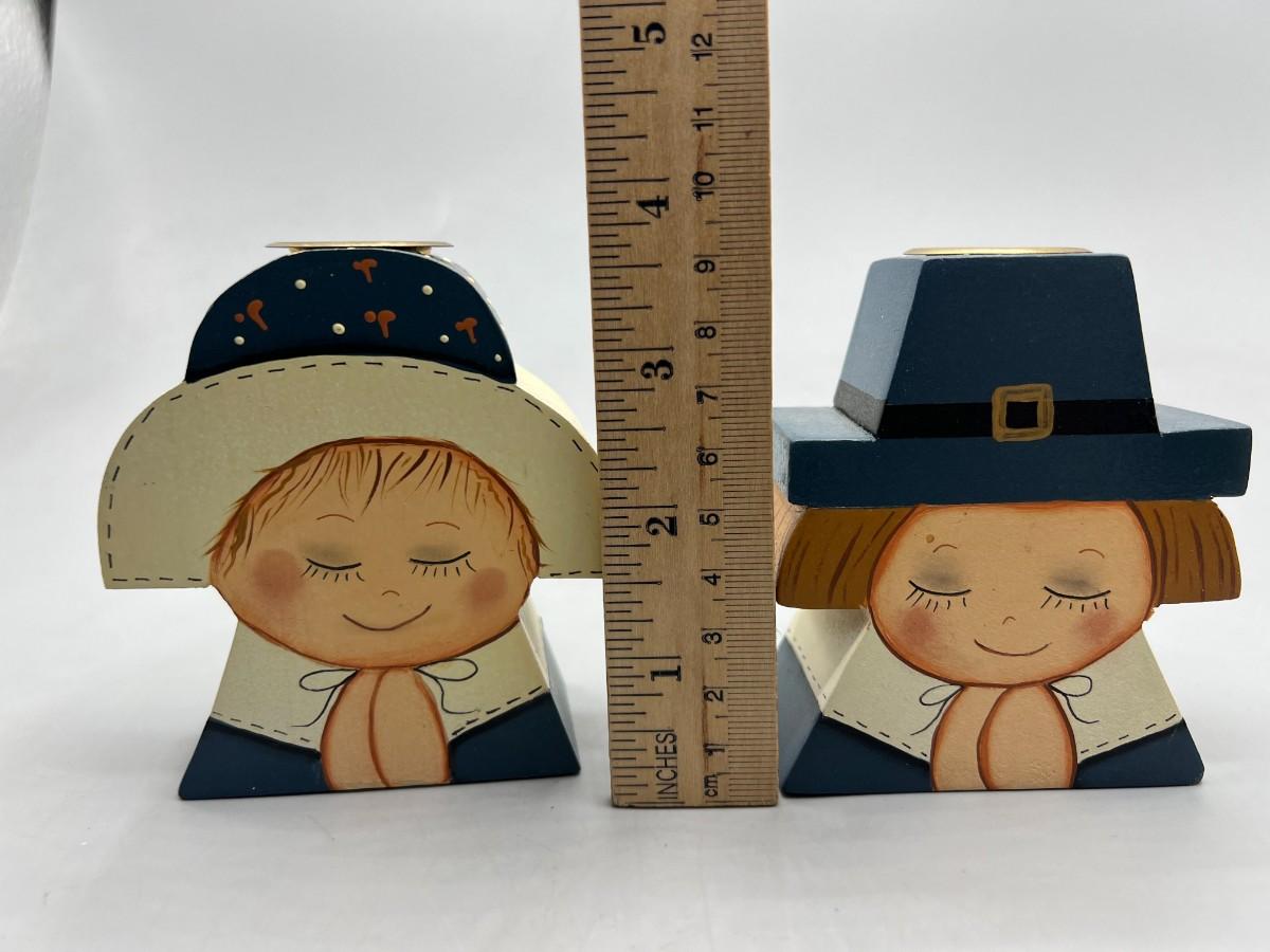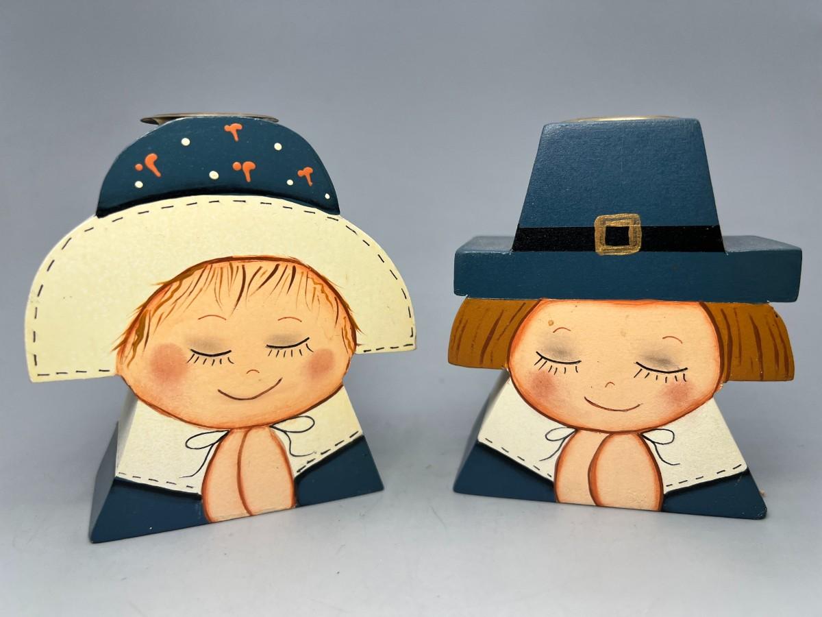 Retro Wooden Painted Praying Pilgrims Candlestick Holders