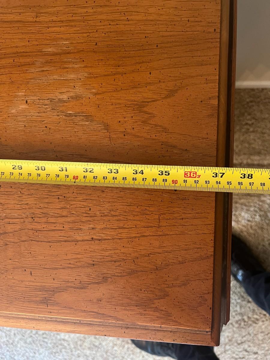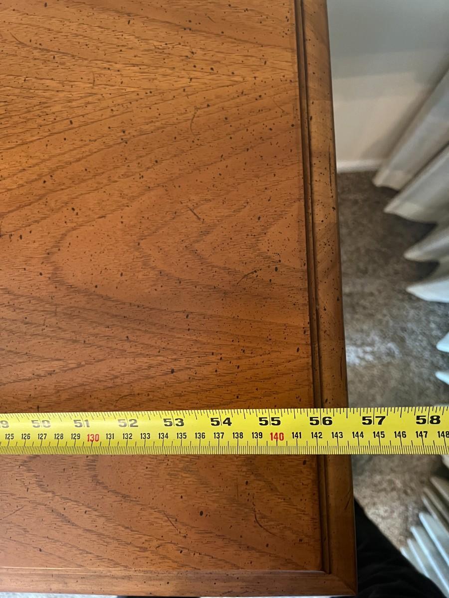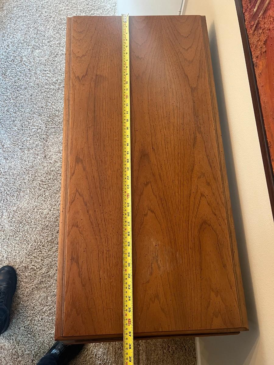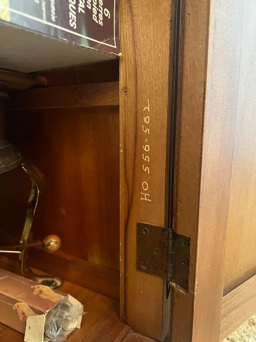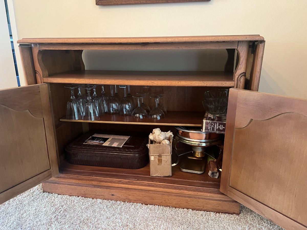 See pictures for dimensions. There is some light vintage wear to the wood, but there is no significant damage, and is in overall good displayable and useable condition. Check pictures for more details and for sizing. The items inside the cabinet DO NOT come with the cabinet. See other auction items for matching pieces.