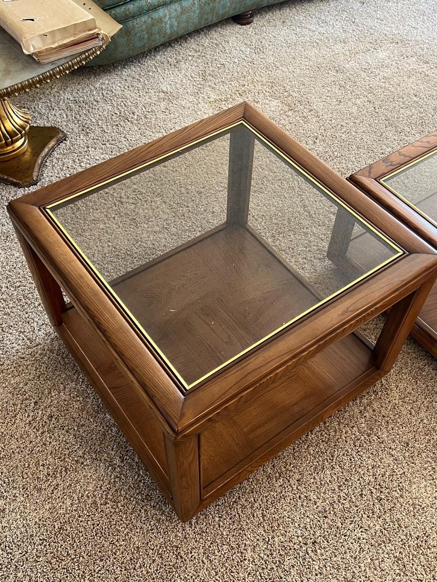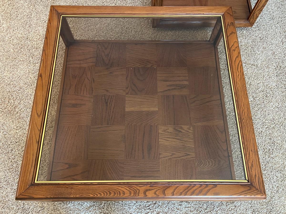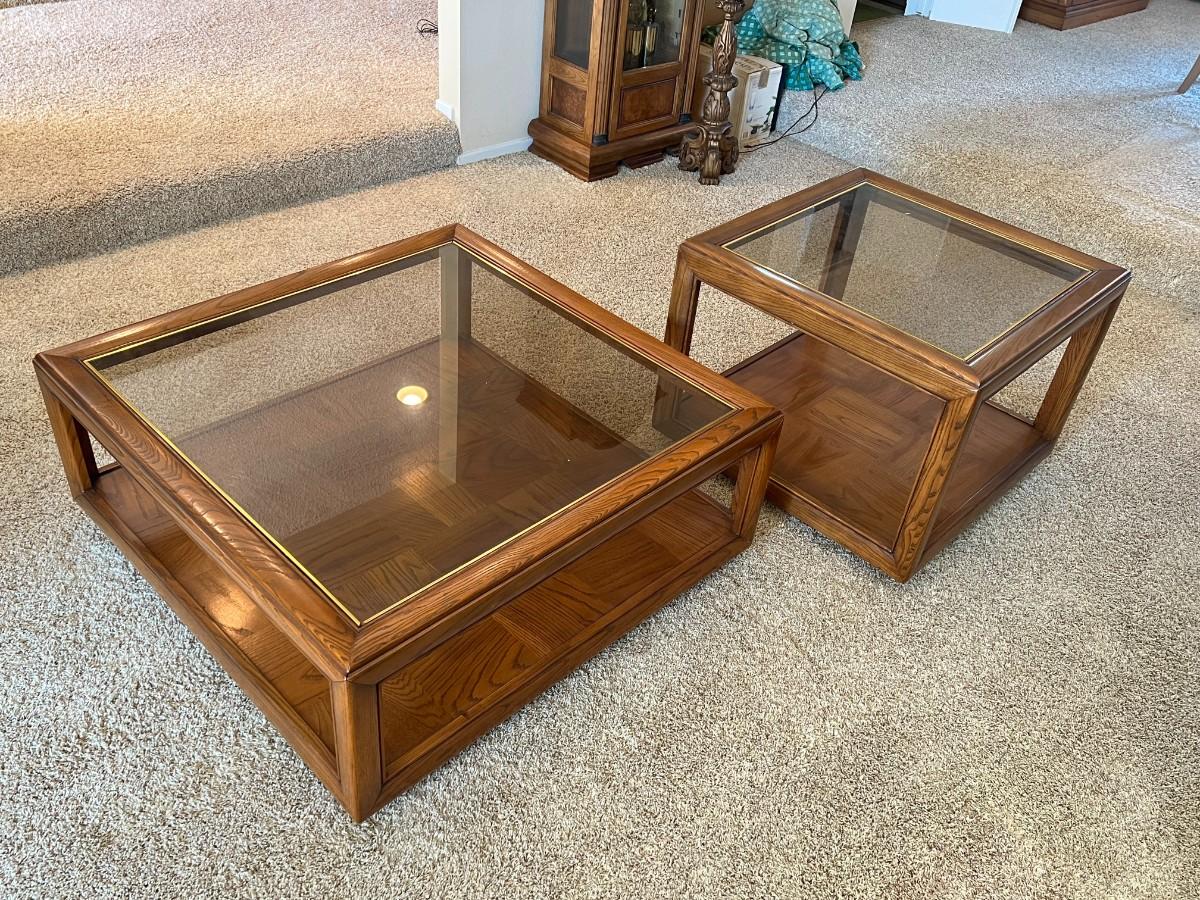 Vintage Mid-Century Modern Two Tier Shelf Wood Glass Top Square Coffee Table & Matching Side Table