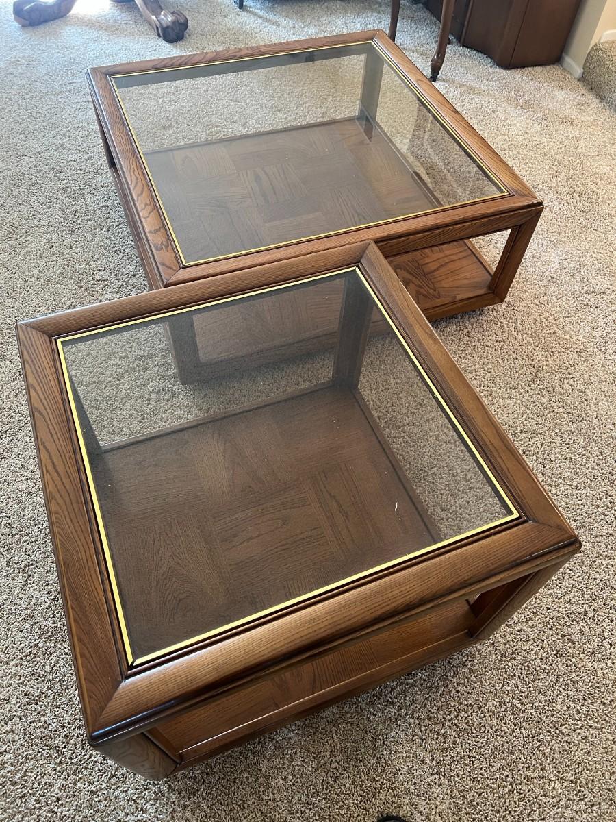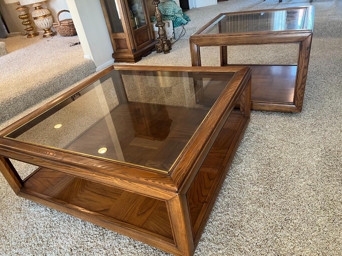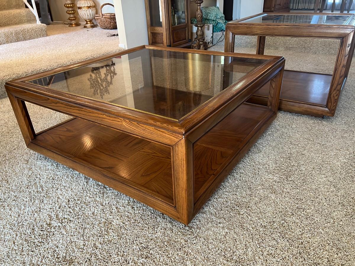 Vintage Mid-Century Modern Two Tier Shelf Wood Glass Top Square Coffee Table & Matching Side Table