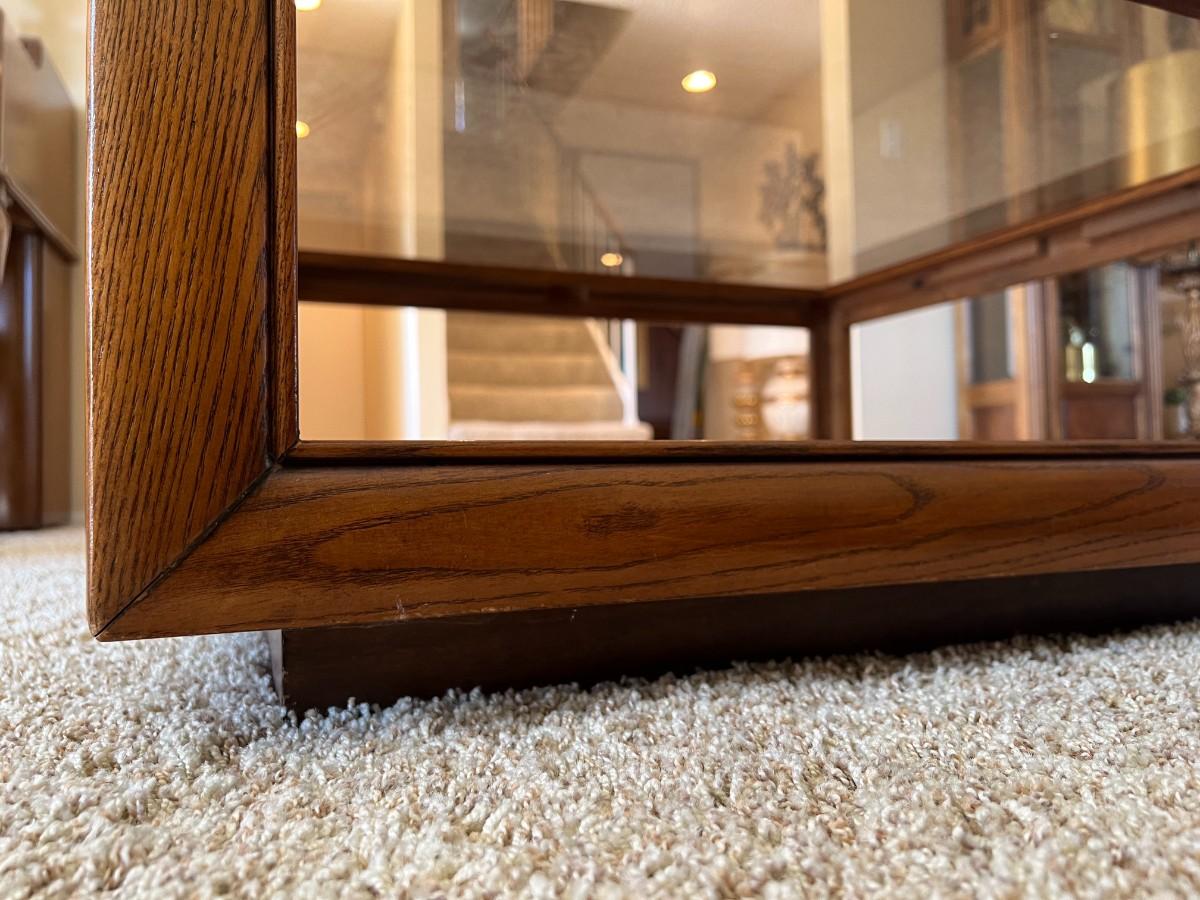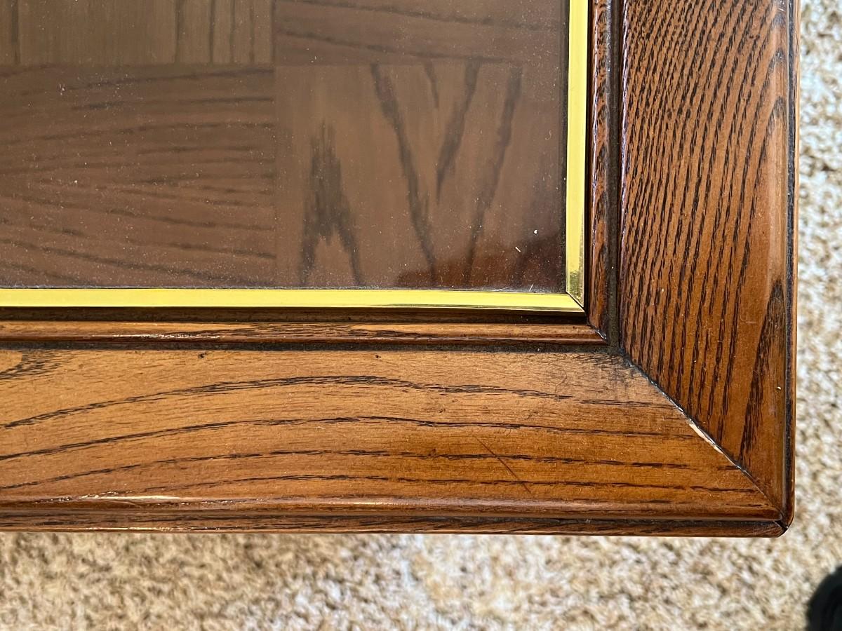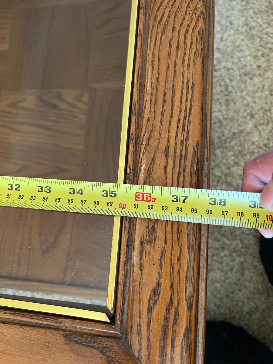 There is no significant damage to the glass or the wooden frame and is in overall good displayable and useable condition. Check pictures for more details and for sizing.