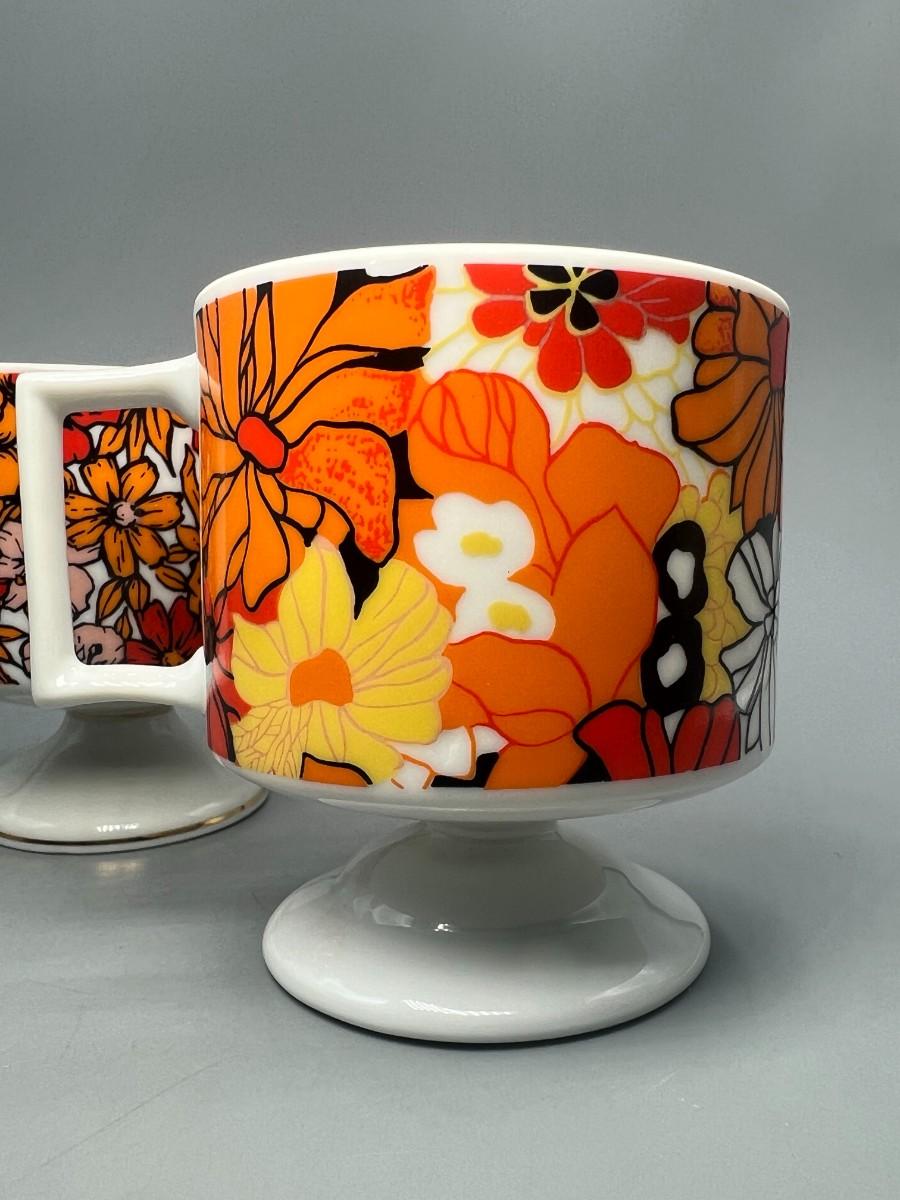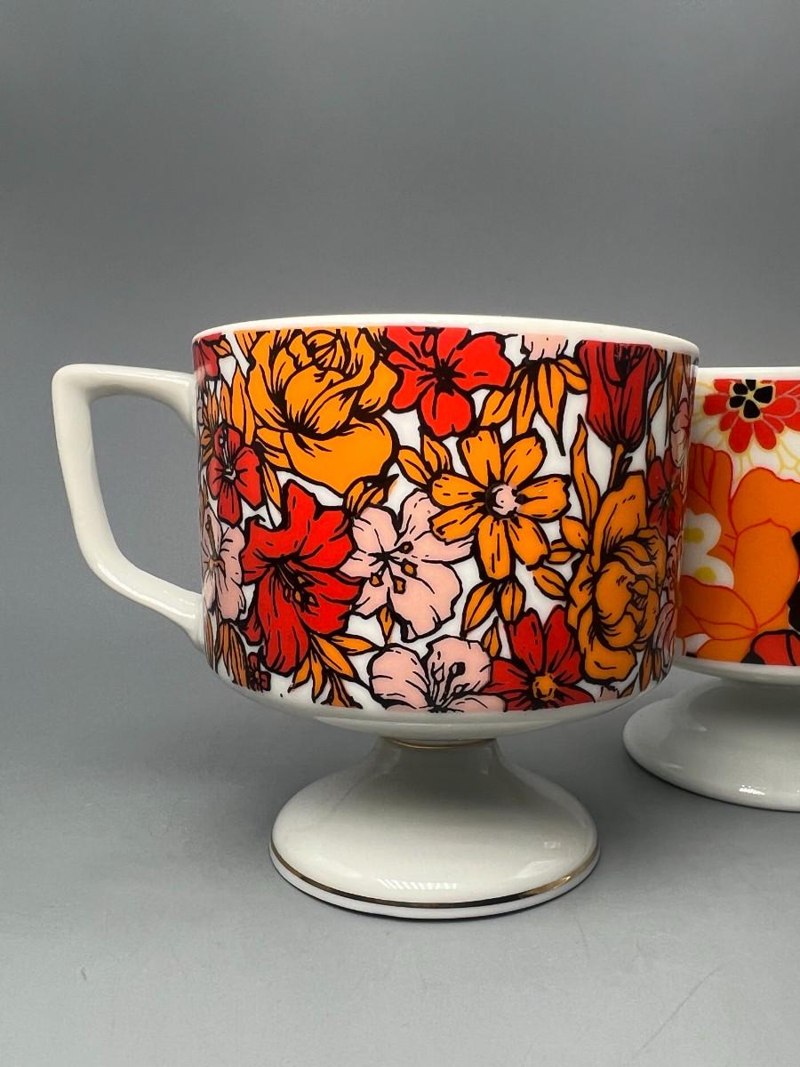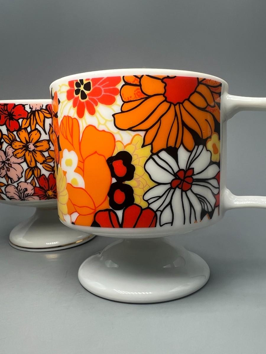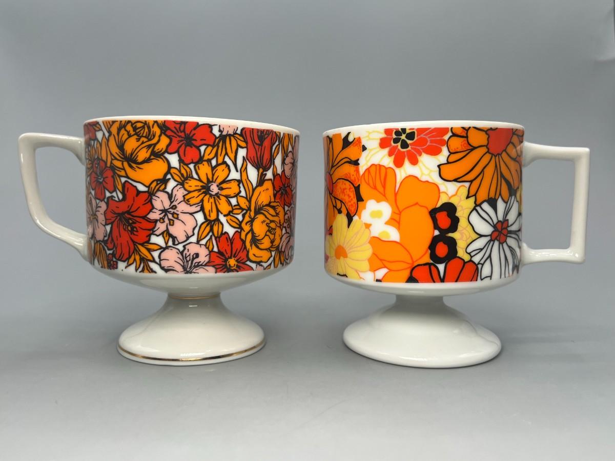 Vintage Hippy 1970's Flowers Groovy Similar Design Ceramic Drinking Cups Pedestal Coffee Mugs