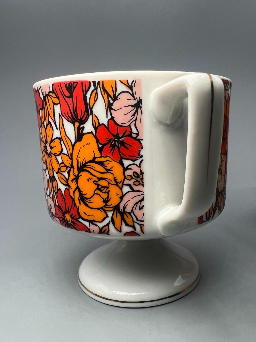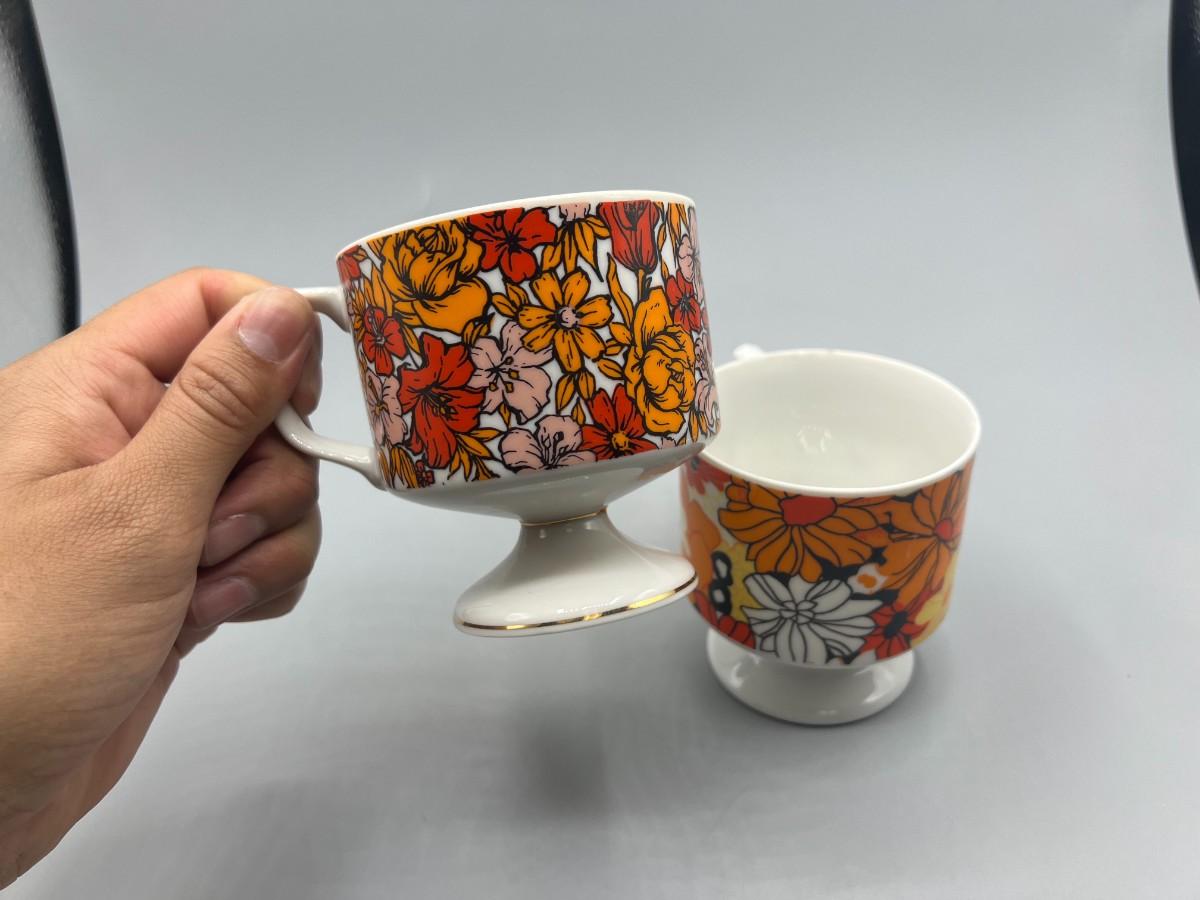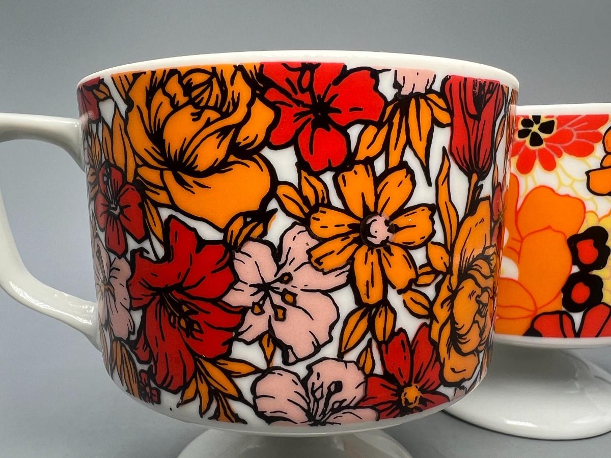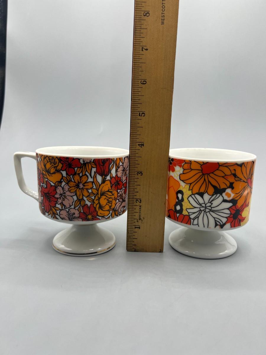 Vintage Hippy 1970's Flowers Groovy Similar Design Ceramic Drinking Cups Pedestal Coffee Mugs