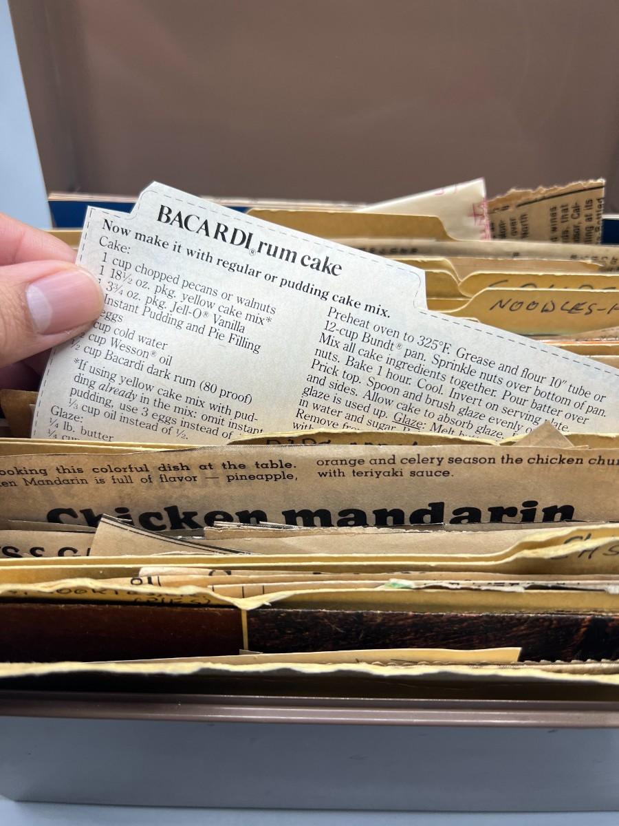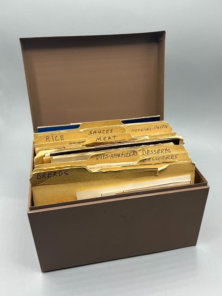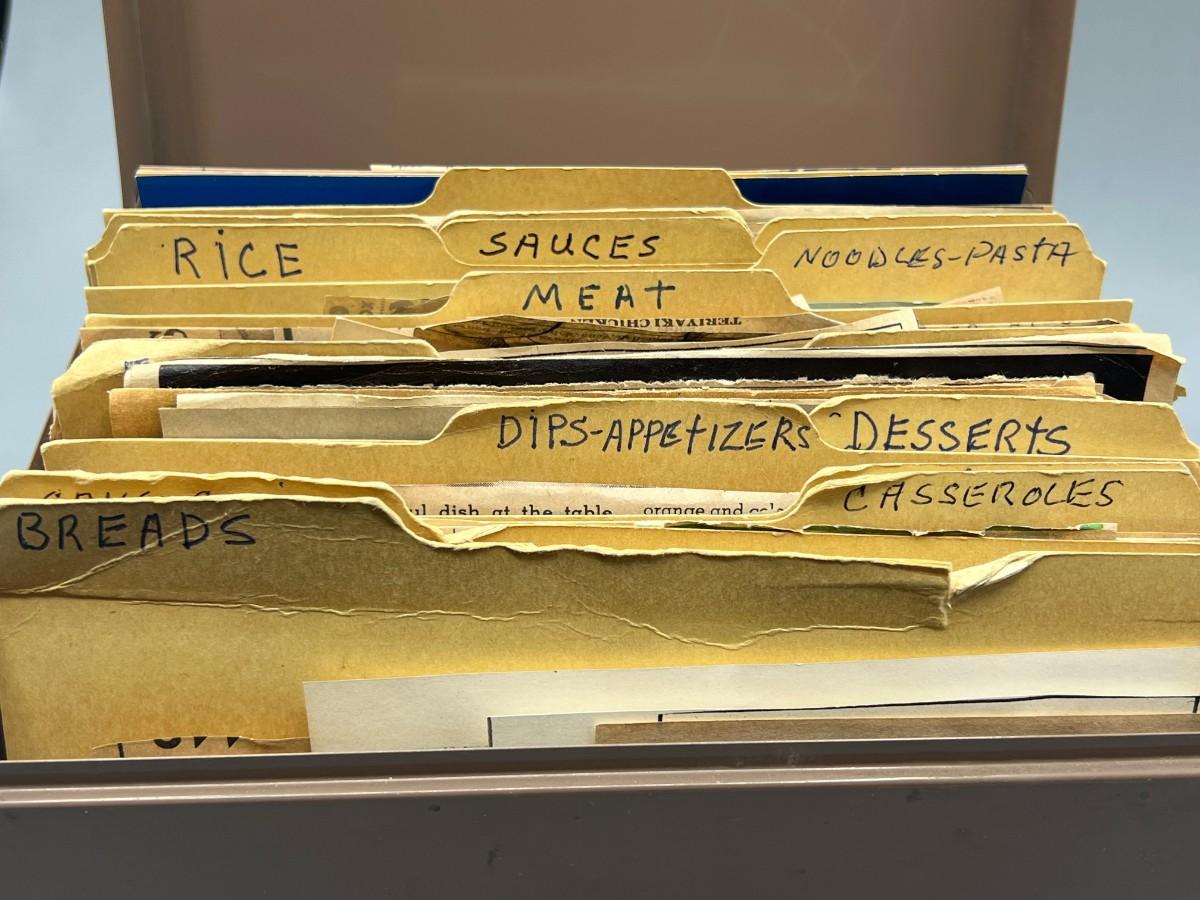 There is no significant damage to the metal file organizer and is in overall good useable or collectible condition. Recipes are either handwritten or cut from newspapers, magazines & more.