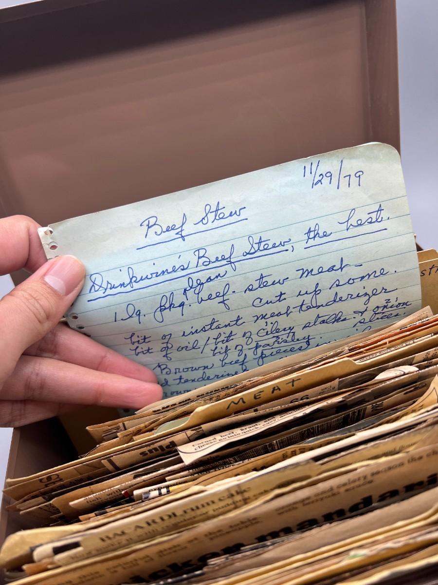 Vintage Lit-Ning Metal Index File Organizer with Clipped & Handwritten Food Recipes
