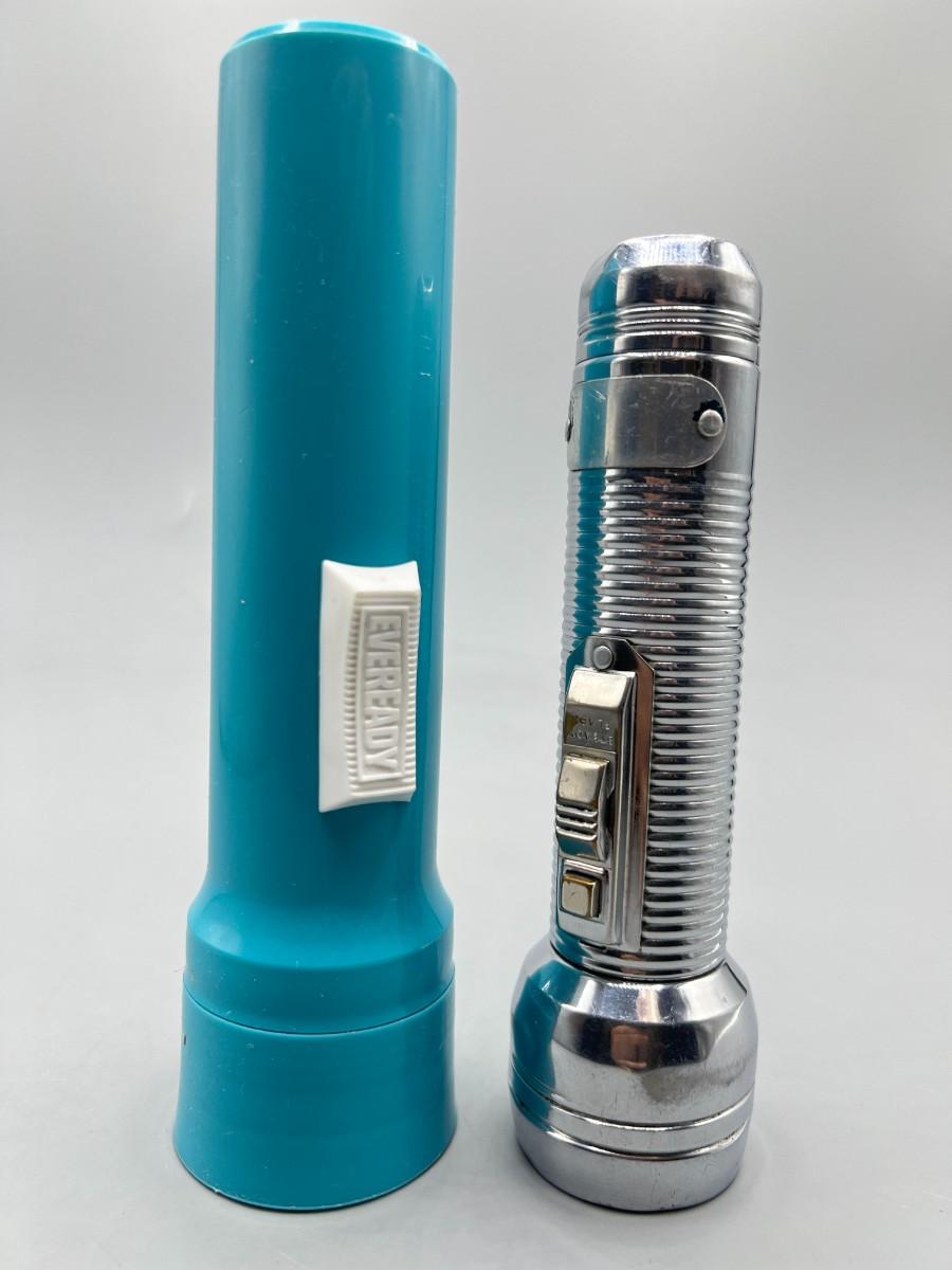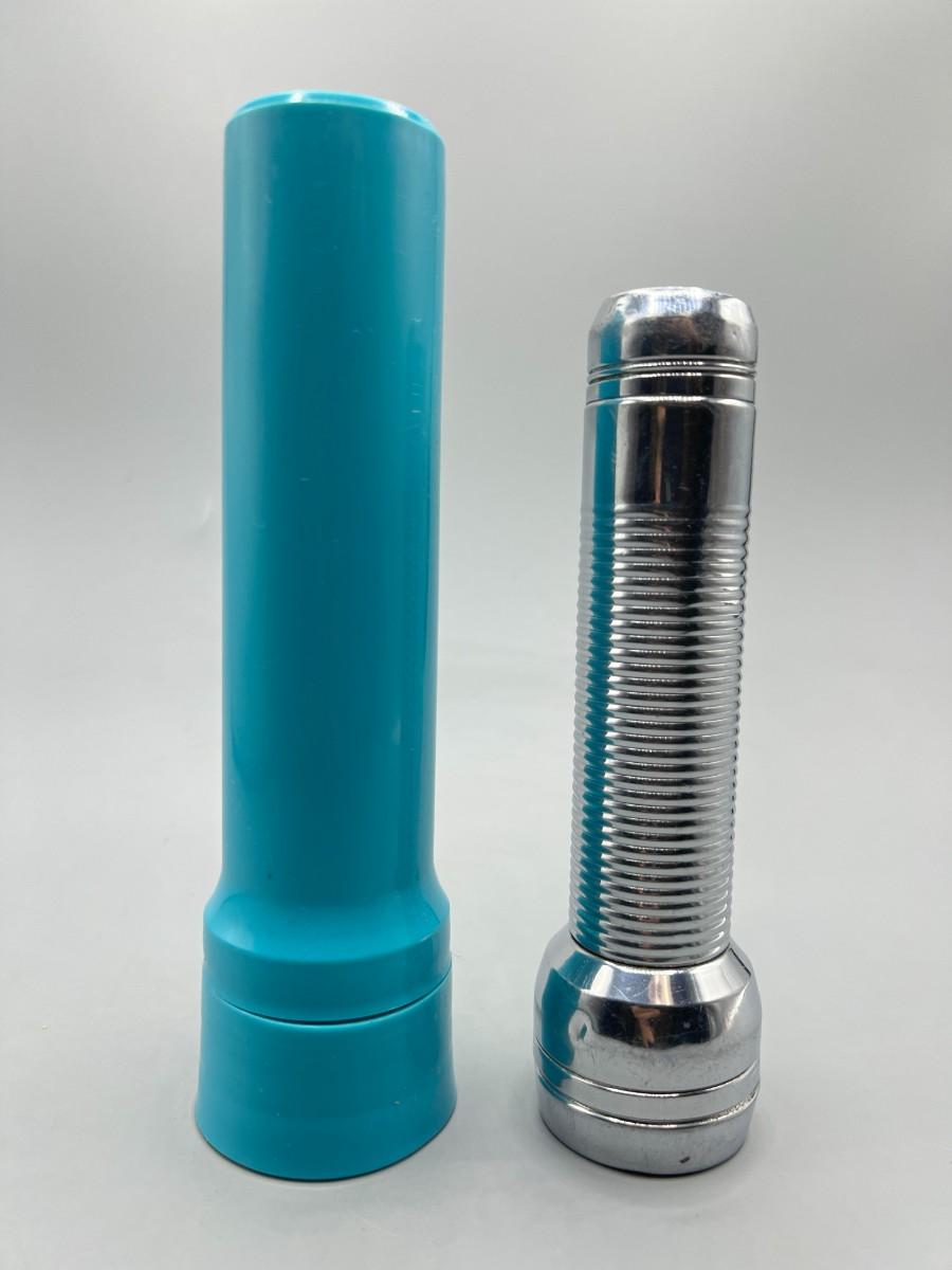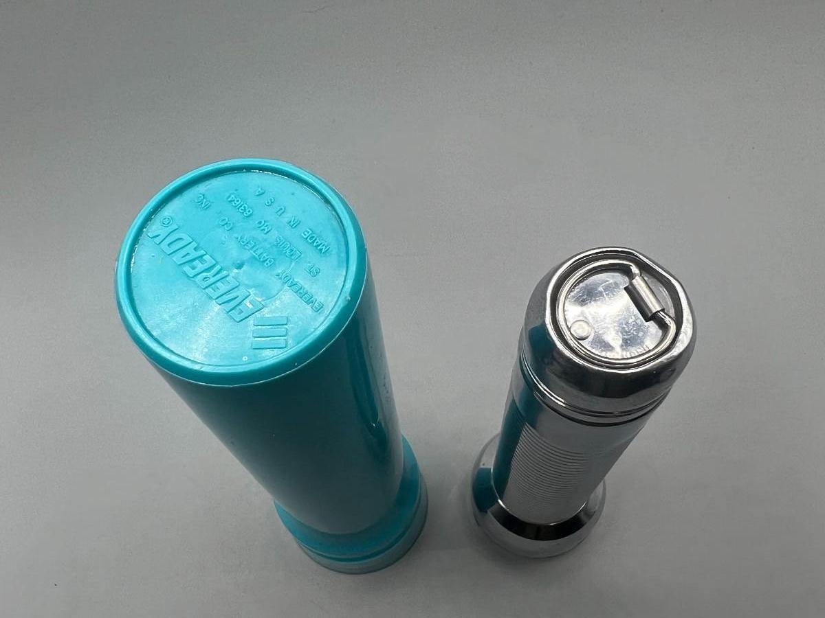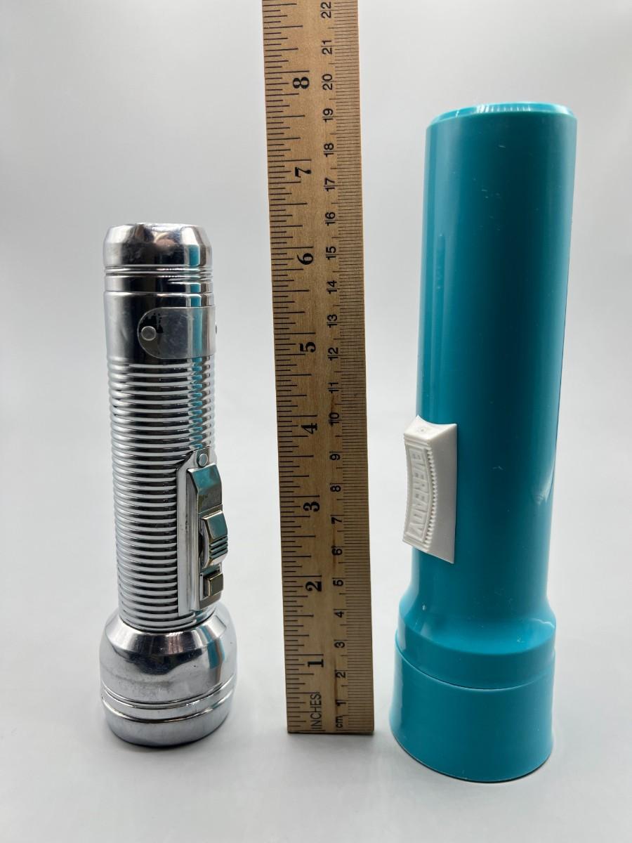 There is some light wear to both of the flashlights, the teal flashlight turns on and works, the silver flashlight does not have a bulb and does not work. Check pictures for more details and for sizing.