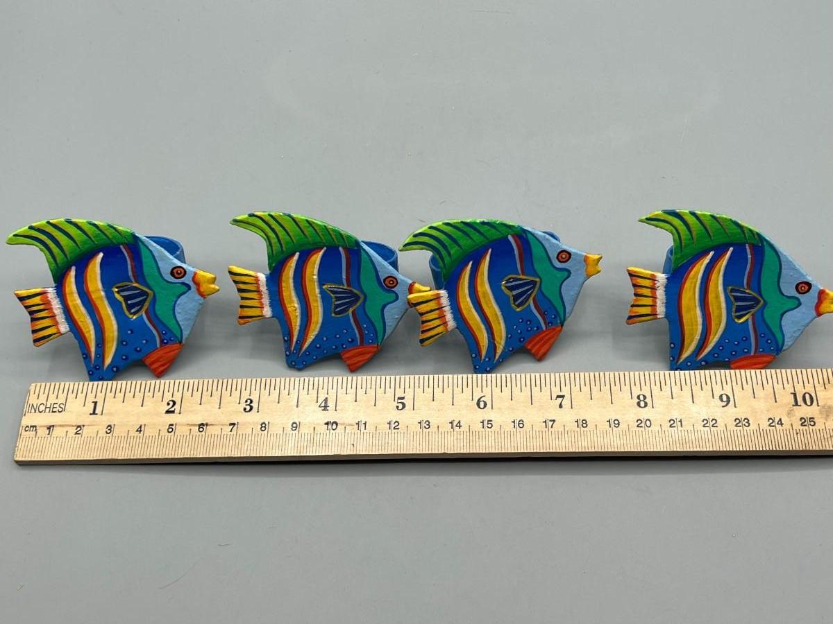 Set of 4 Colorful Painted Wood Tropical Fish Napkin Holder Rings. Matching set of cute tropical fish. Goos previously used condition.
