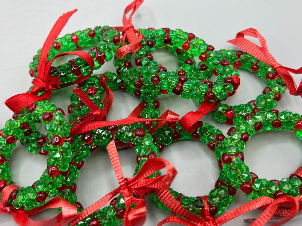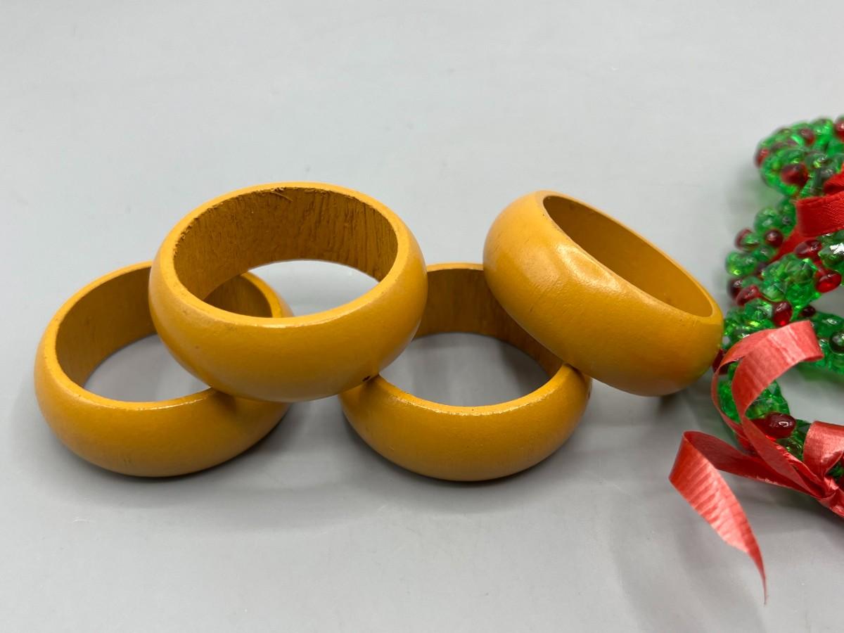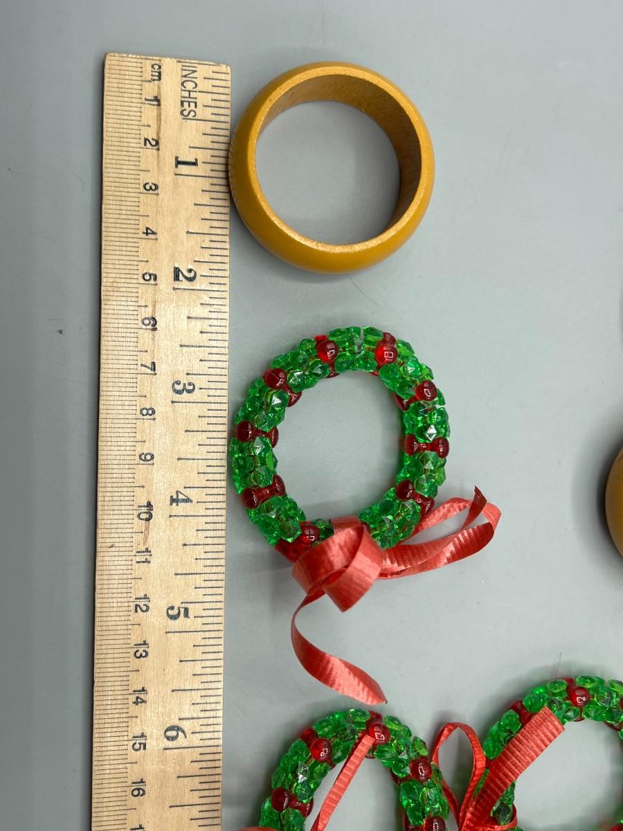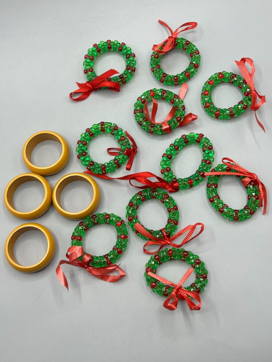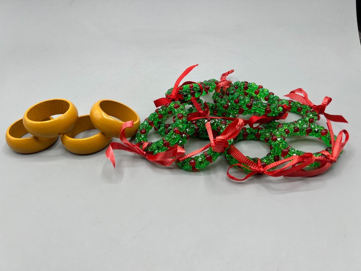 Two Sets of Napkin Holder Rings Wood & Christmas Holiday Beaded Wreathes. Good used condition. 4 wood, 10 Christmas.