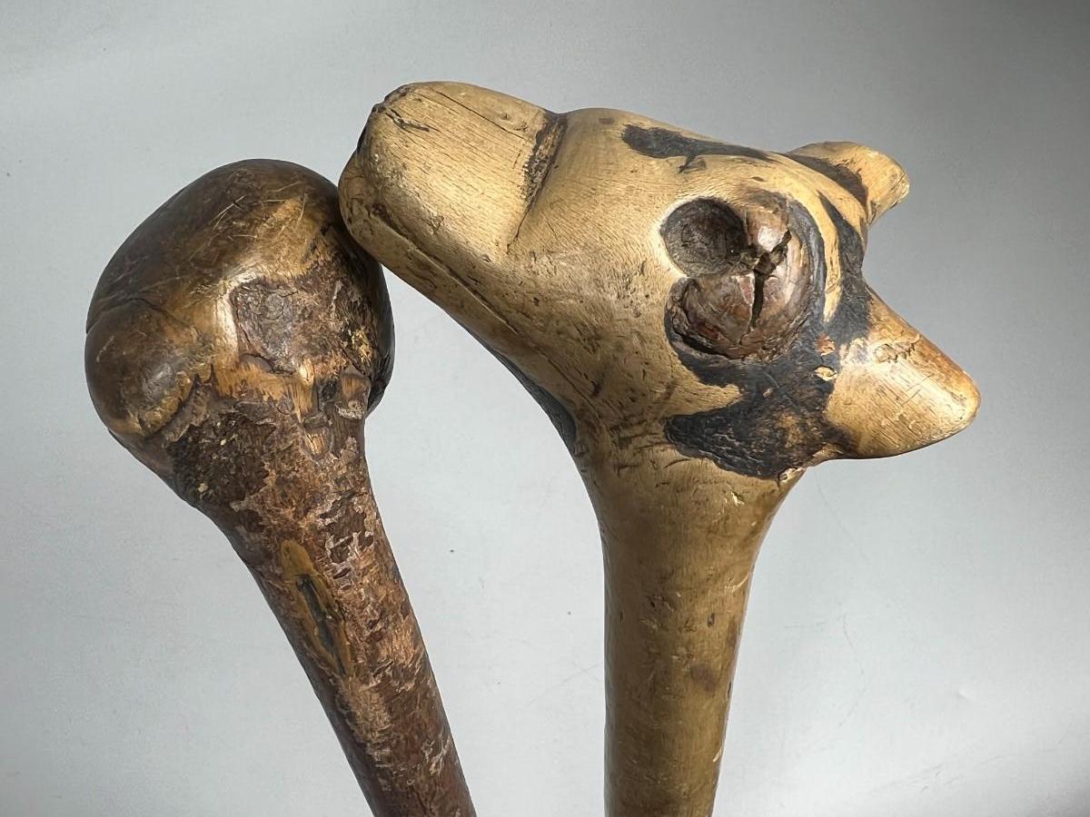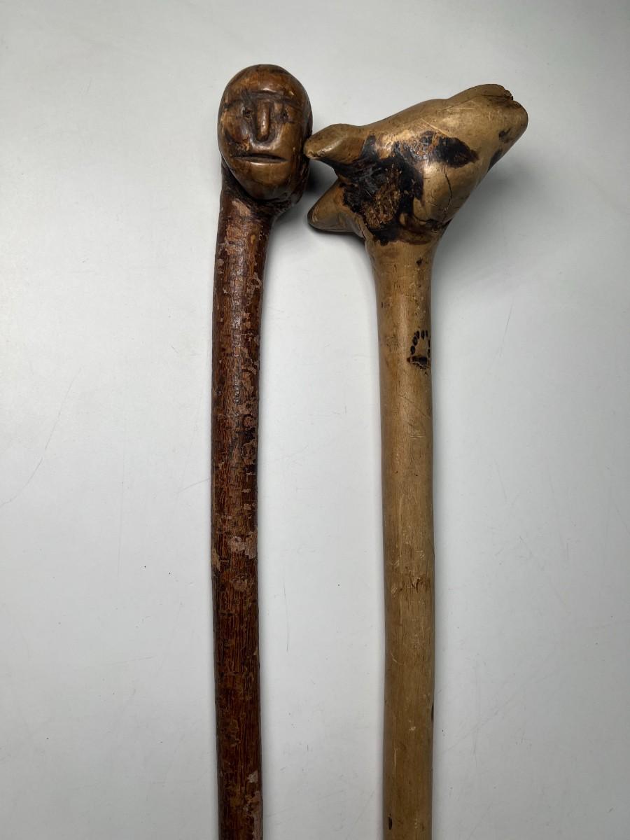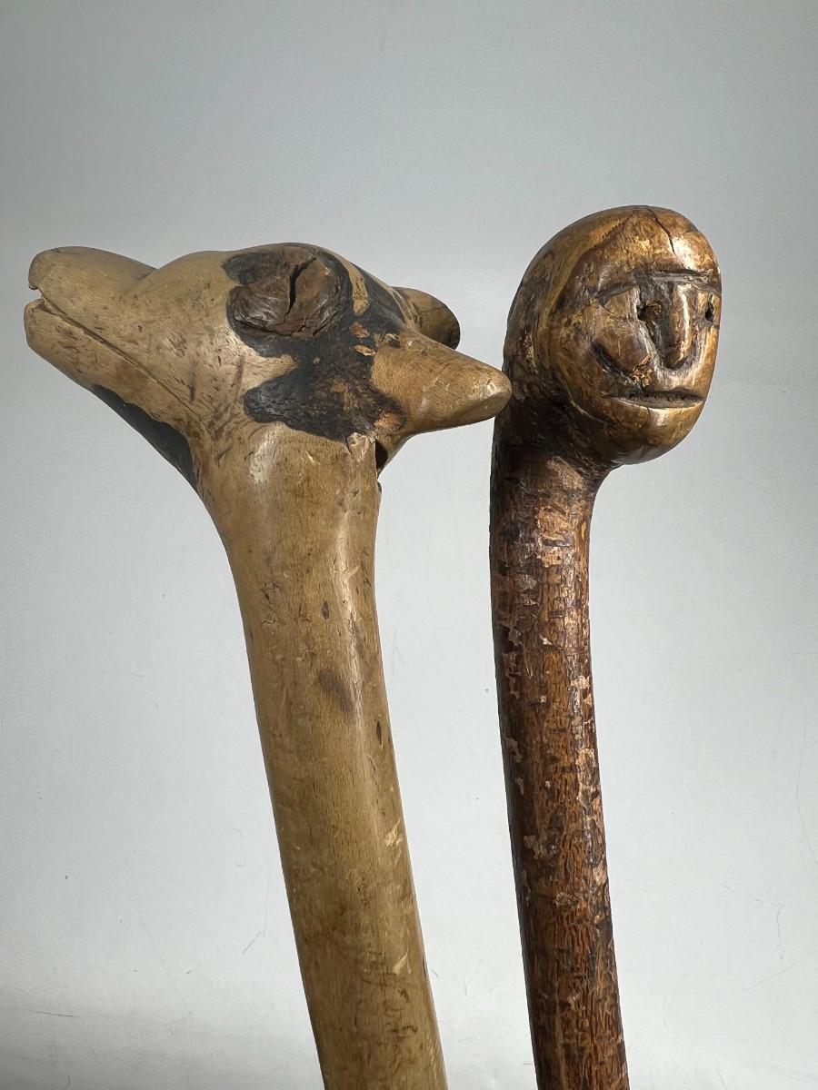 Pair of Vintage Carved Wooden Face & Animal Folk Art Walking Sticks
