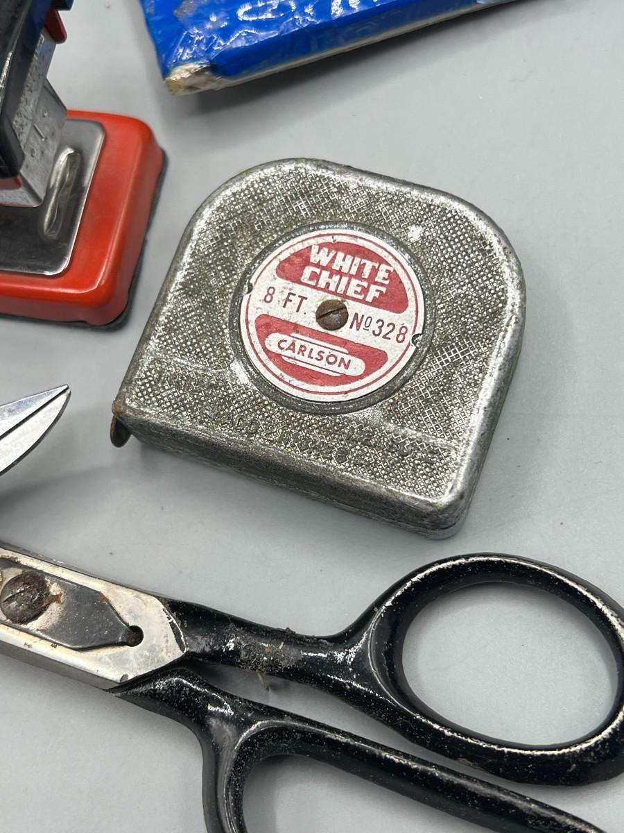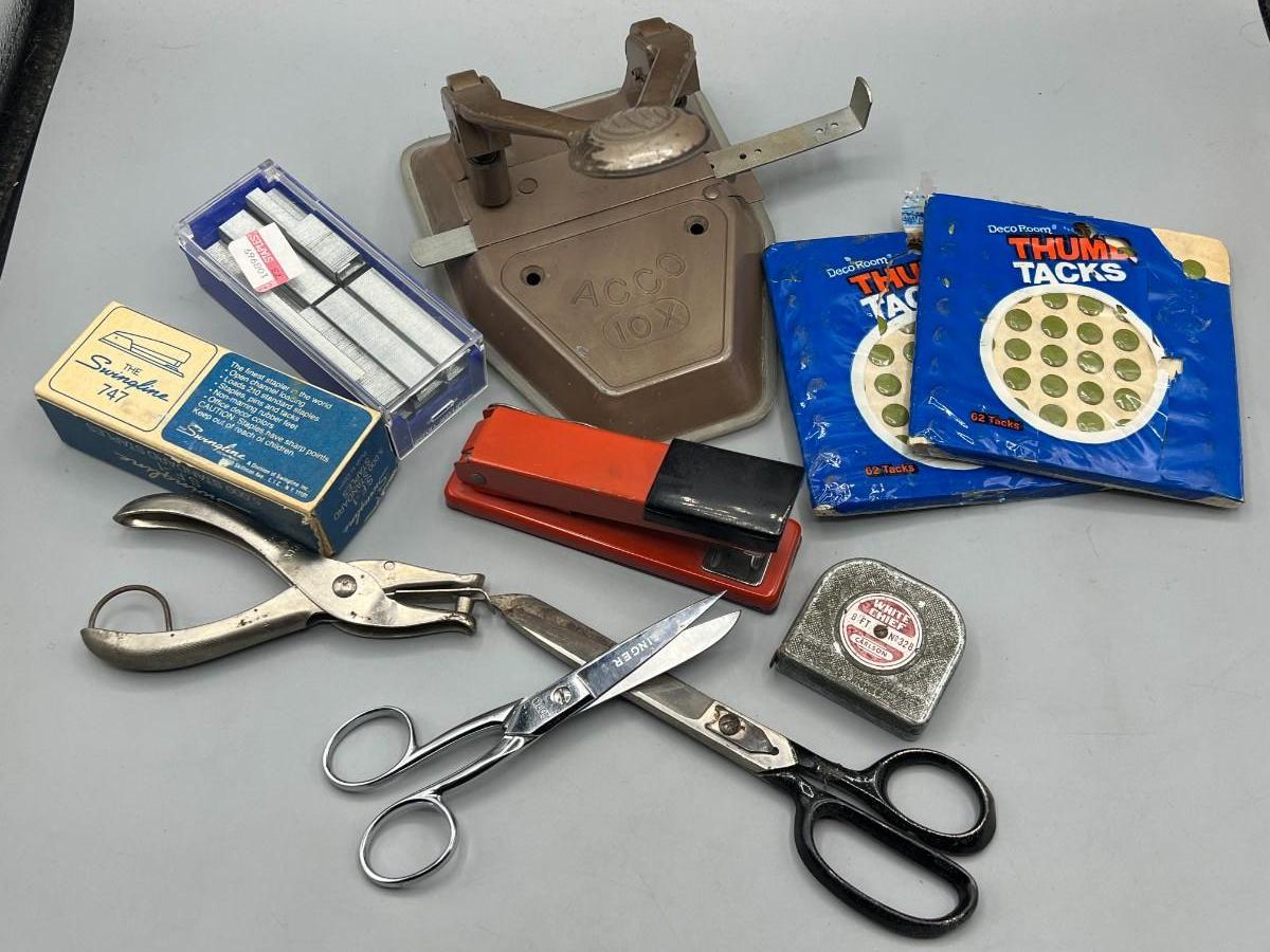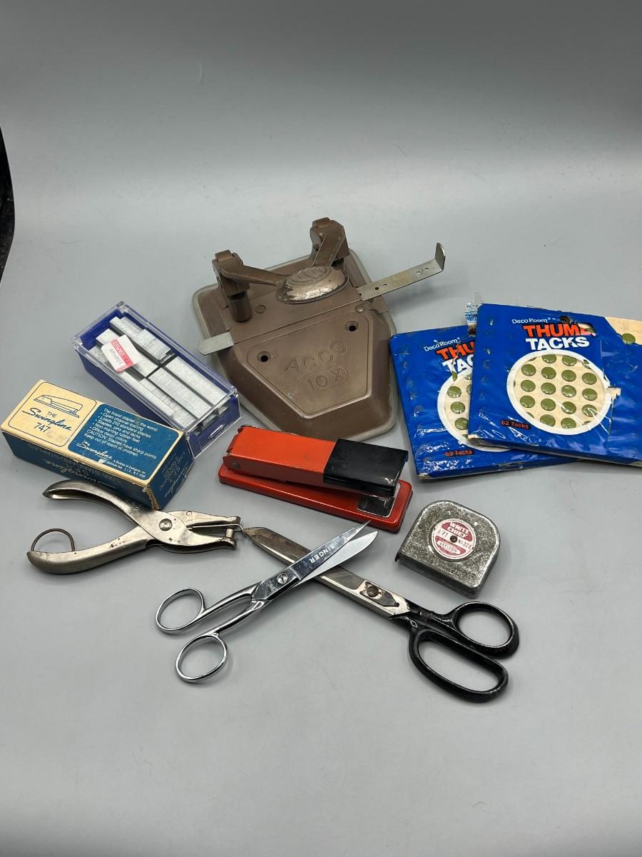 Lot of Vintage Office Tools Adjustable Hole Puncher, Small Tape Measure, Singer Scissors & More