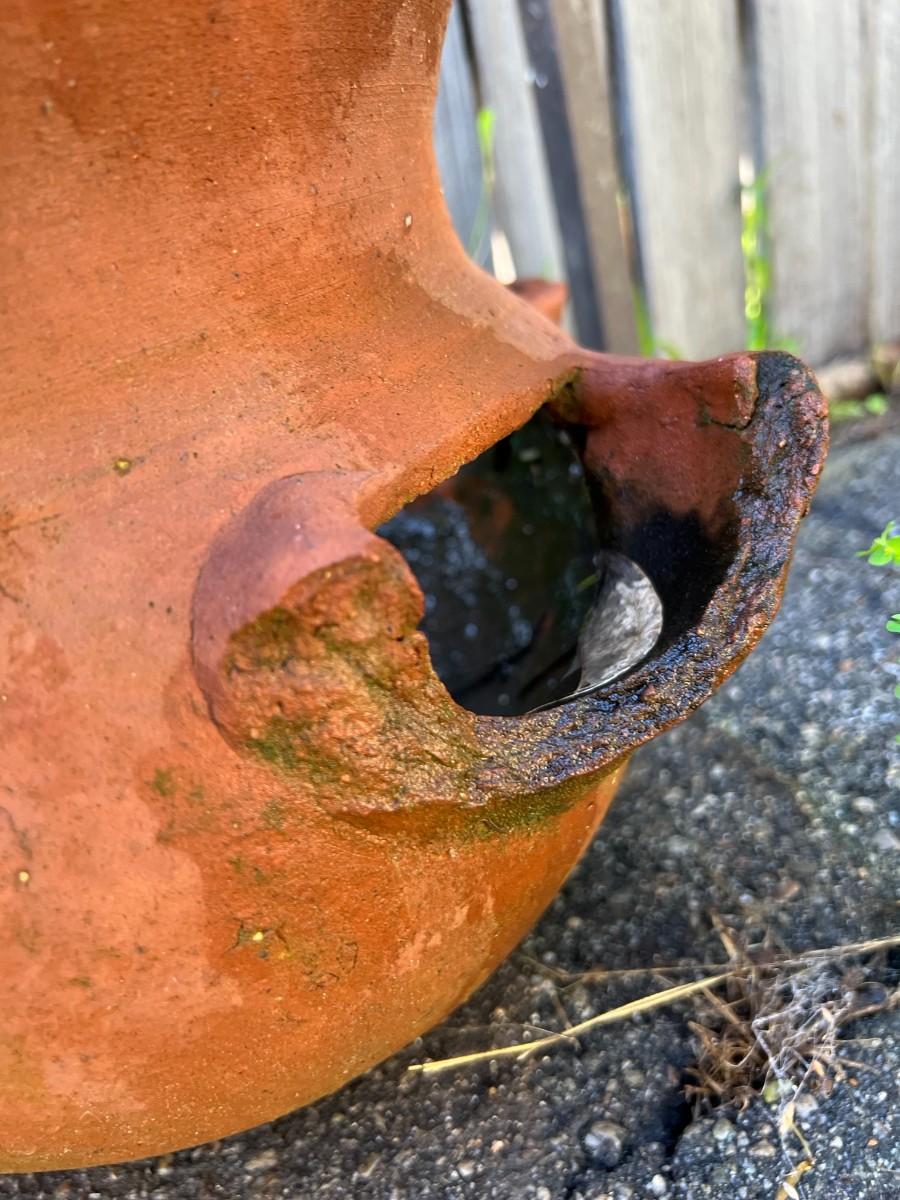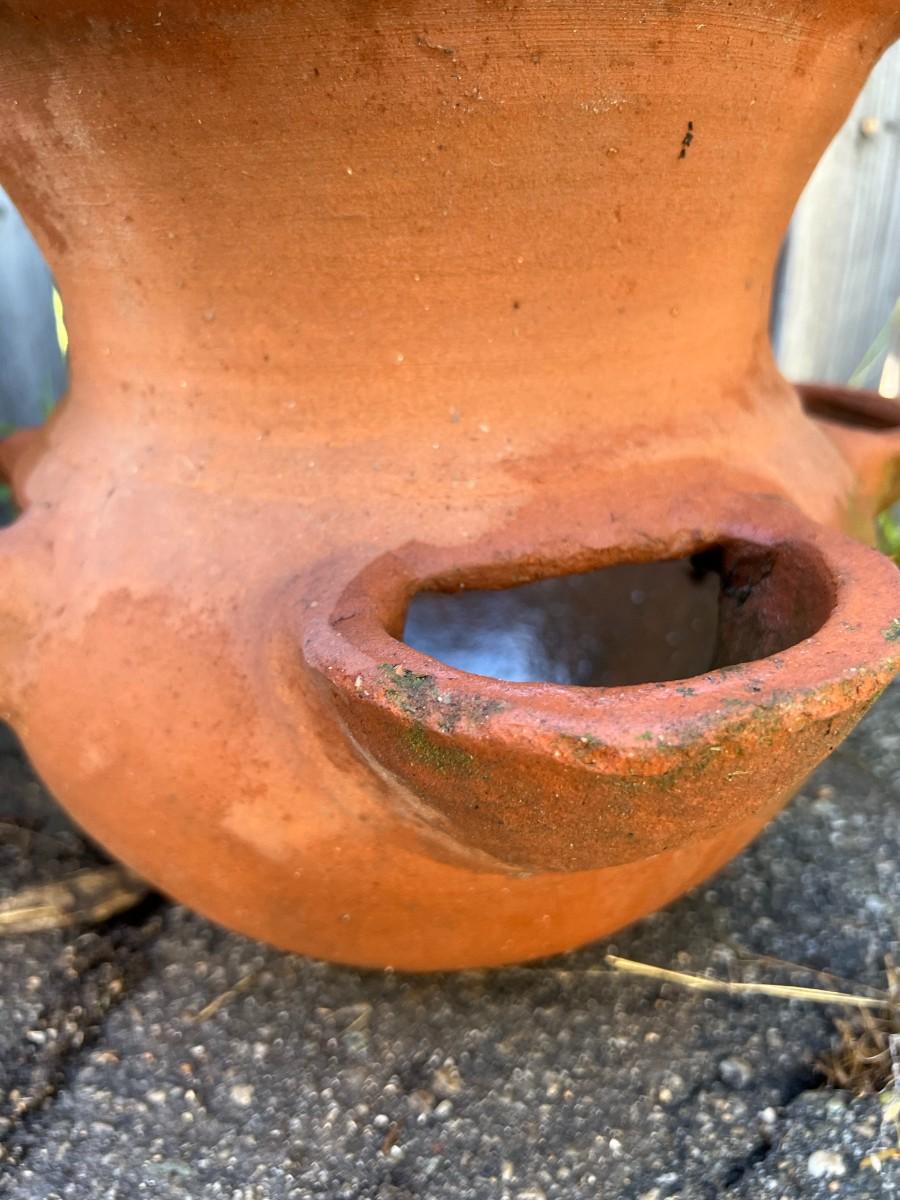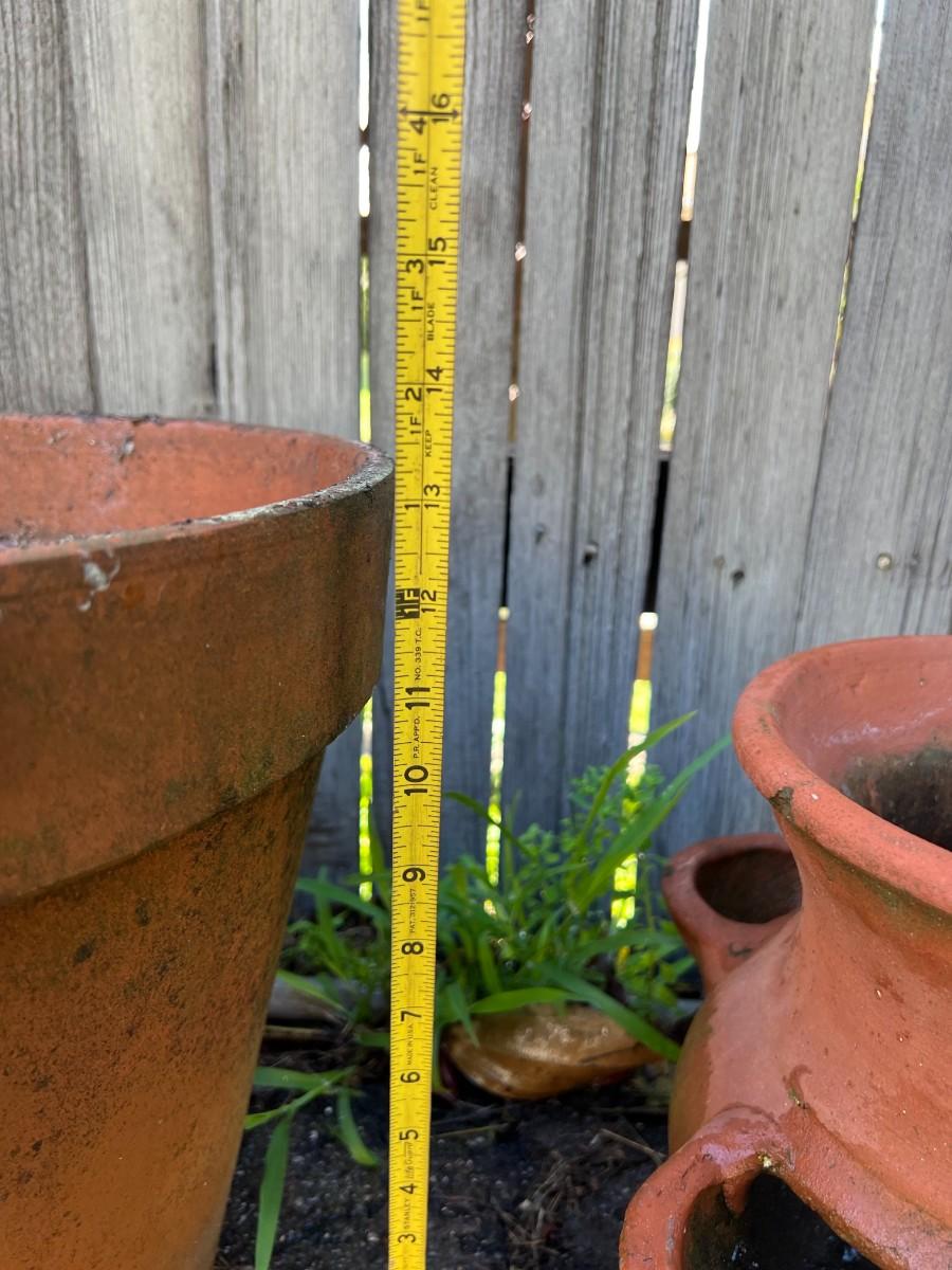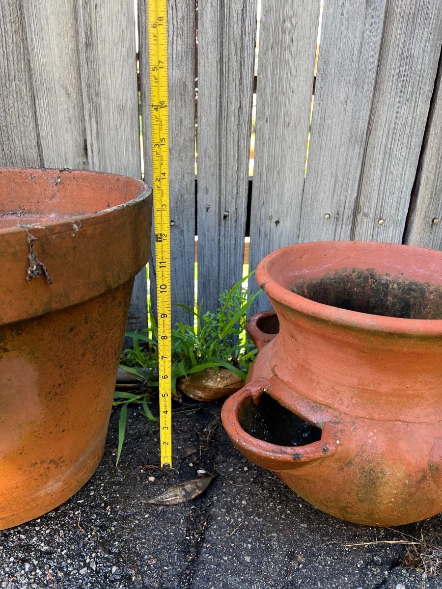 There is some wear to the flower pots, and one has a chip on the lip. There is no other significant damage and is in overall good useable condition. Check pictures for more details and for sizing.