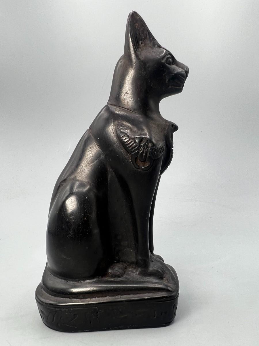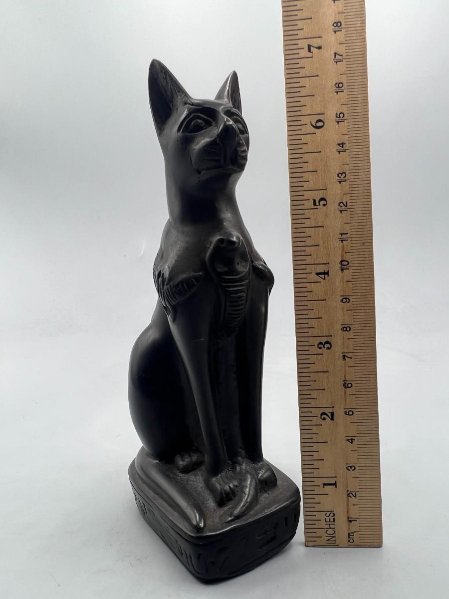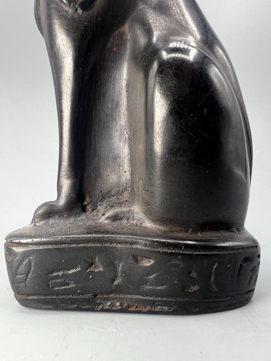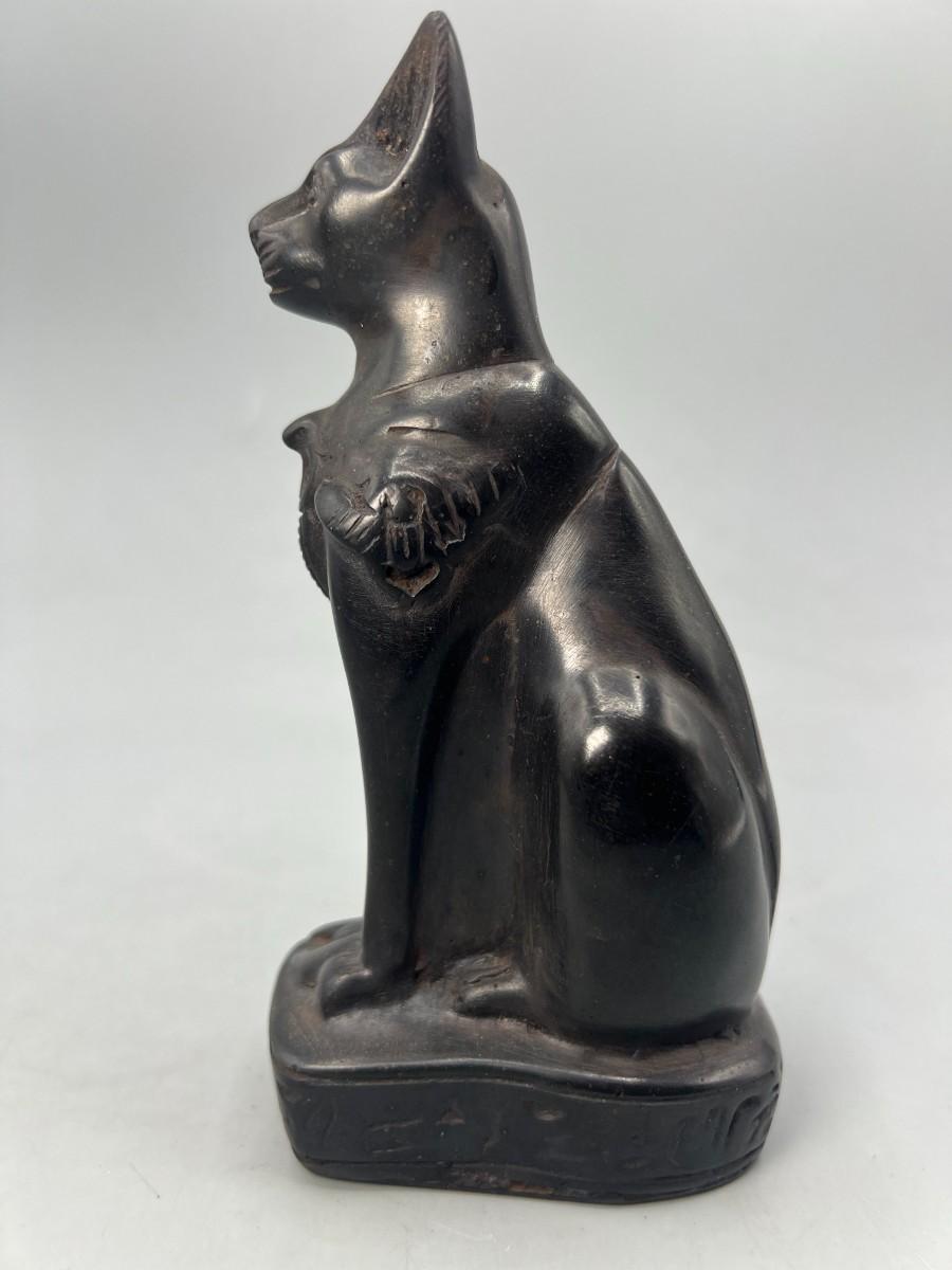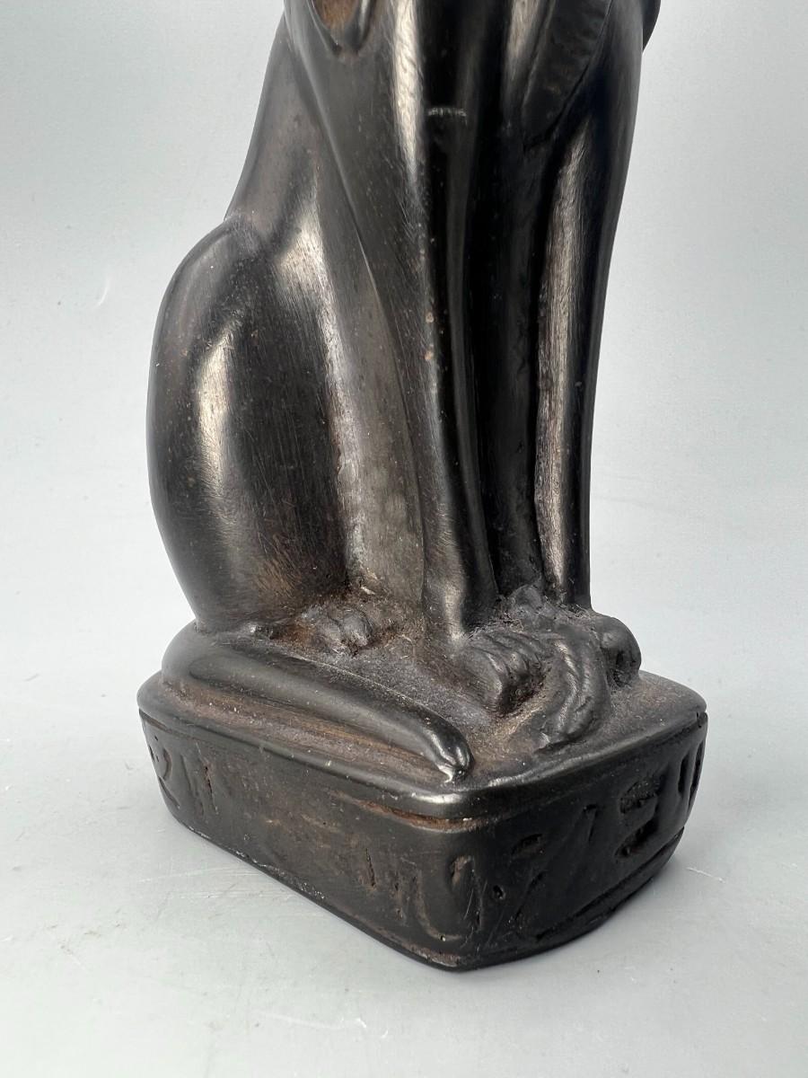 Small Vintage Black Plaster Chalkware Egyptian Hieroglyphic Sphinx Cat Figurine Statue