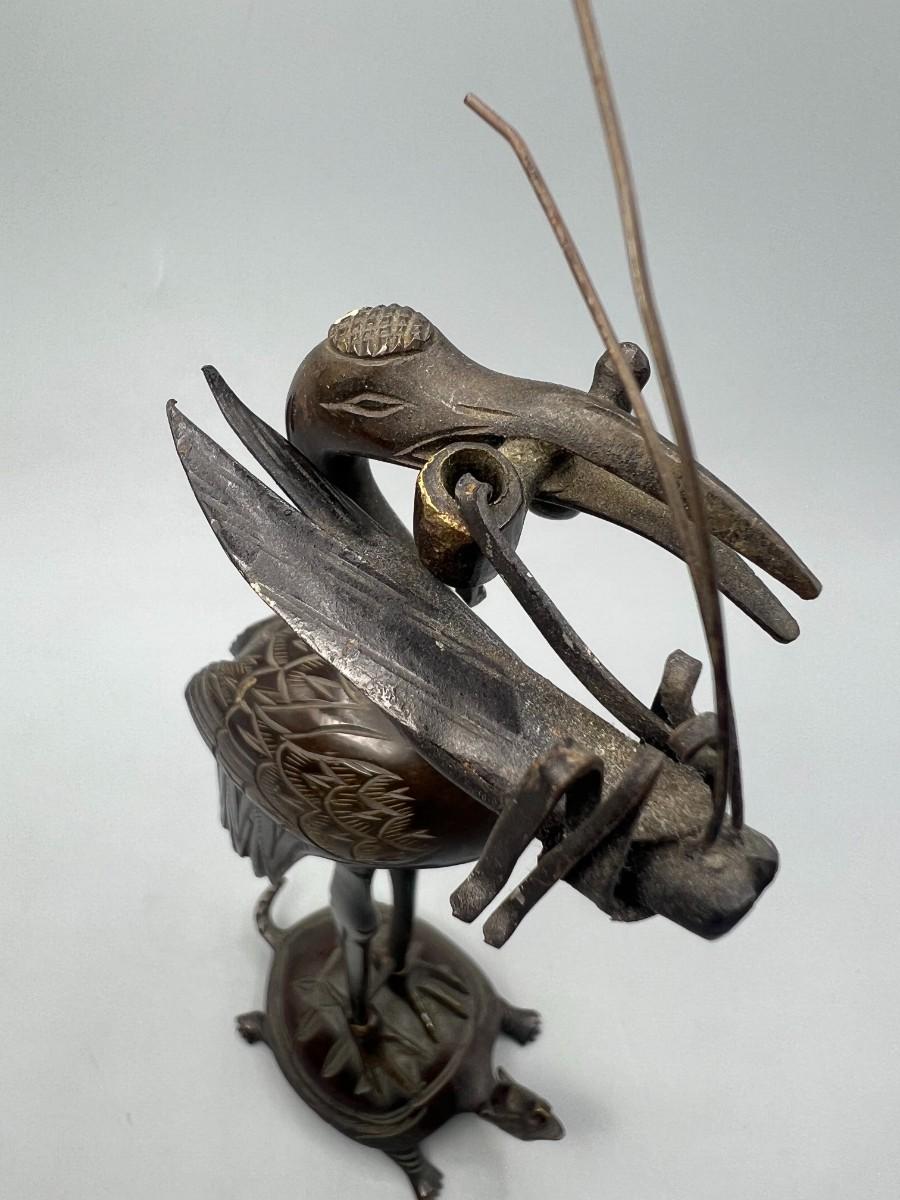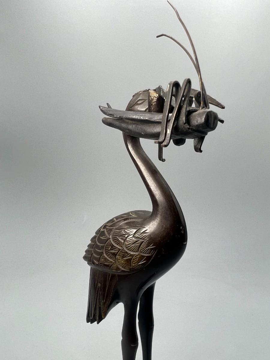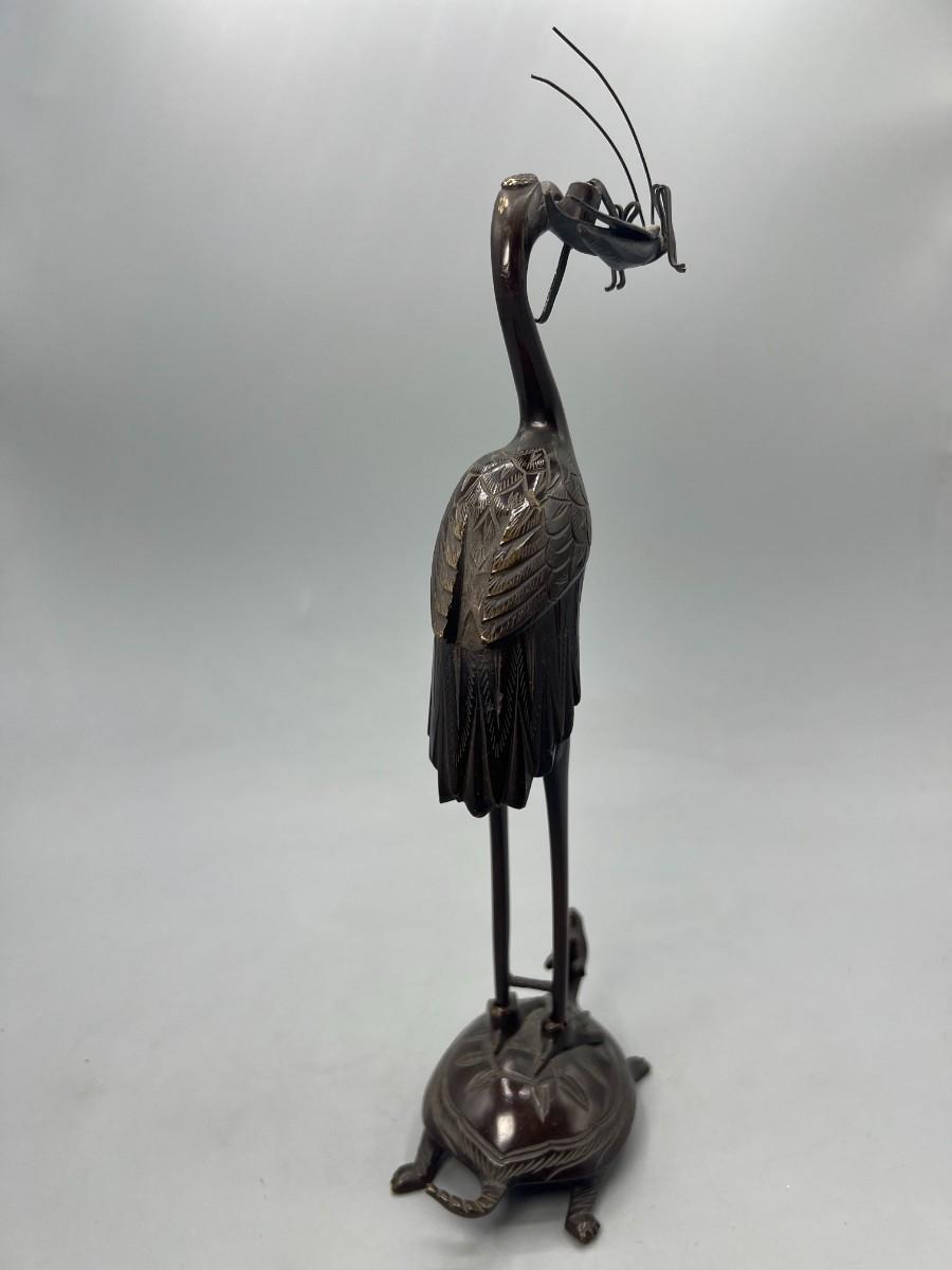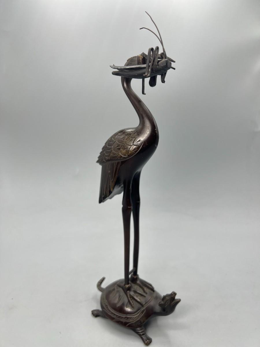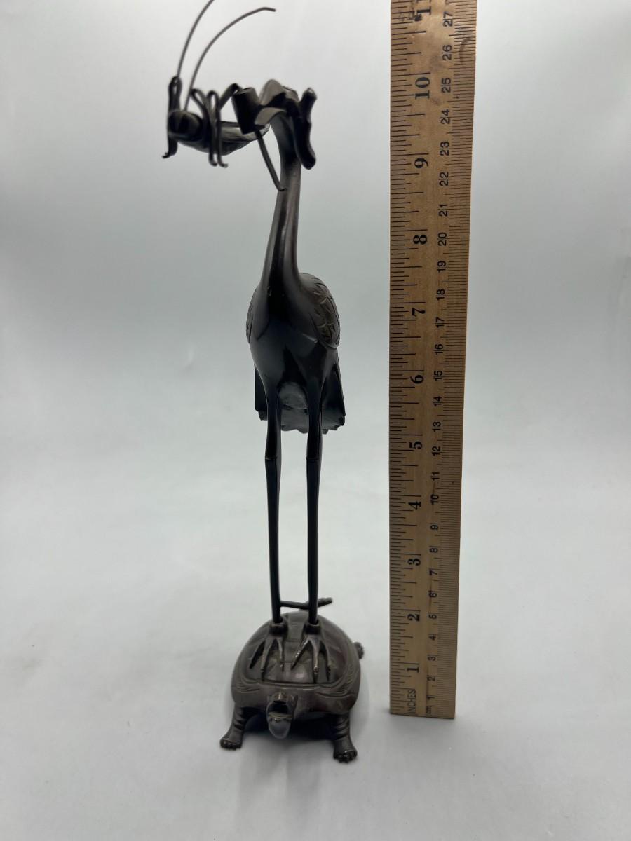 Vintage Metal Bronze Figurine Japanese Figural Art Herron Crane with Cricket on Turtle