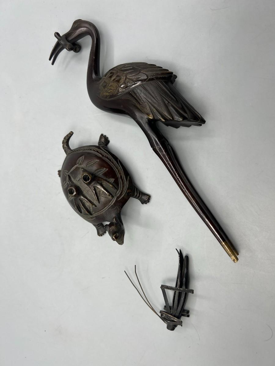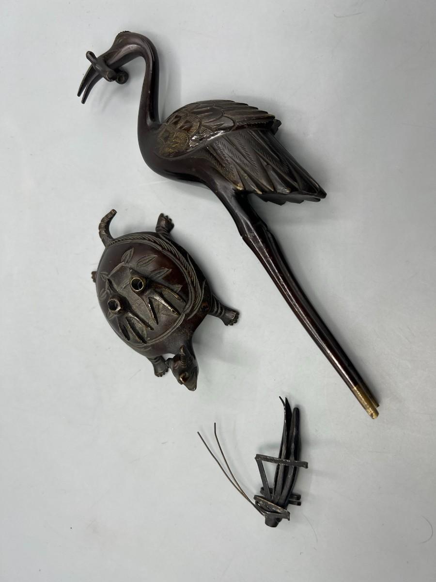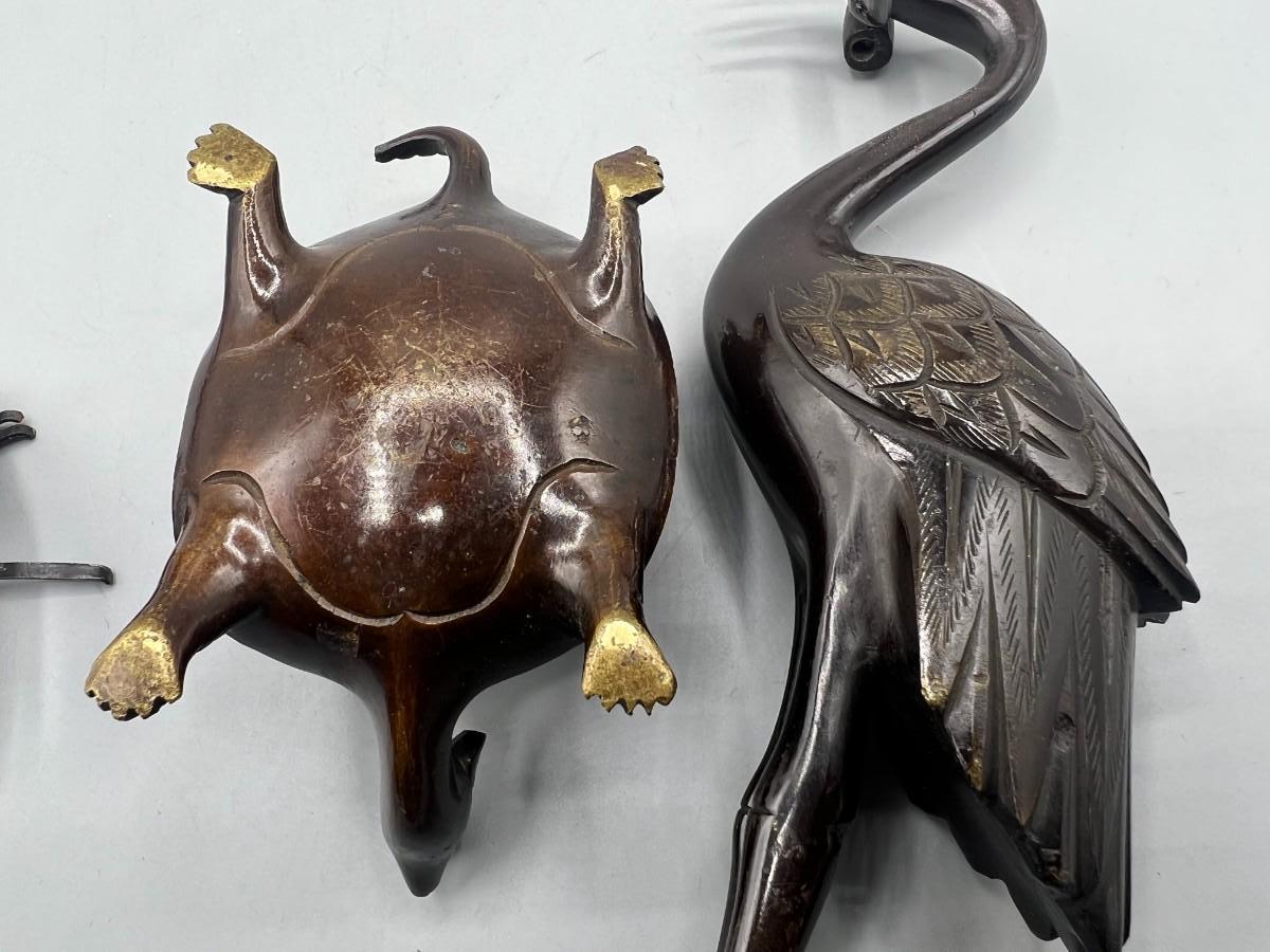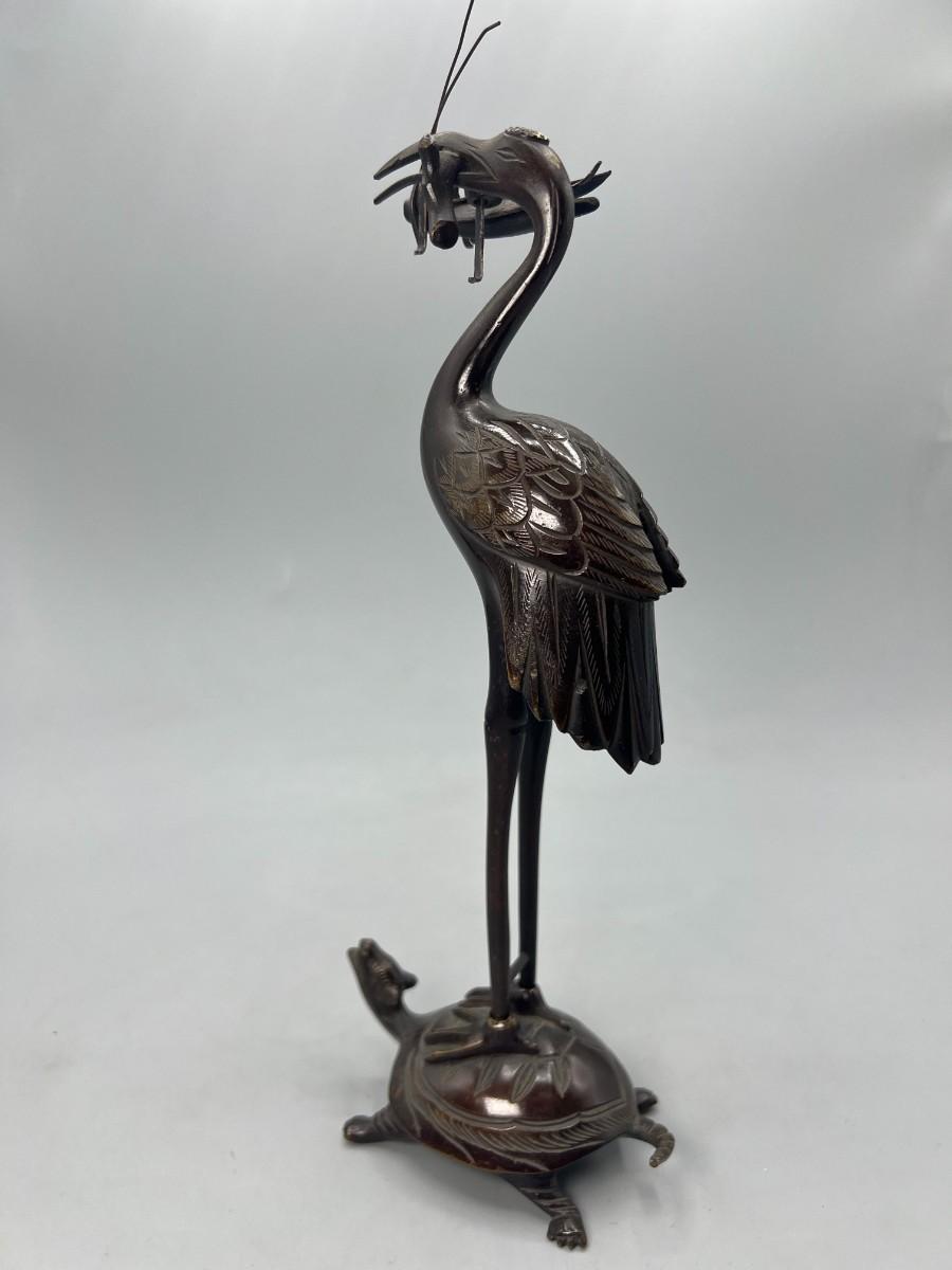 Vintage Metal Bronze Figurine Japanese Figural Art Herron Crane with Cricket on Turtle