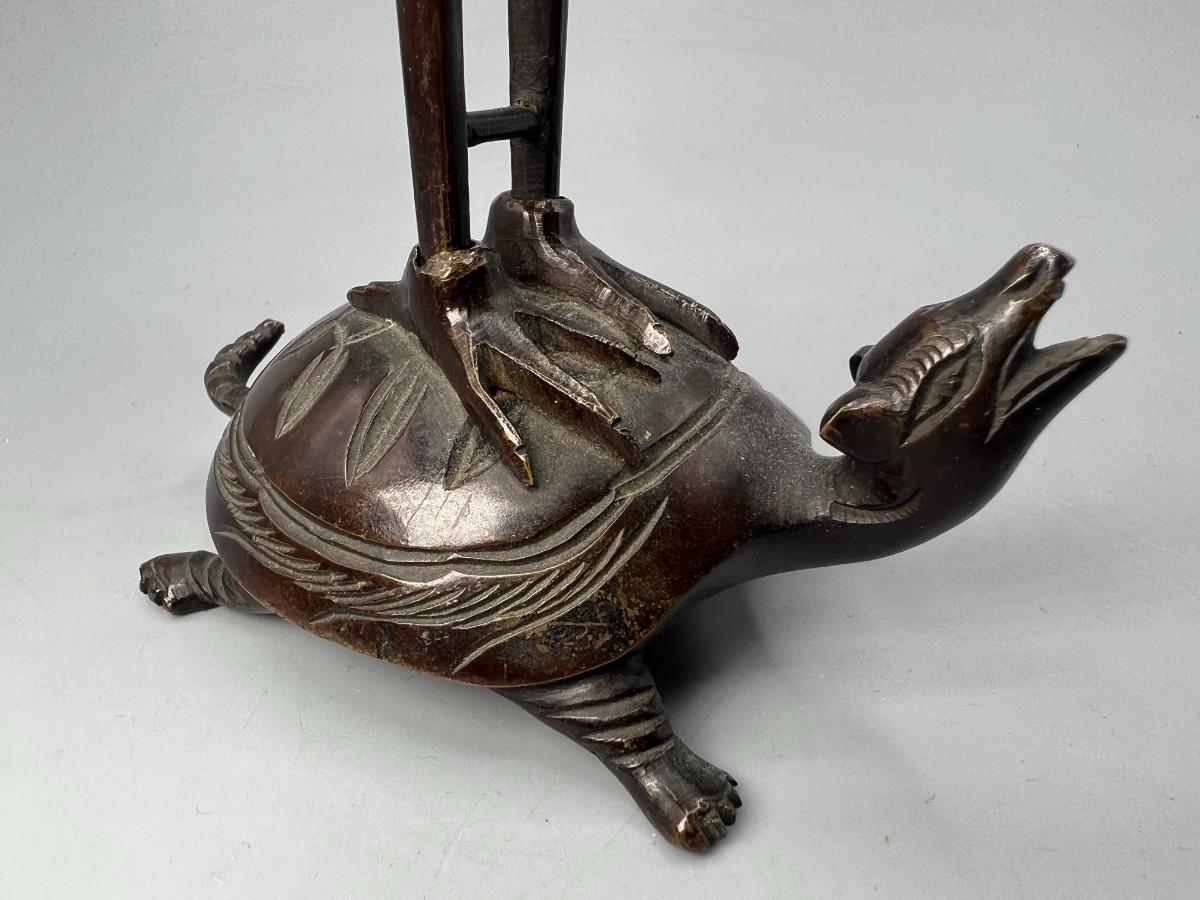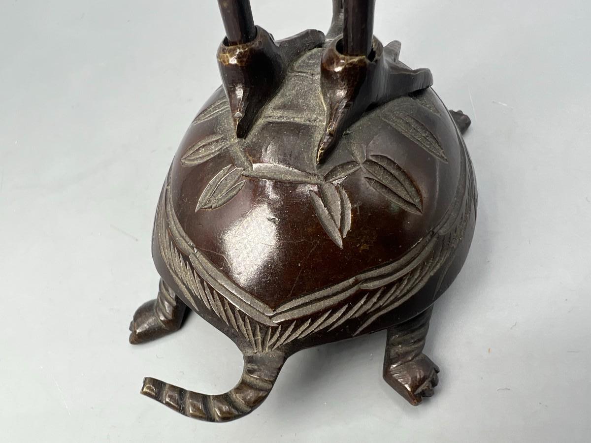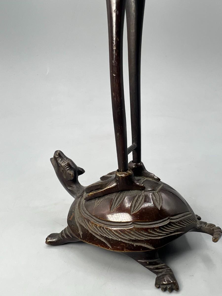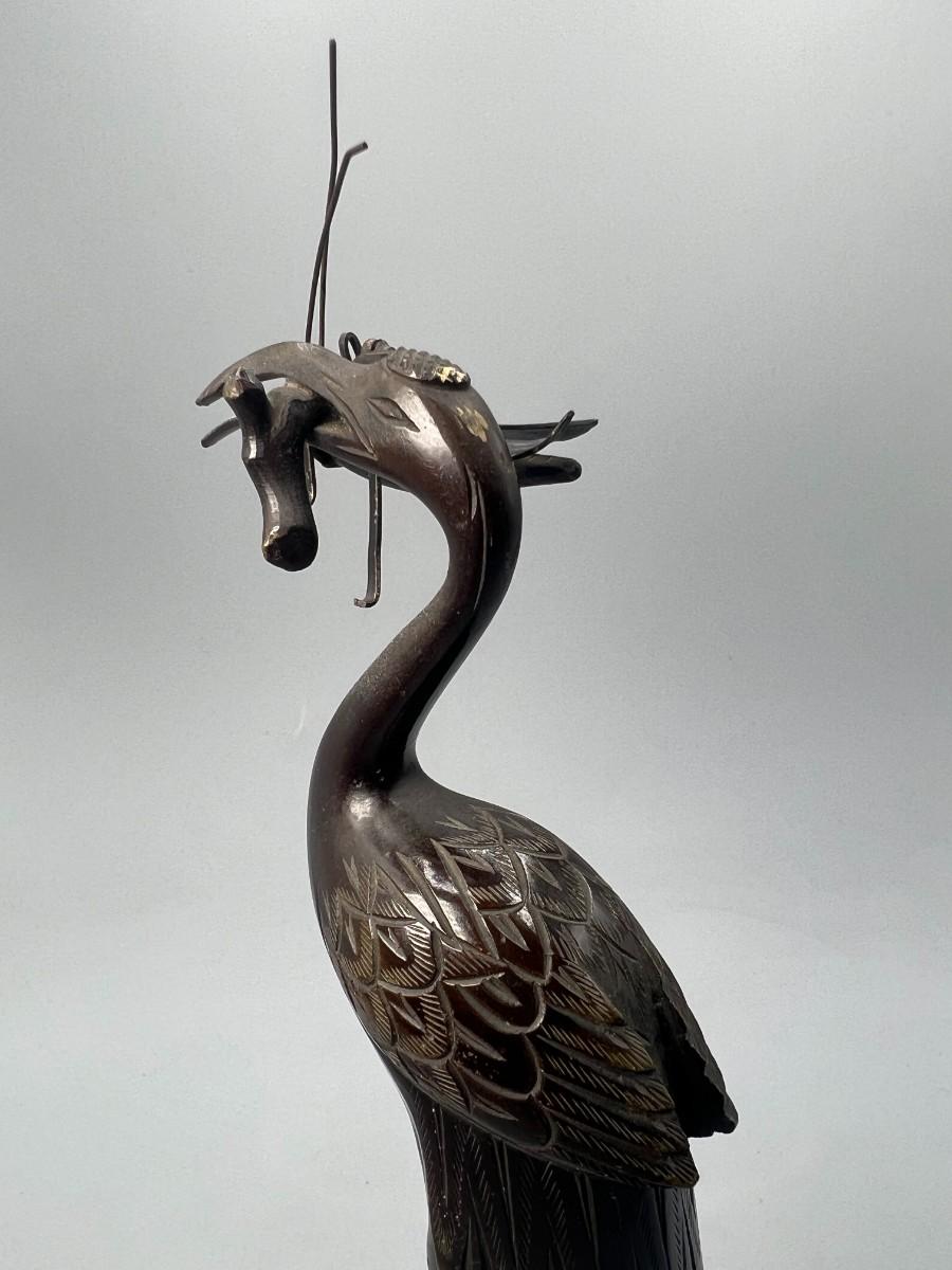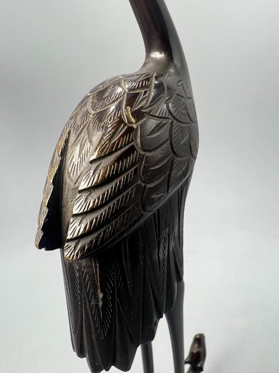 Vintage Metal Bronze Figurine Japanese Figural Art Herron Crane with Cricket on Turtle