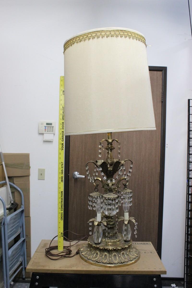 Large Gold Brass & Hanging Crystal Hollywood Regency Table Lamp. Over 3' with shade. May be missing a crystal or two.