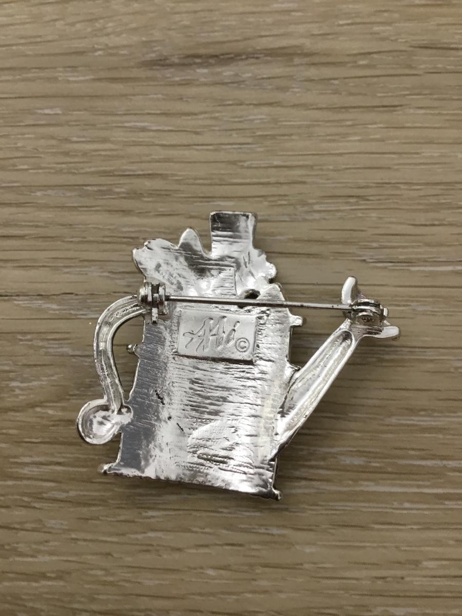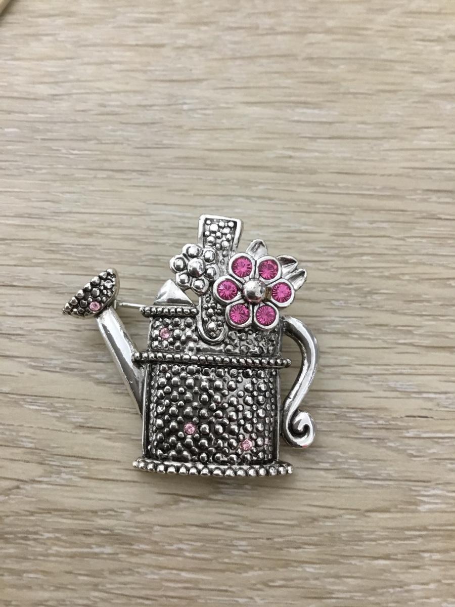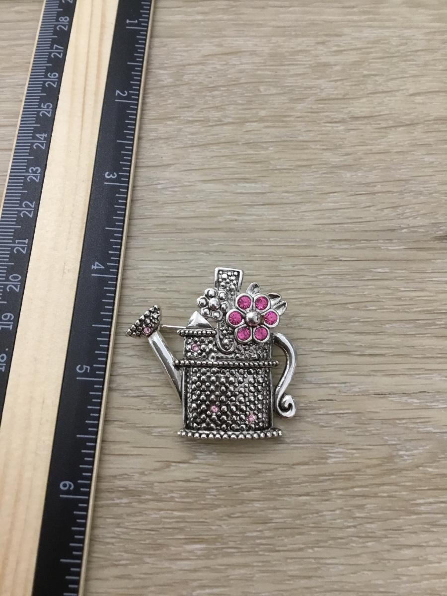 AAI Watering Can Flower Pink Rhinestone Brooch Pin 1.5 Inch Silver Tone