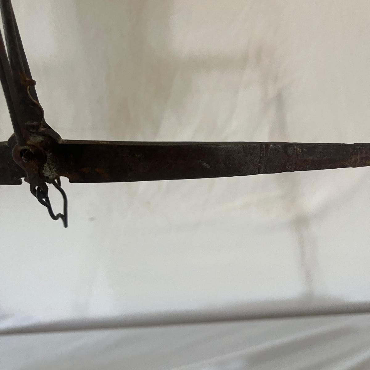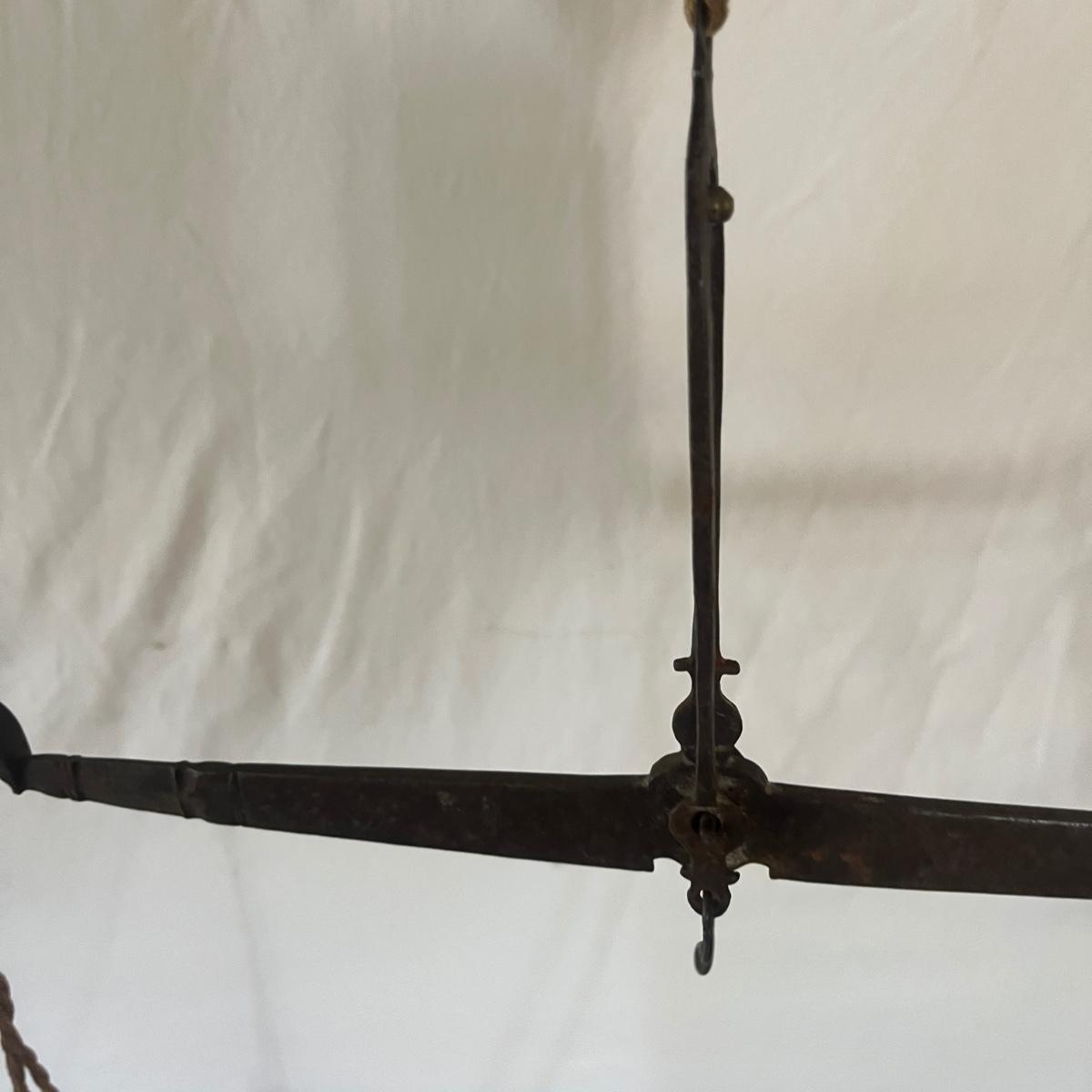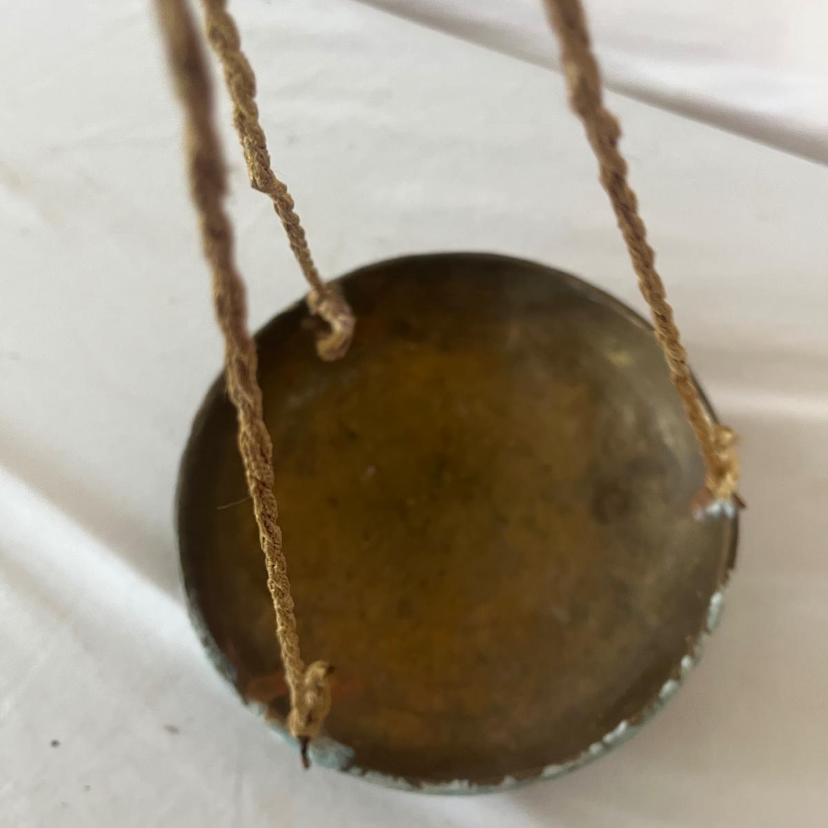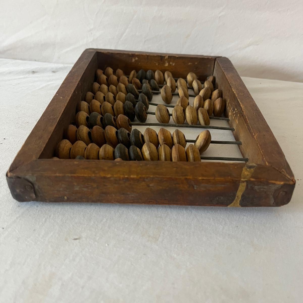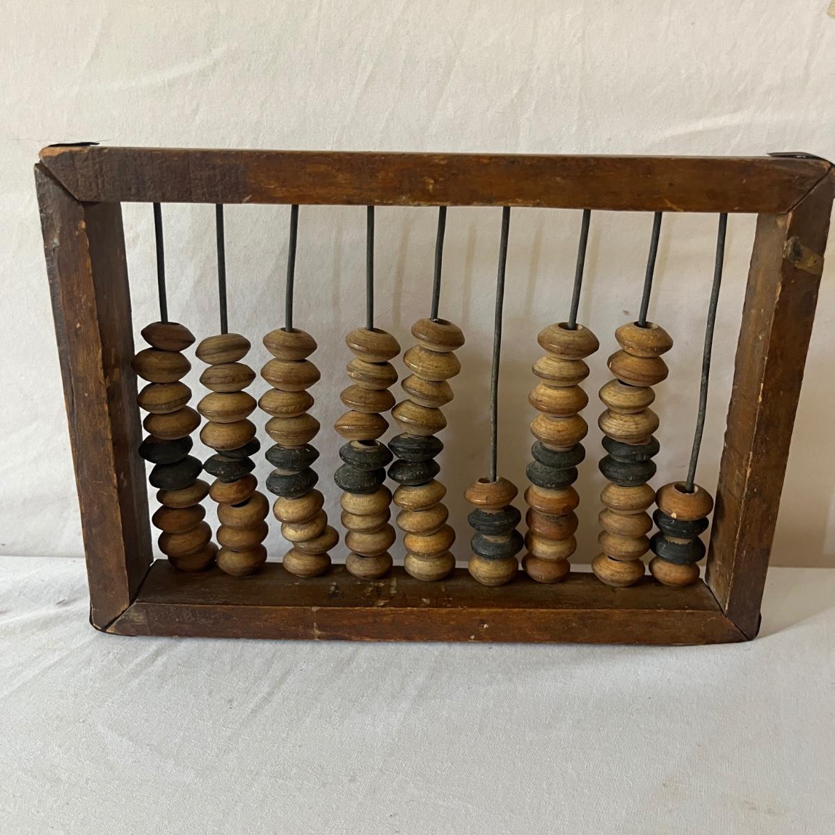 Lot includes a Brass hanging scale, scale weights and an abacus. Abacus measures 9” x 1” x 6.5”H. Scale has broken string and two pieces are missing from weights, see pictures.