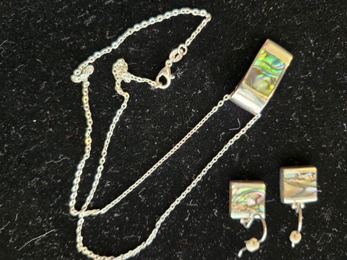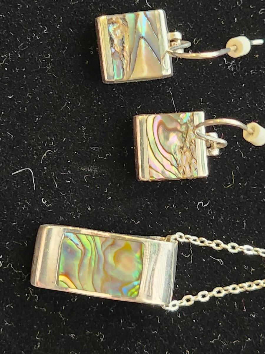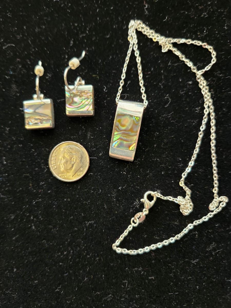 Matched set of abalone set in 925 silver with 18" chain. Showcasing the many colors of the sea , classic and stylish.