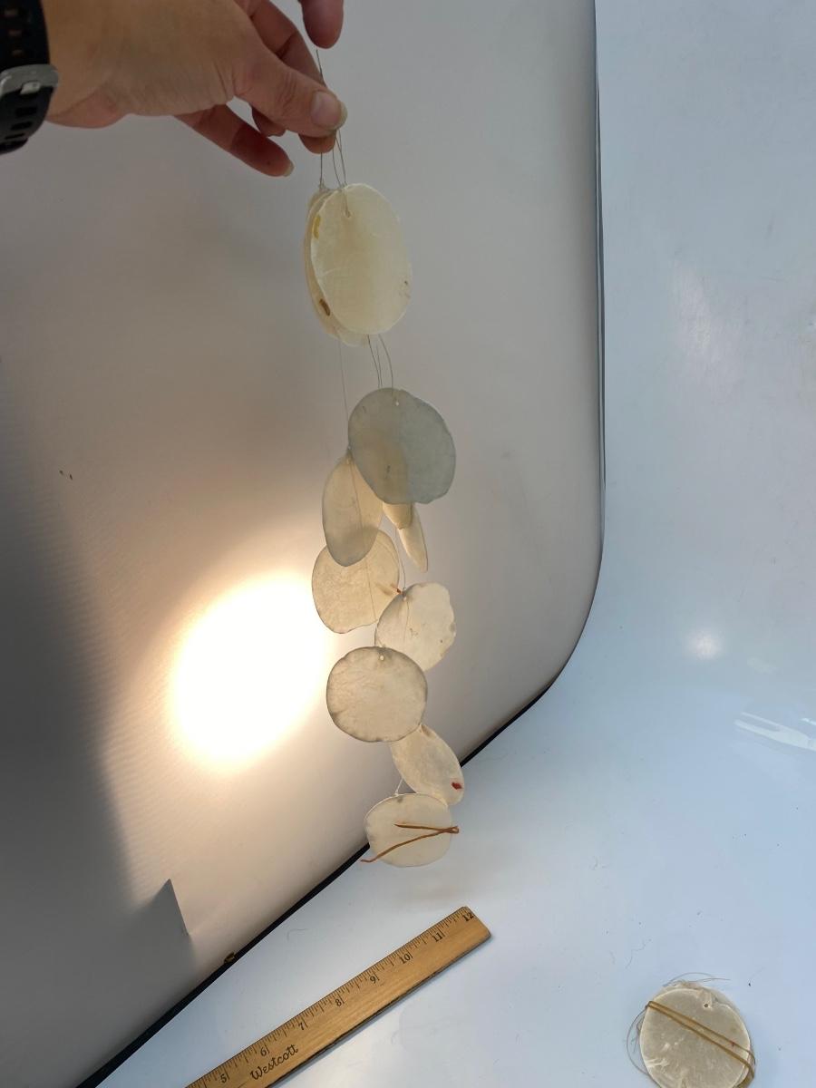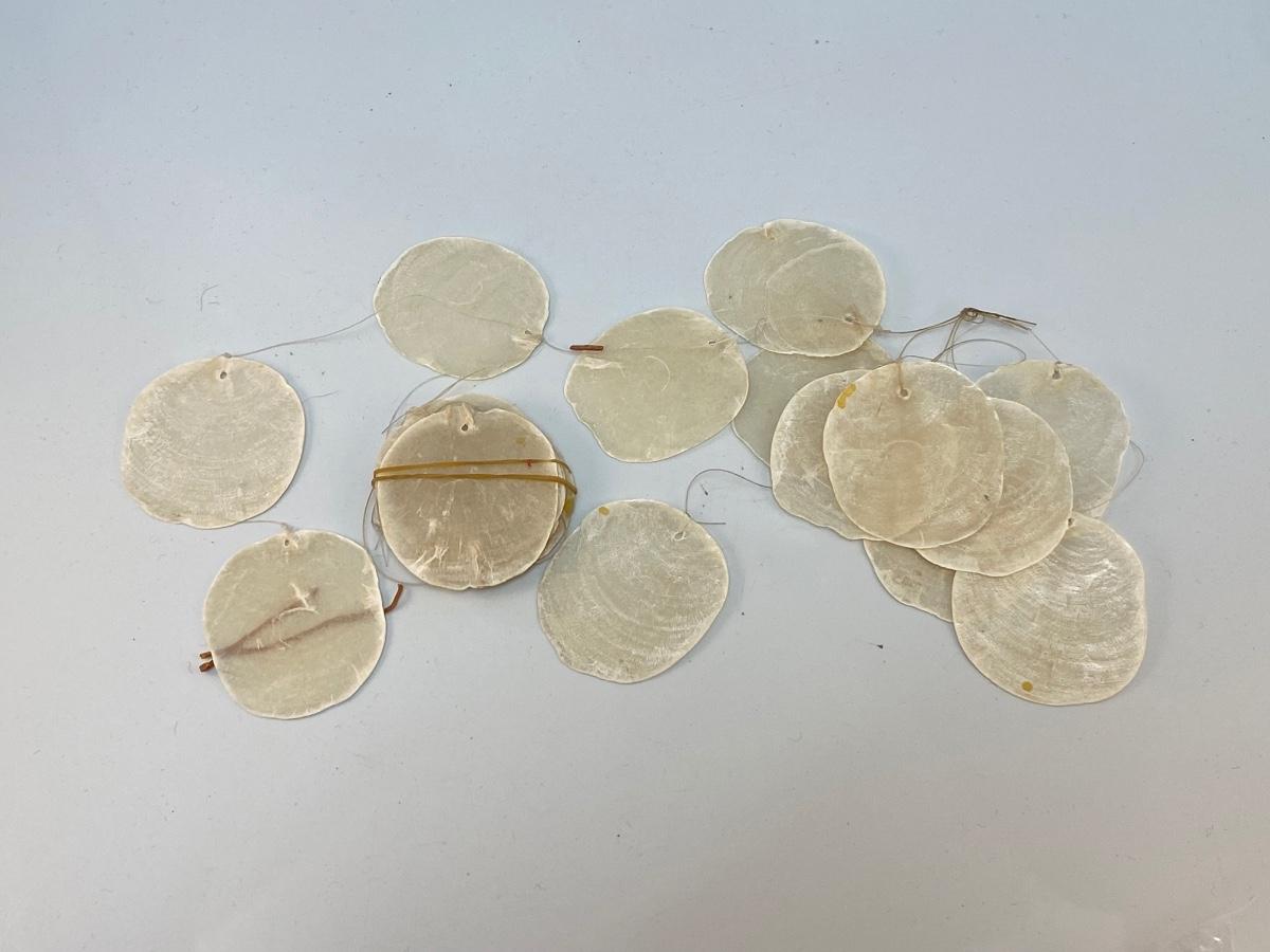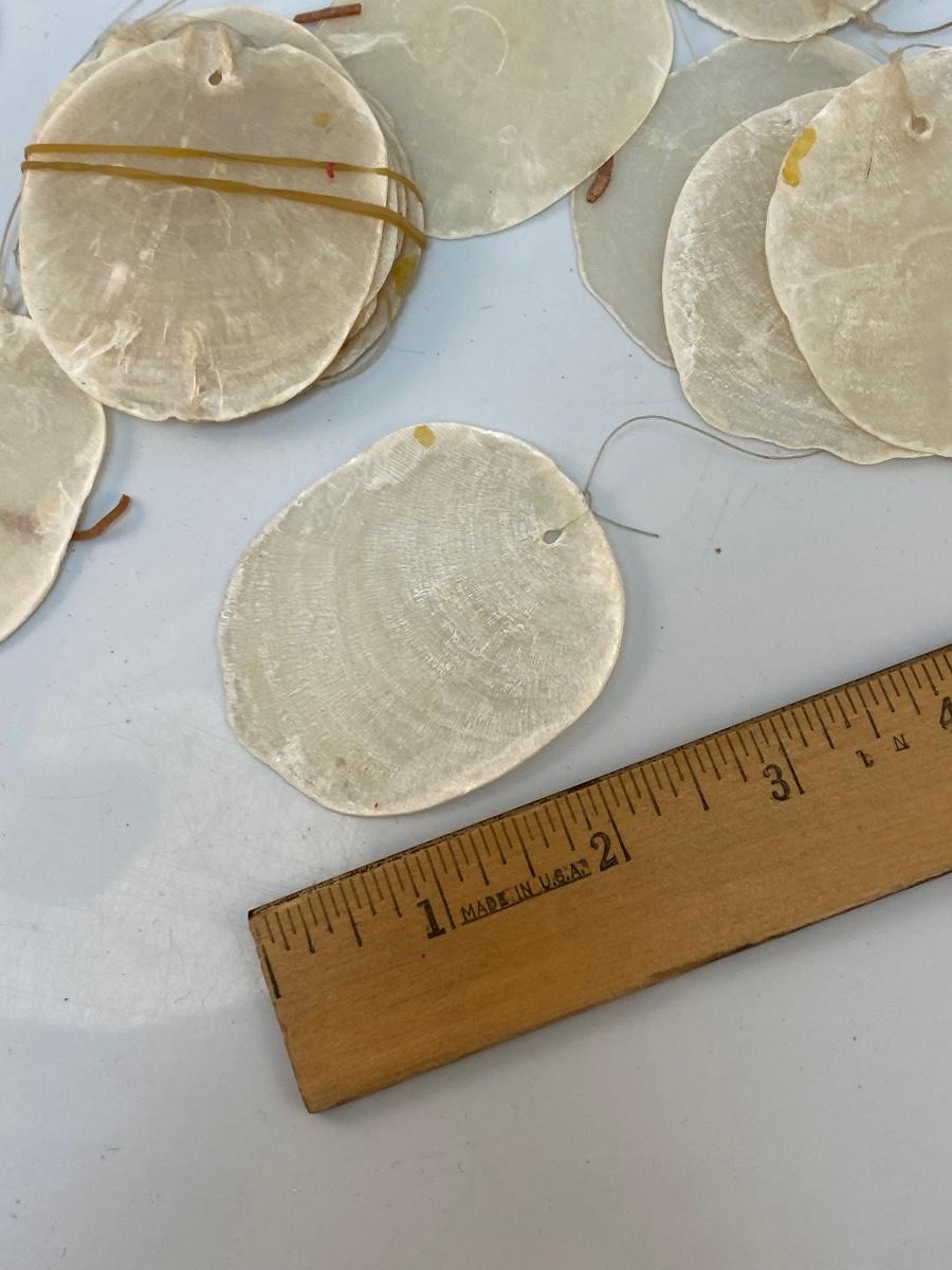 Abalone Capiz Shell Mother of Pearl Disc Lot for Crafting & Decor Single Hole. In good condition. Light signs of age , more to the edges. Some are strung on fishing line but can easily be separated. Make a really pretty sound as wind chimes. About 2" size. Over a dozen in the lot.