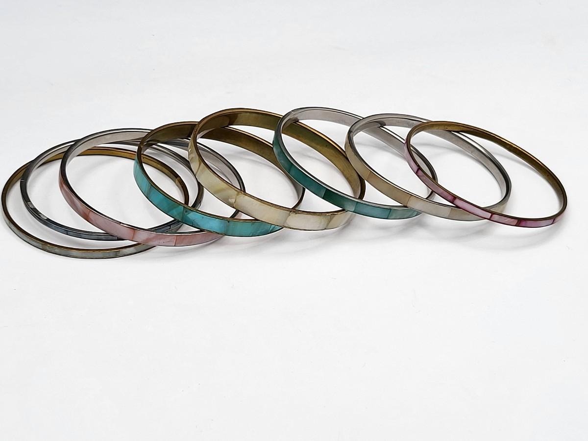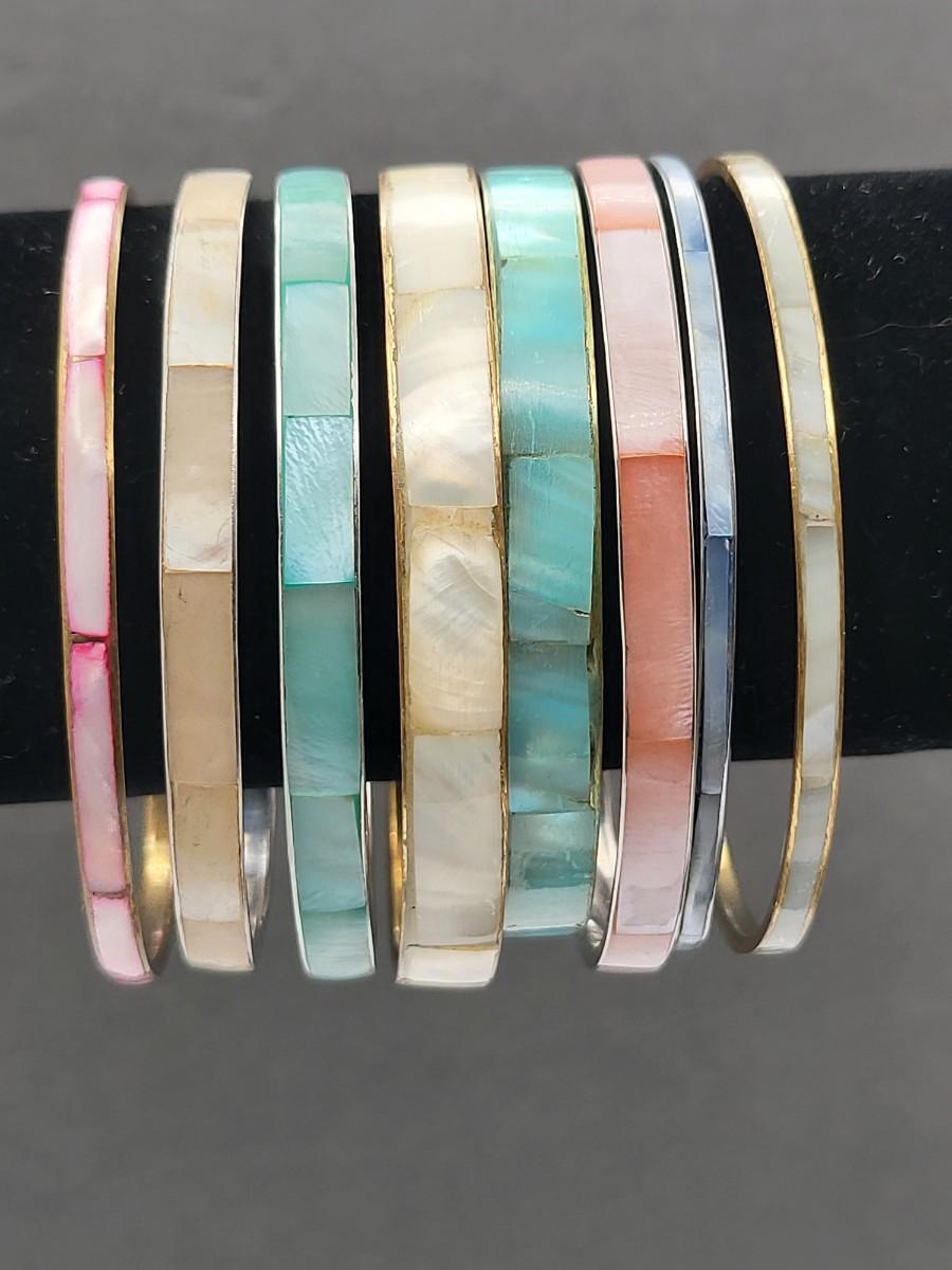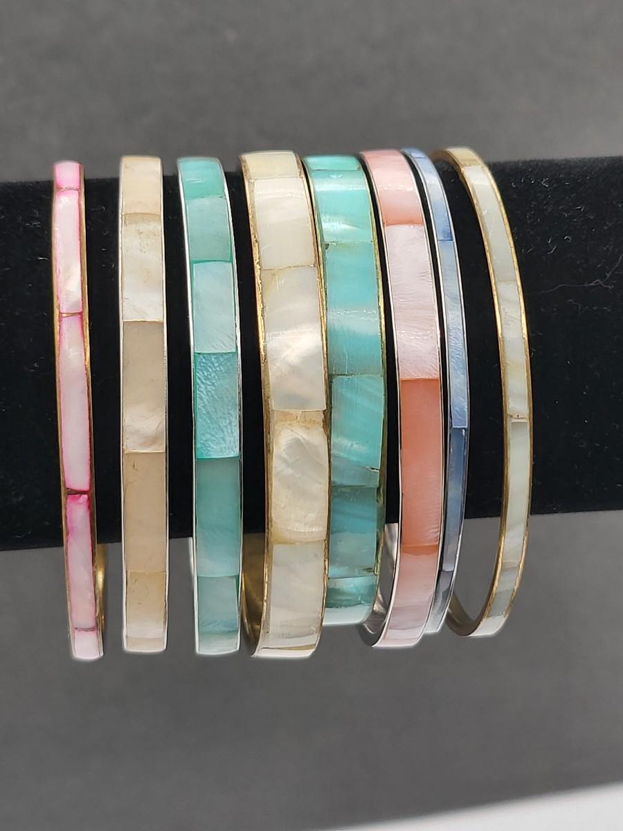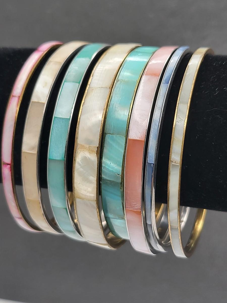 (8) Brass and silver tone, colorful abalone inlay bangle bracelets. The inner circumference is 2.75", which fits most wrists.