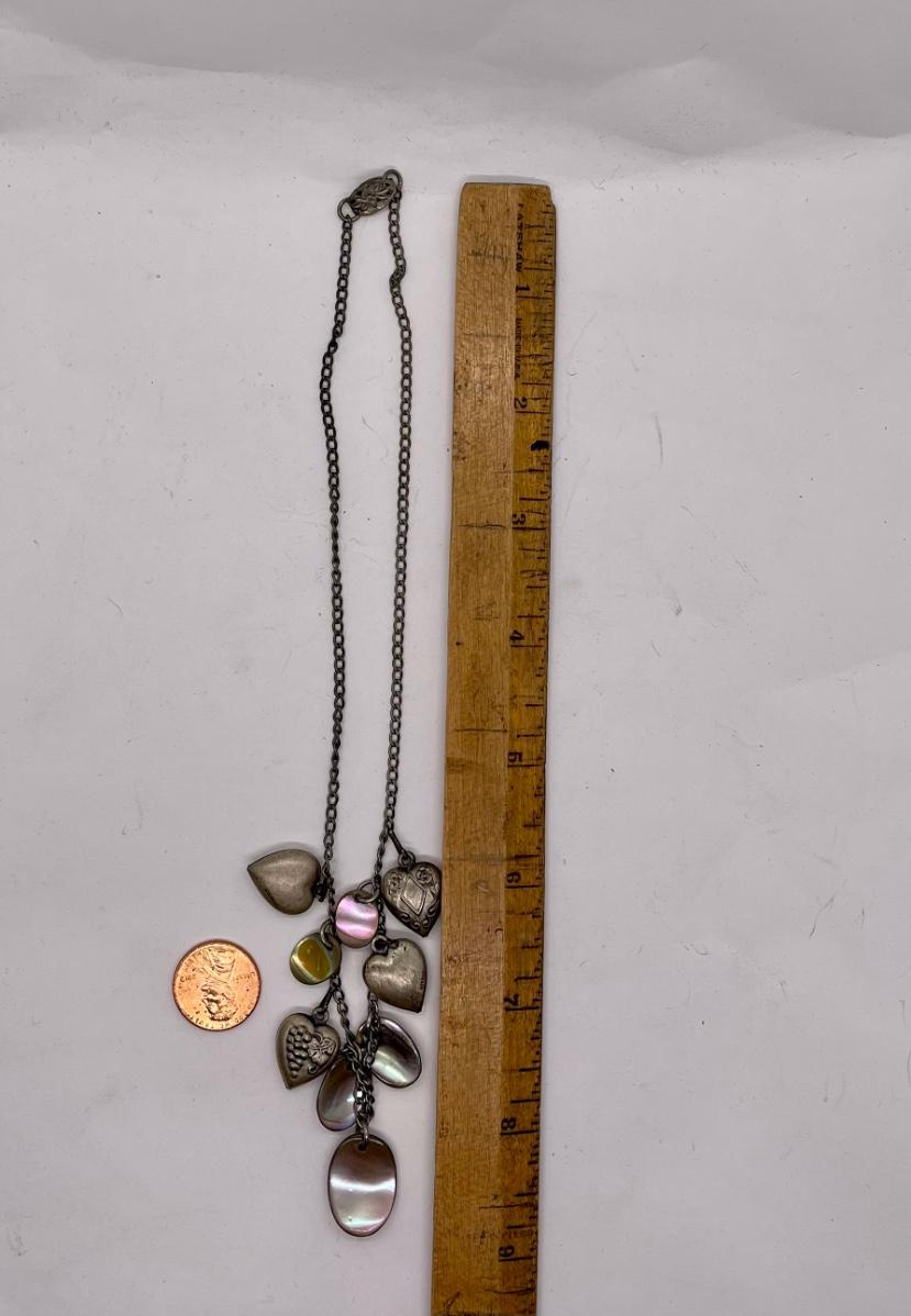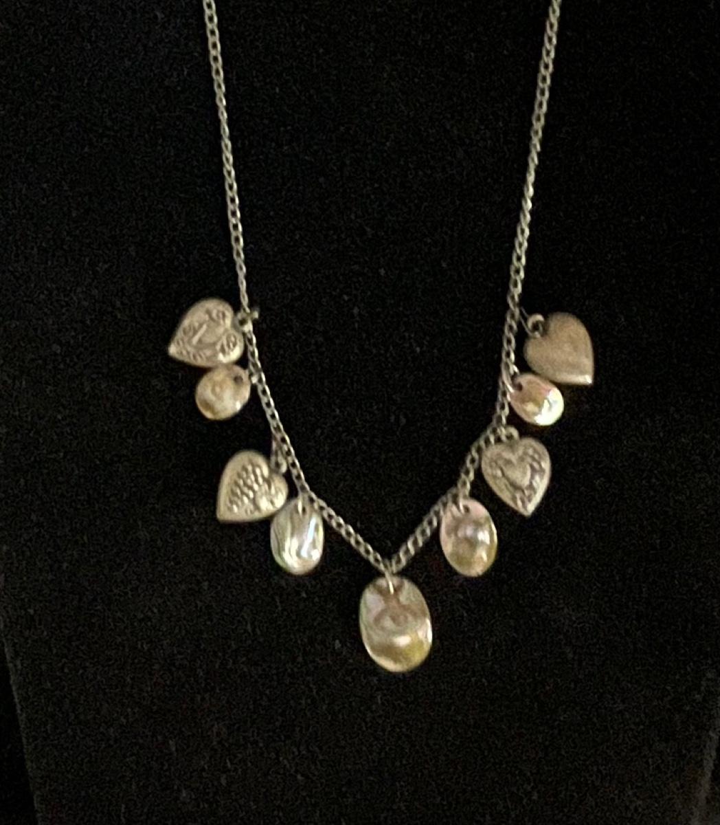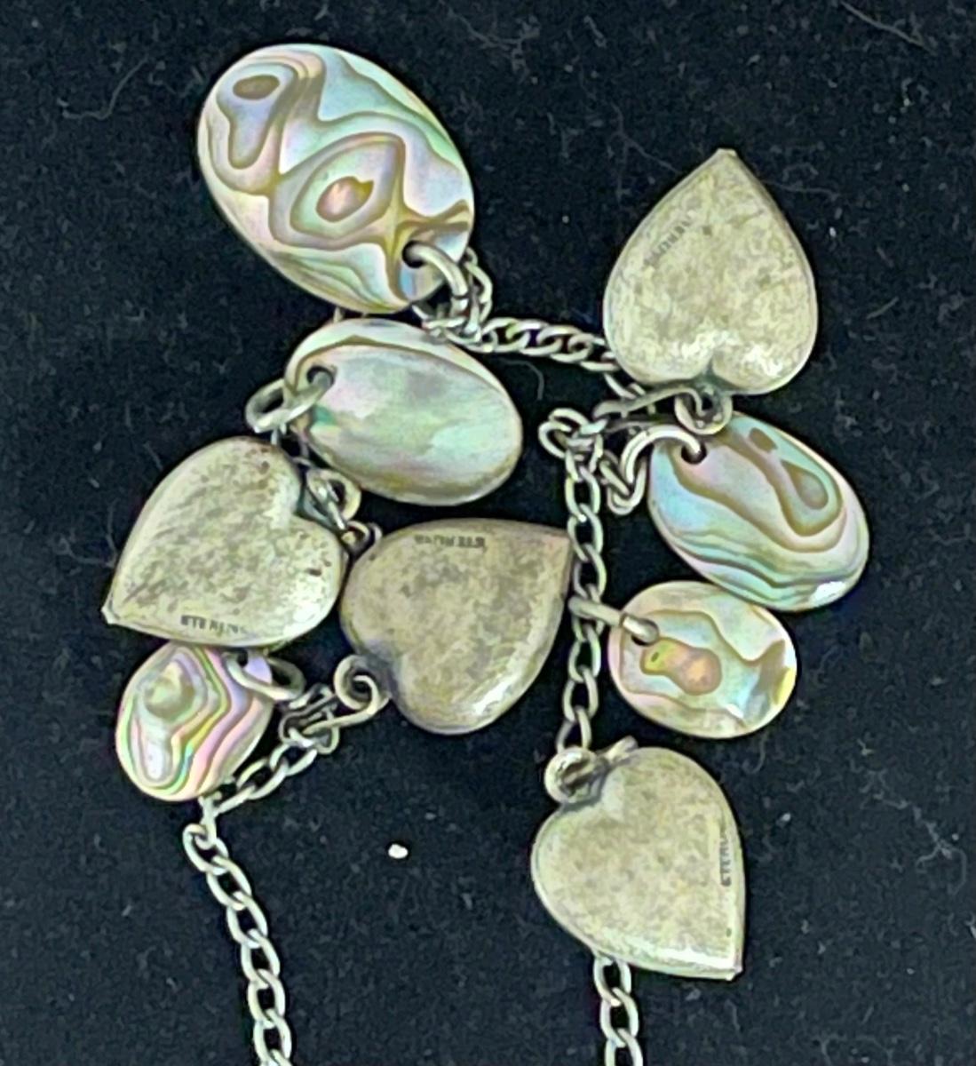 Abalone Mother of Pearl and Sterling Silver Heart Charm Necklace. In good condition. Stamped sterling.