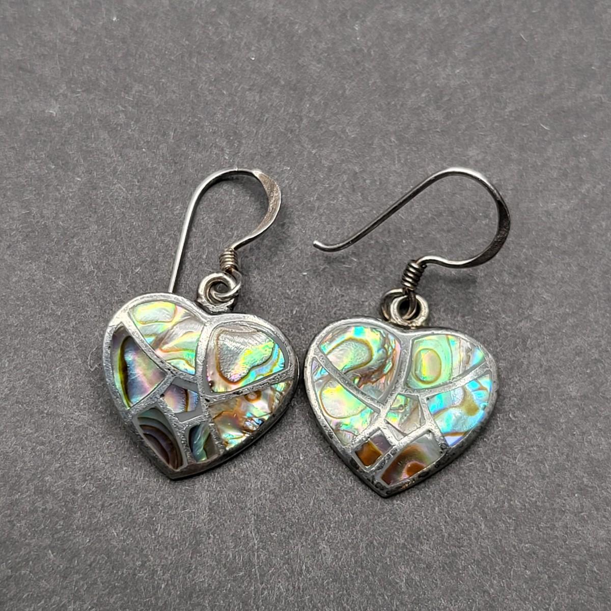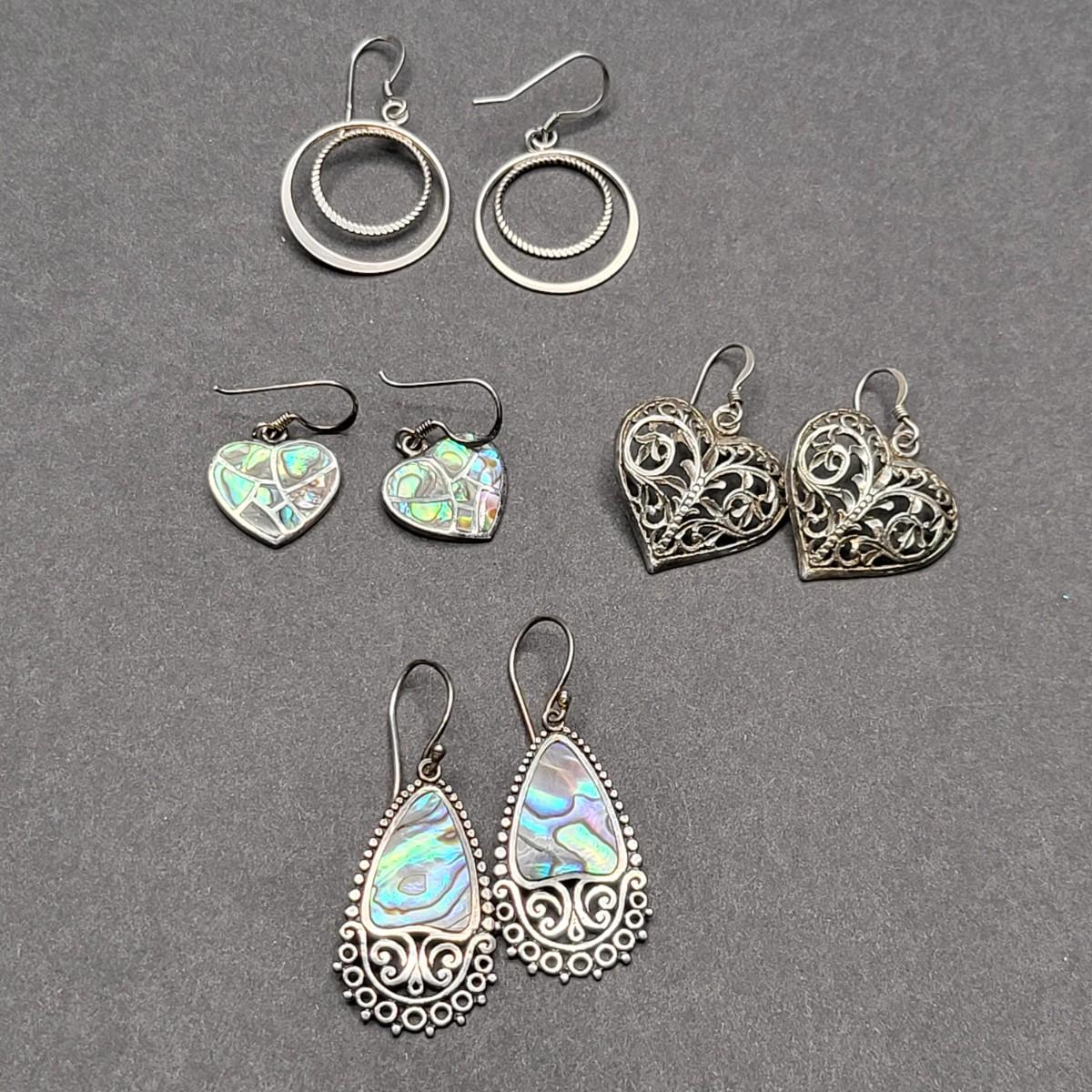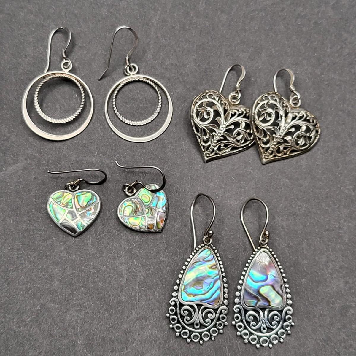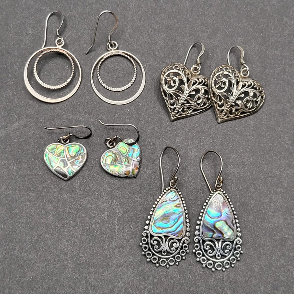(4) Pairs 925 Sterling Silver earrings, stamped. Heart and tear drop earri gs both have Abalone inlay. Double circles. Filigree heart earrings. All pierced hooks.