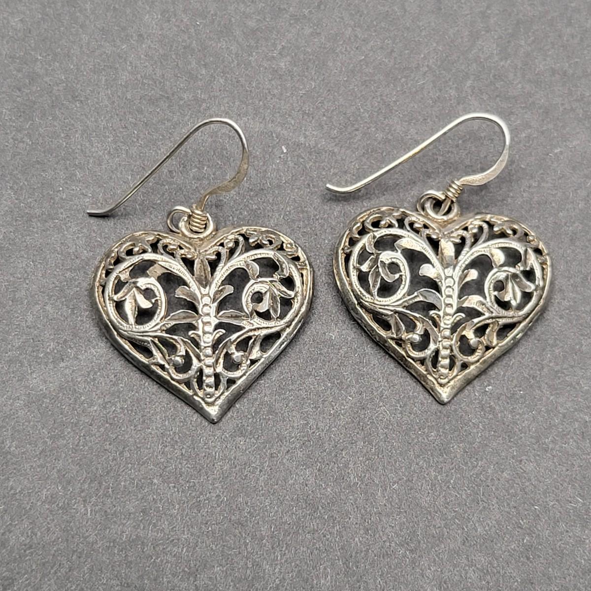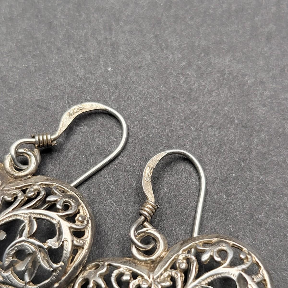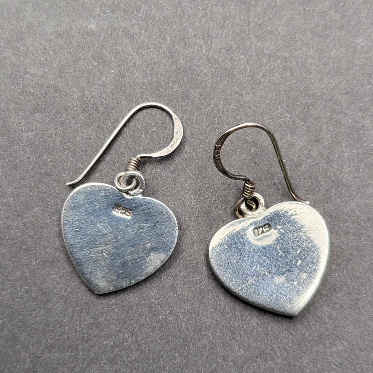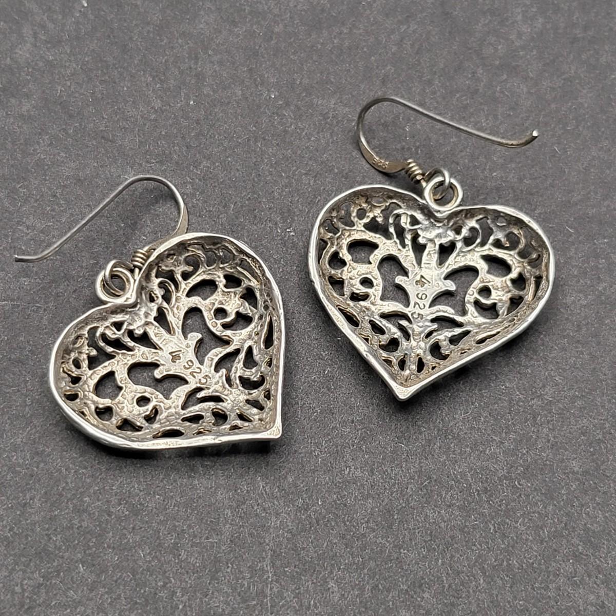 (4) Pairs 925 Sterling Silver earrings, stamped. Heart and tear drop earri gs both have Abalone inlay. Double circles. Filigree heart earrings. All pierced hooks.
