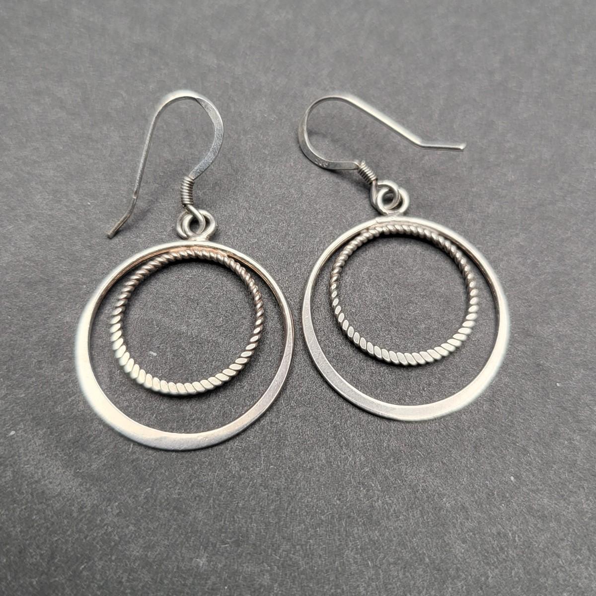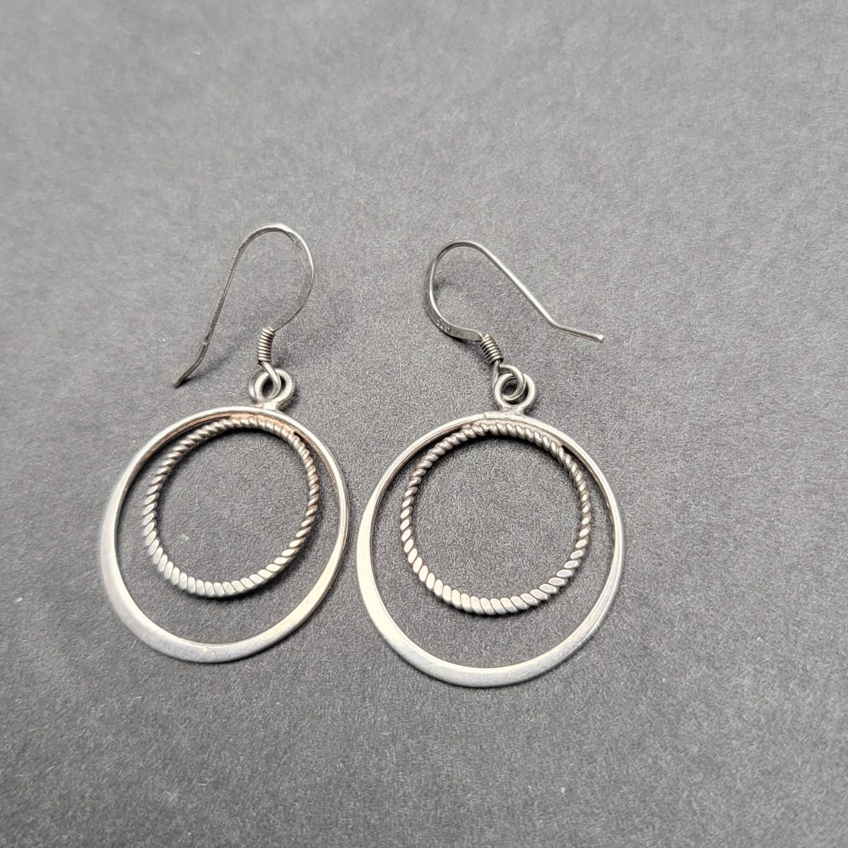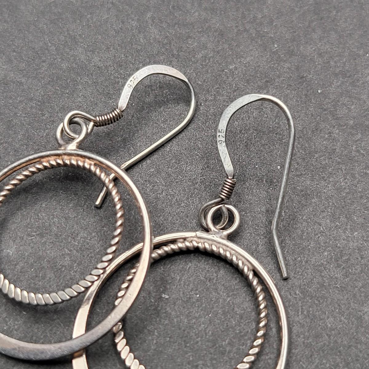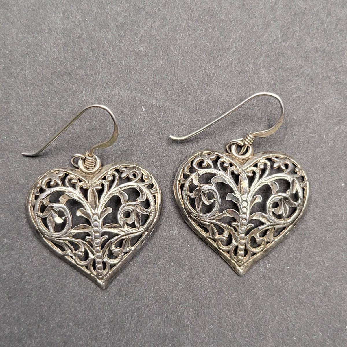 (4) Pairs 925 Sterling Silver earrings, stamped. Heart and tear drop earri gs both have Abalone inlay. Double circles. Filigree heart earrings. All pierced hooks.