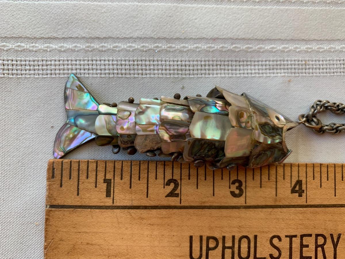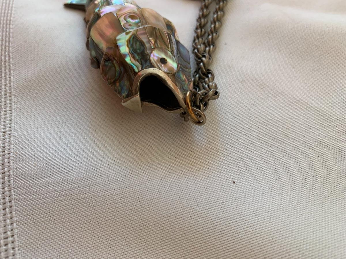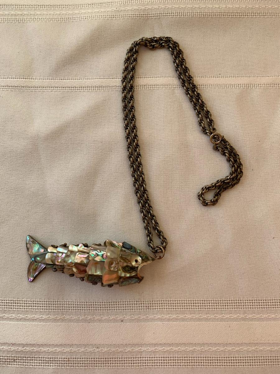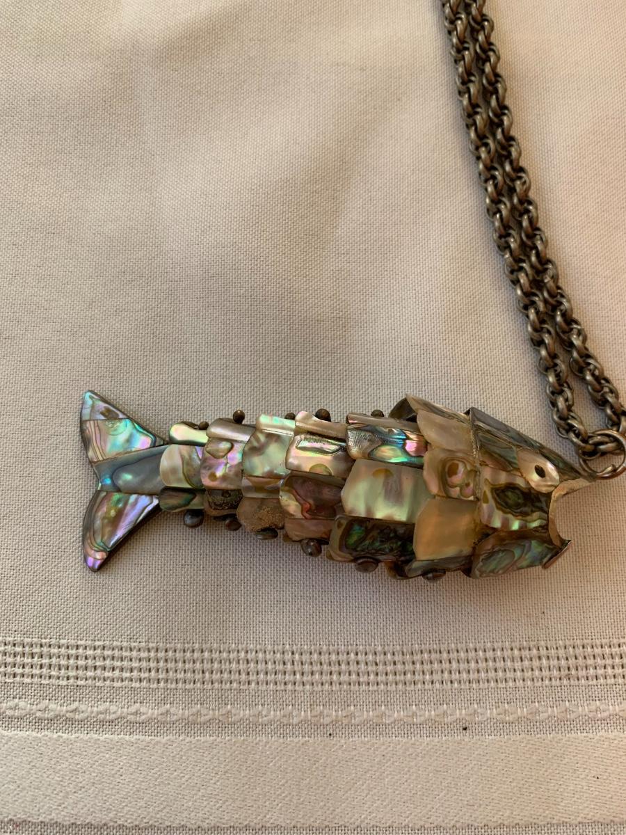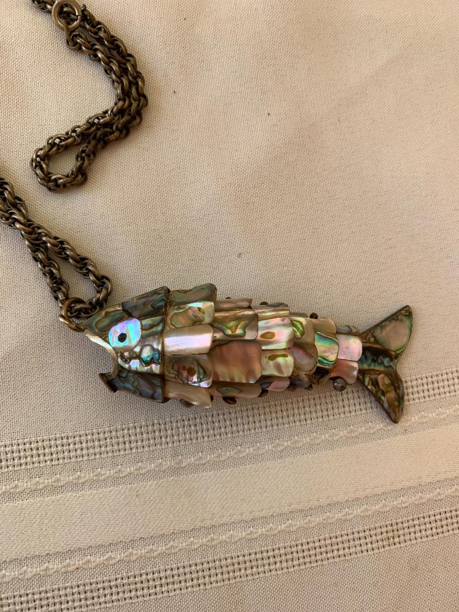 Articulated abolone fish necklace with serpentine chain. Fish in excellent condition, chain could use a cleaning