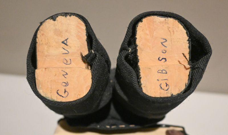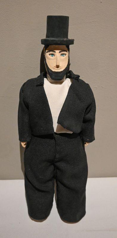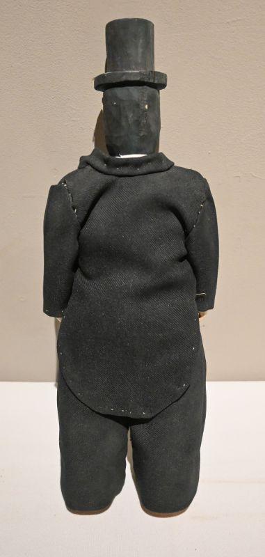 An Abe Lincoln sculpture by artist Geneva Gibson. Wood, fabric, paint. Approx. 5.5" x 3" x 15".