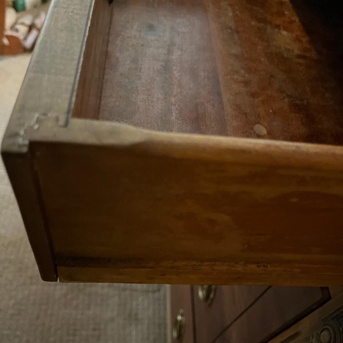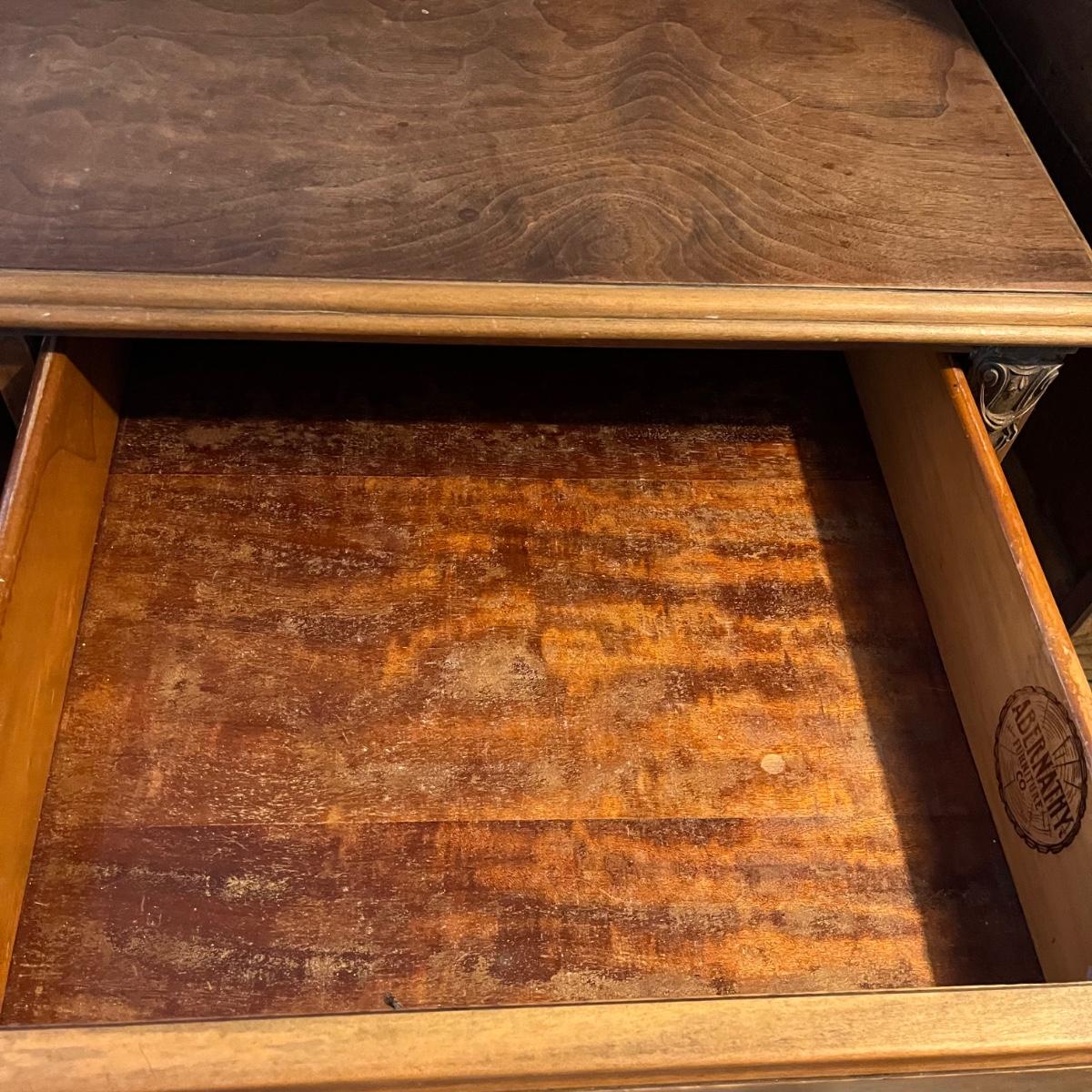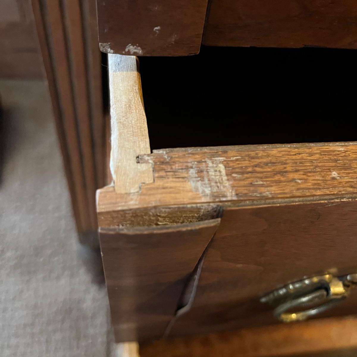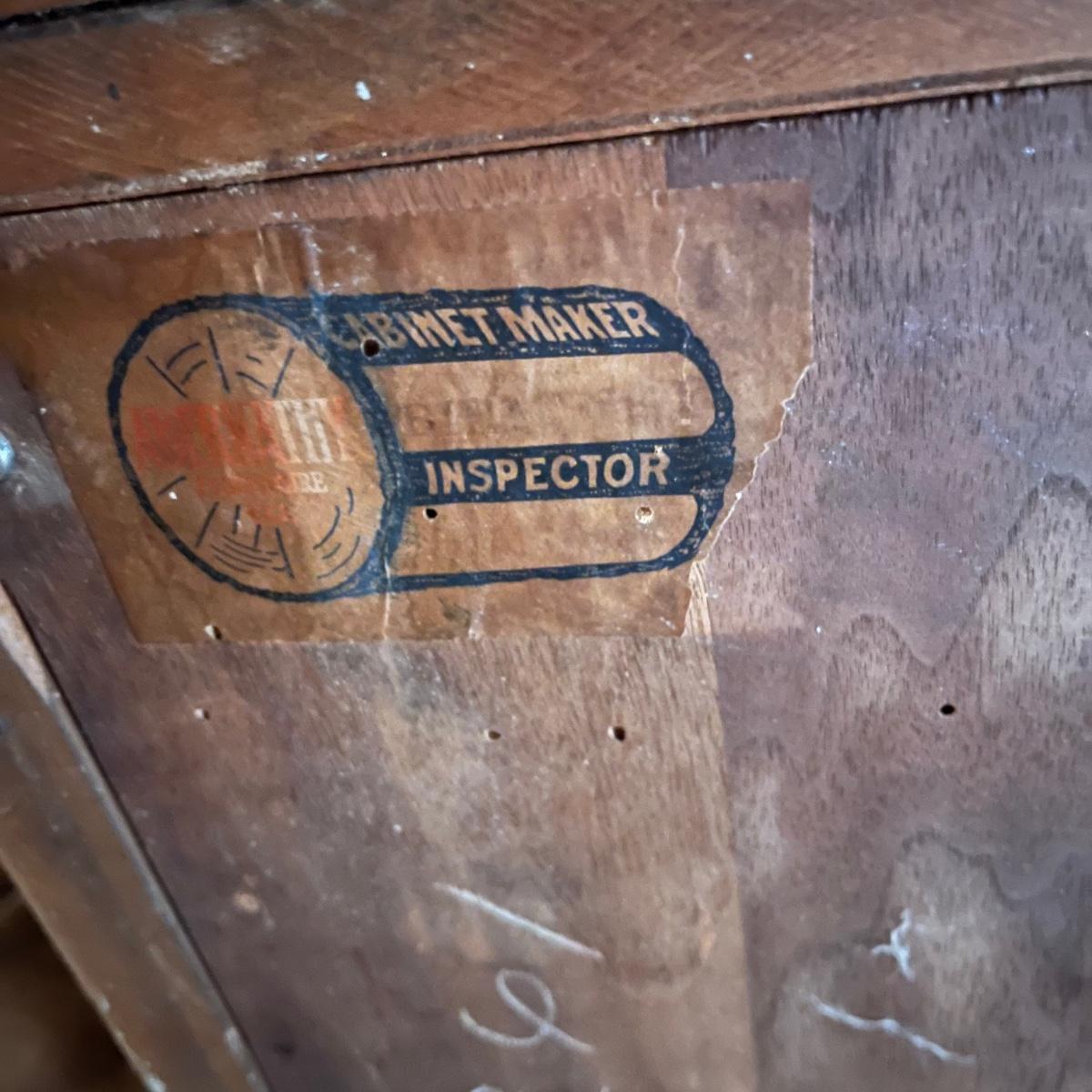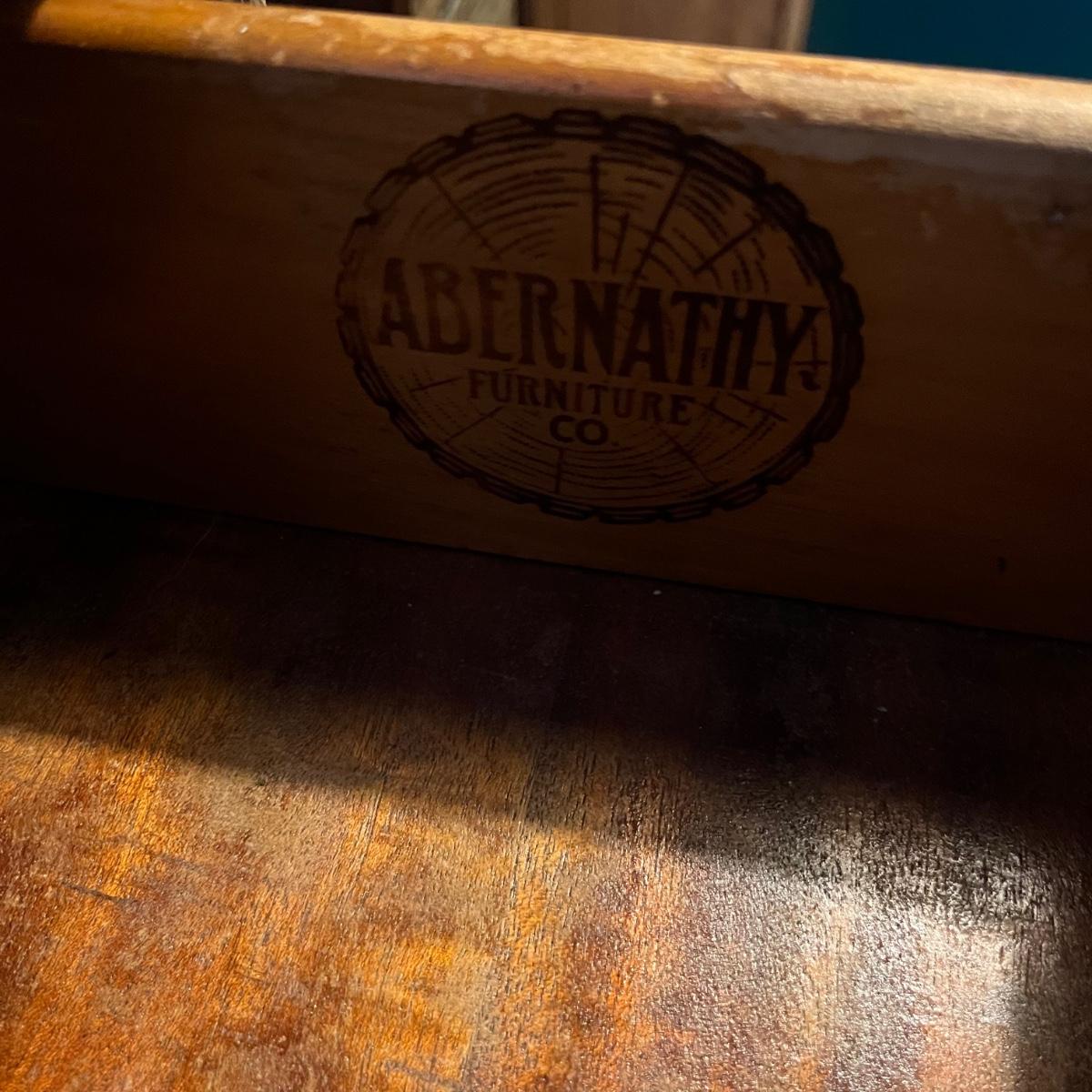 This five drawer chest of drawers is made by Abernathy Furniture Co. It measures 20” x 38” x 40”. A lovely and unique piece of furniture that clearly has been loved for many years. Its age shows in the bottom three drawers which have loose veneer and are bowing out a bit, see pictures. You'll find two matching Abernathy end tables in the previous lot.