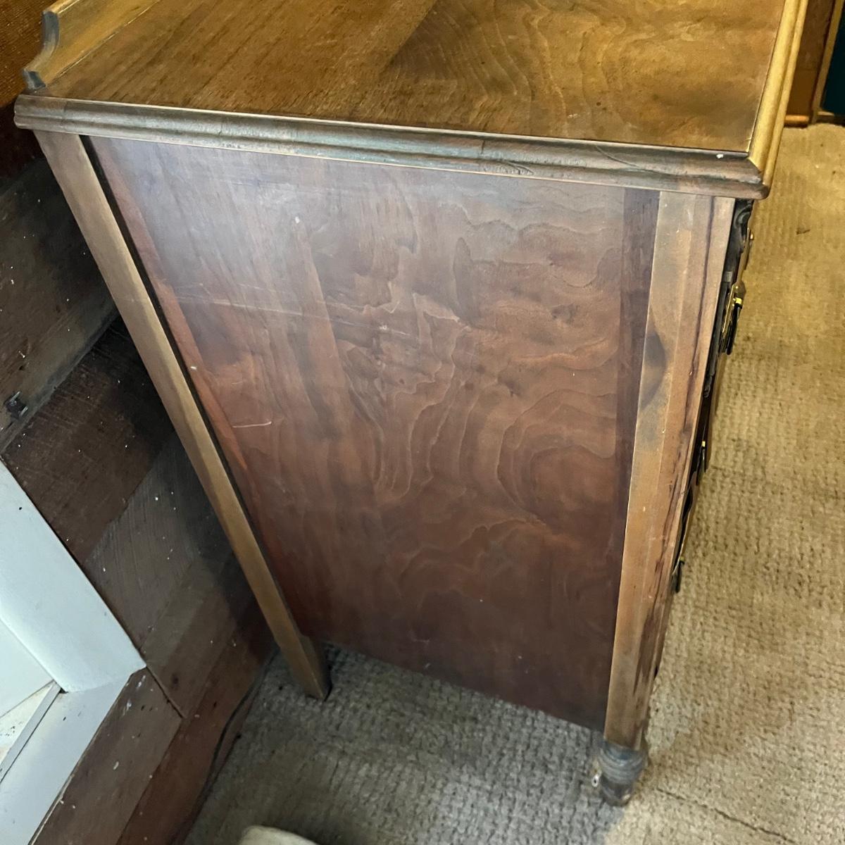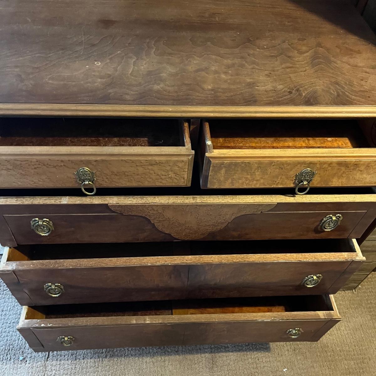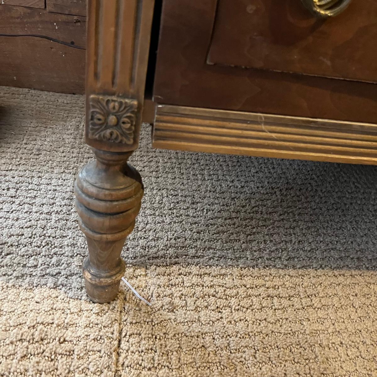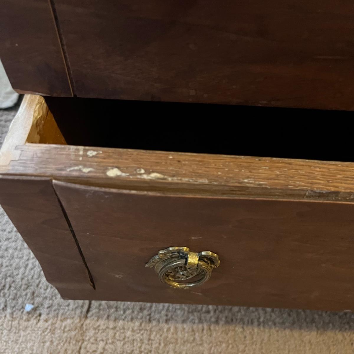 This five drawer chest of drawers is made by Abernathy Furniture Co. It measures 20” x 38” x 40”. A lovely and unique piece of furniture that clearly has been loved for many years. Its age shows in the bottom three drawers which have loose veneer and are bowing out a bit, see pictures. You'll find two matching Abernathy end tables in the previous lot.