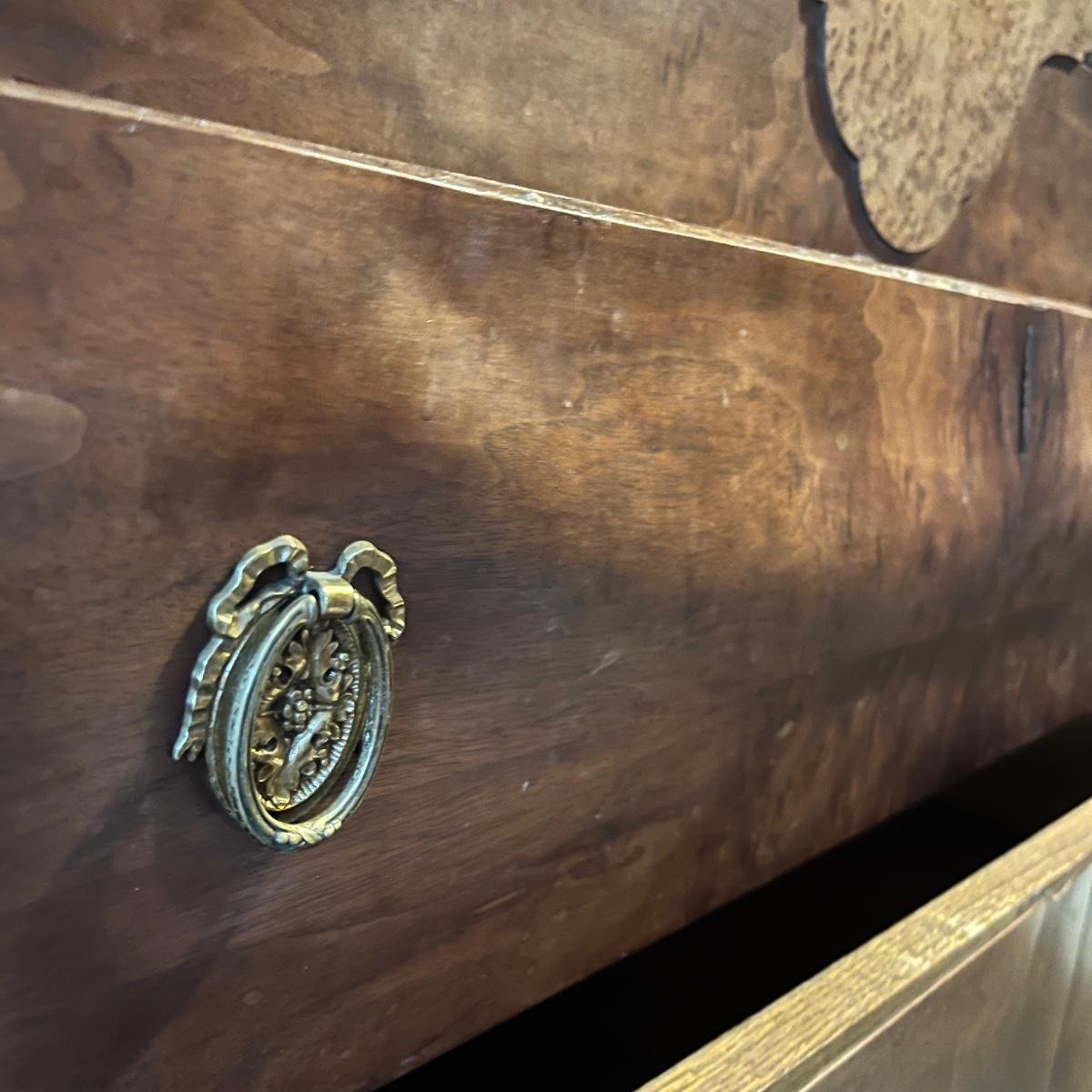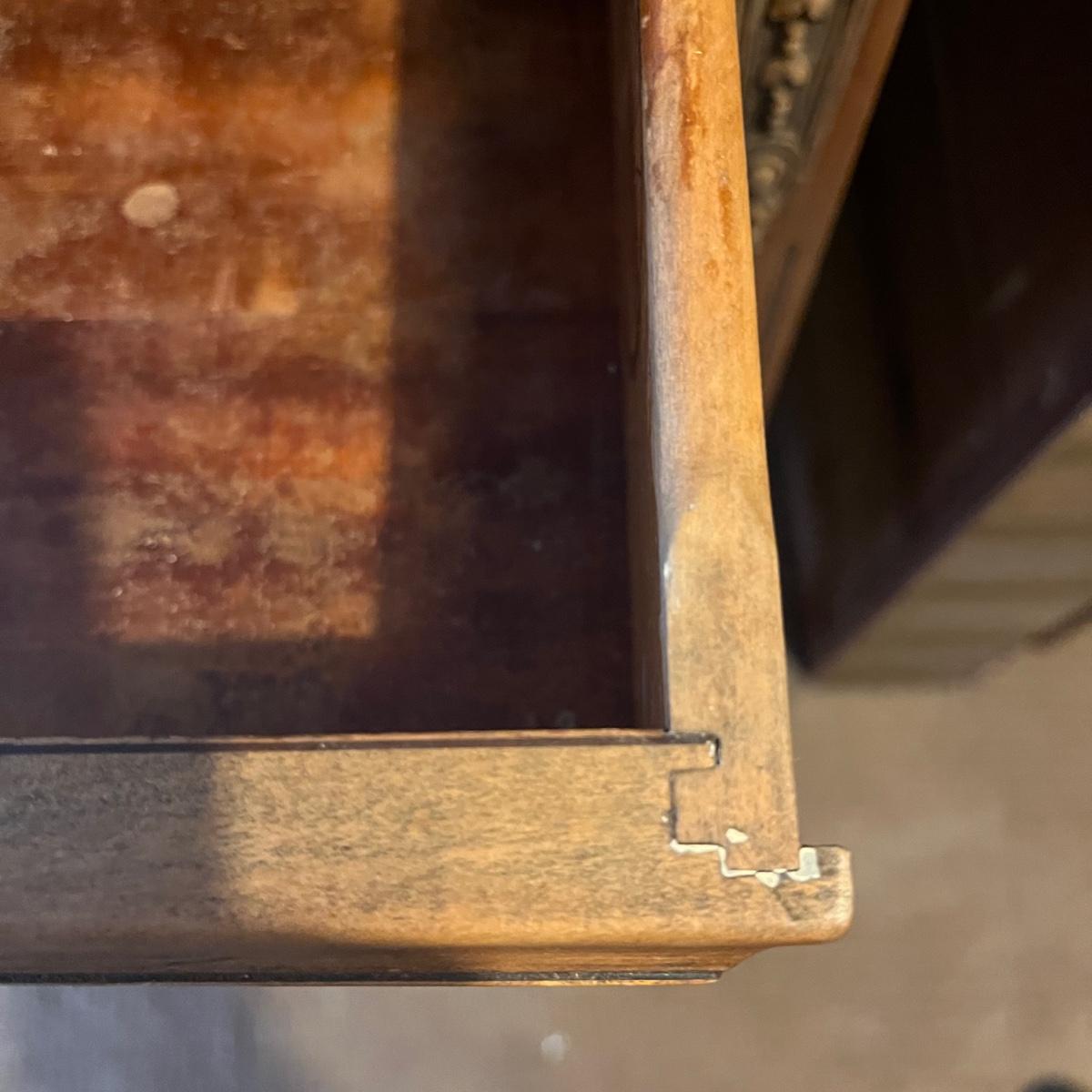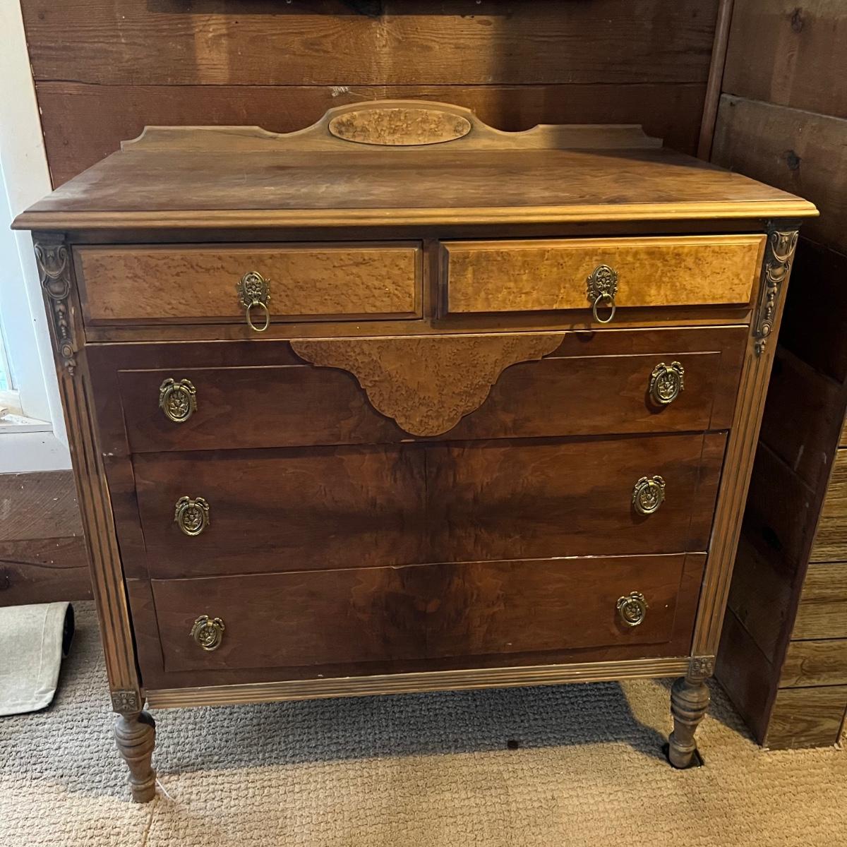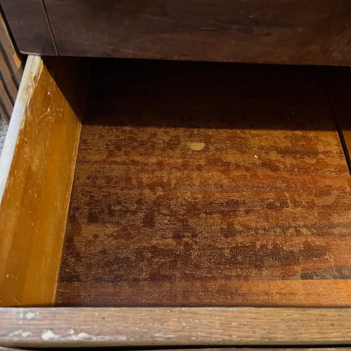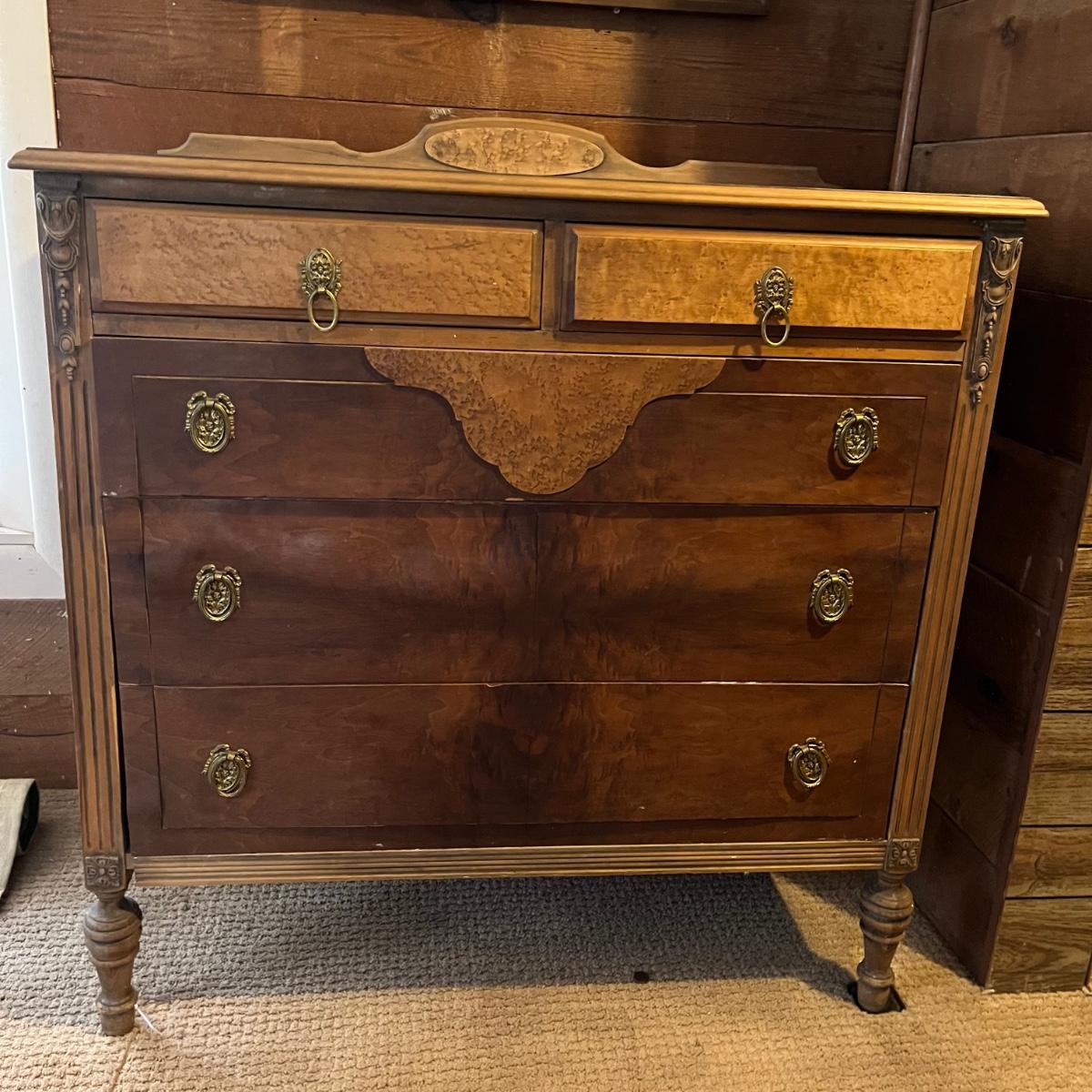 This five drawer chest of drawers is made by Abernathy Furniture Co. It measures 20” x 38” x 40”. A lovely and unique piece of furniture that clearly has been loved for many years. Its age shows in the bottom three drawers which have loose veneer and are bowing out a bit, see pictures. You'll find two matching Abernathy end tables in the previous lot.