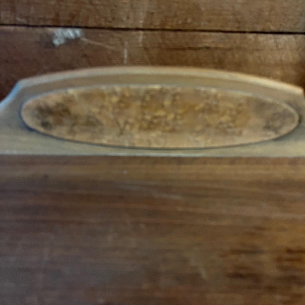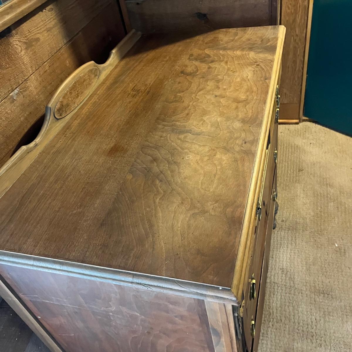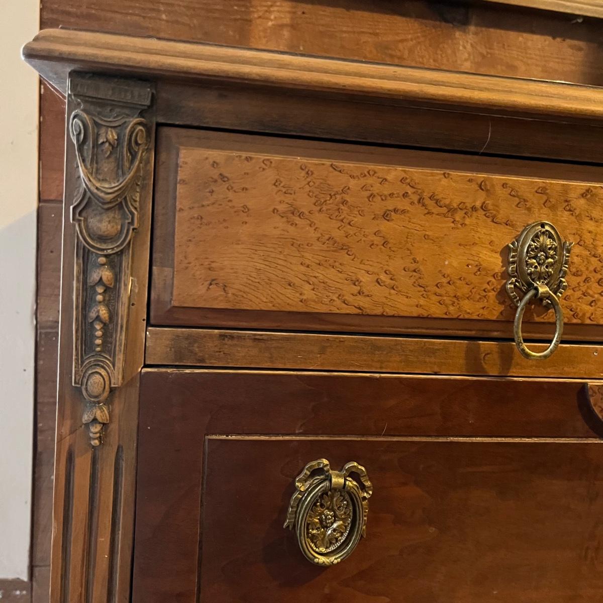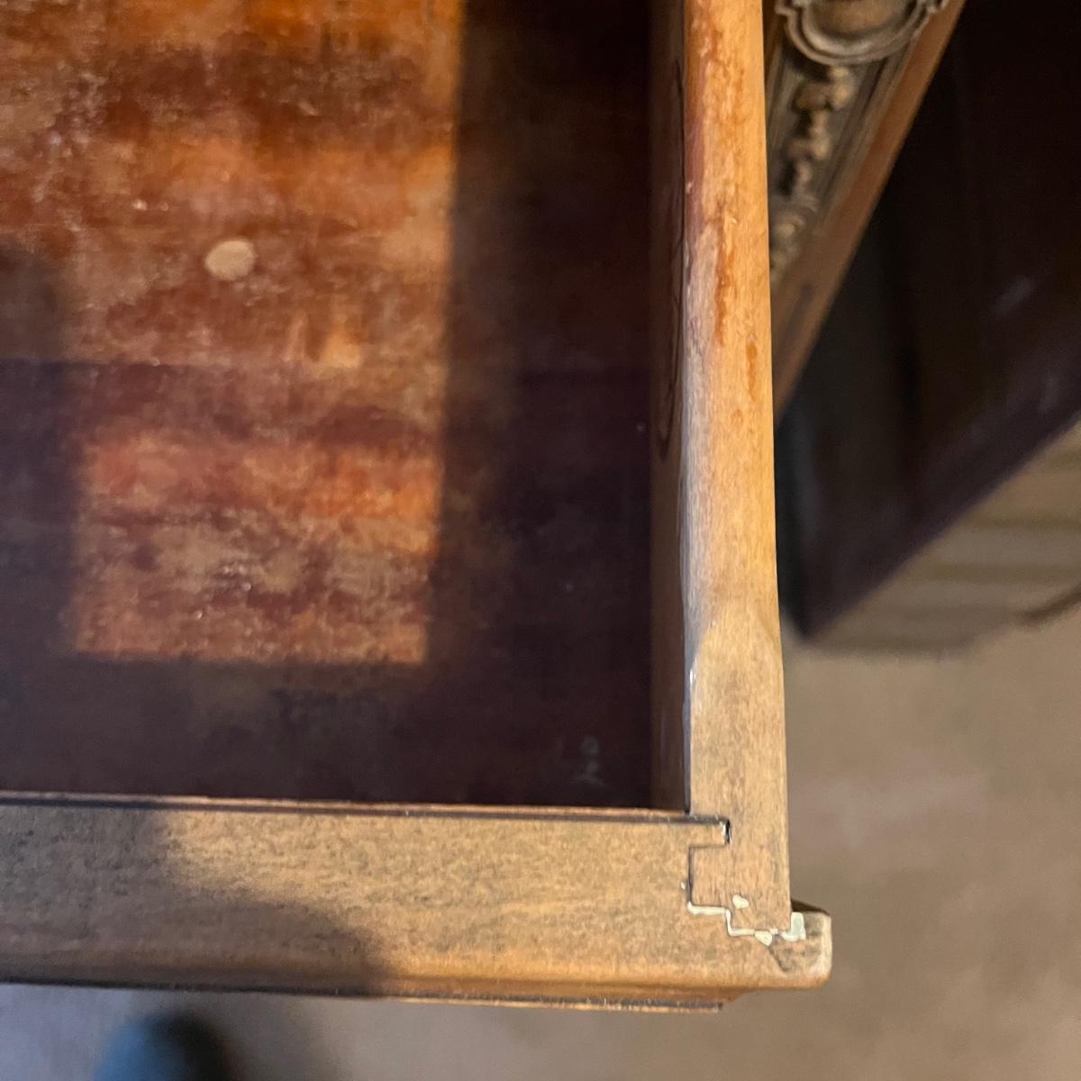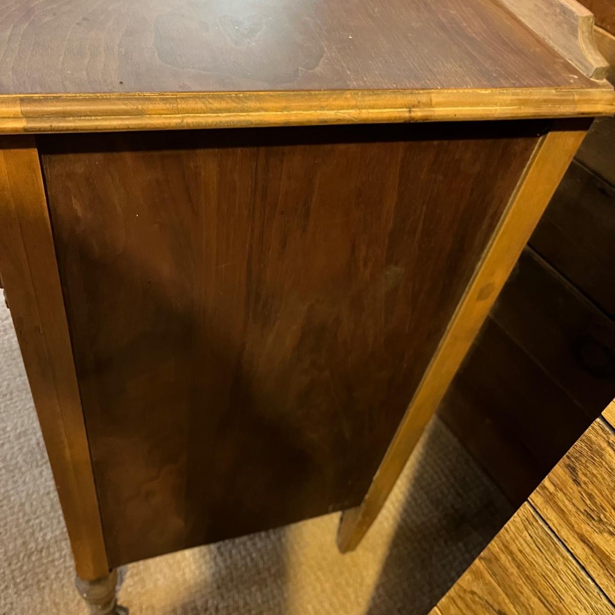 This five drawer chest of drawers is made by Abernathy Furniture Co. It measures 20” x 38” x 40”. A lovely and unique piece of furniture that clearly has been loved for many years. Its age shows in the bottom three drawers which have loose veneer and are bowing out a bit, see pictures. You'll find two matching Abernathy end tables in the previous lot.