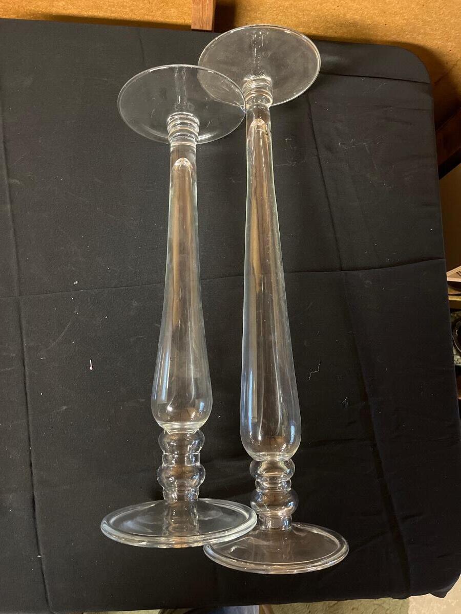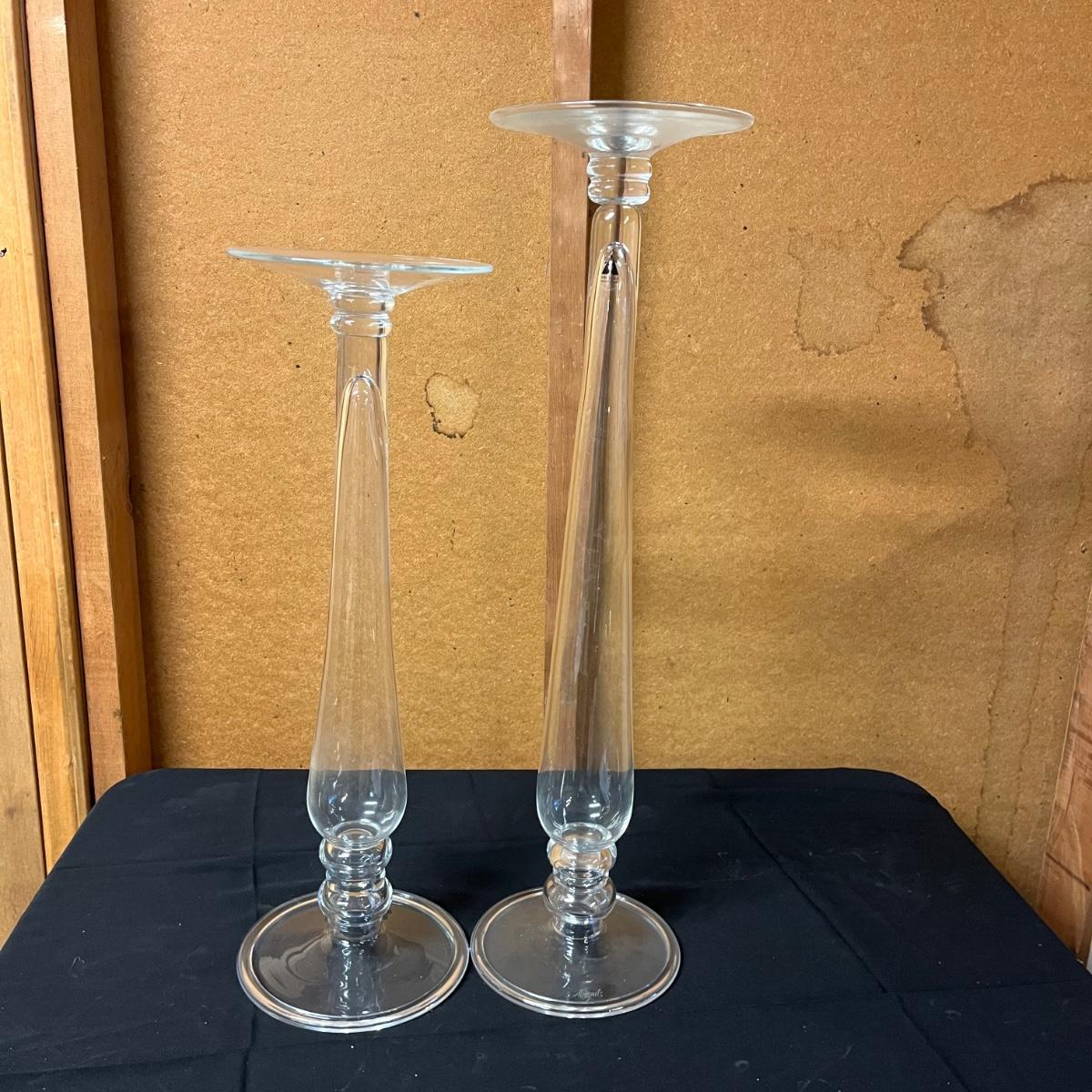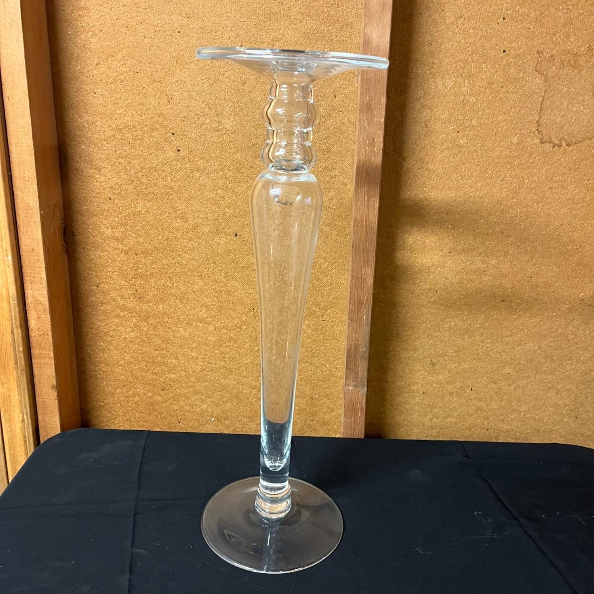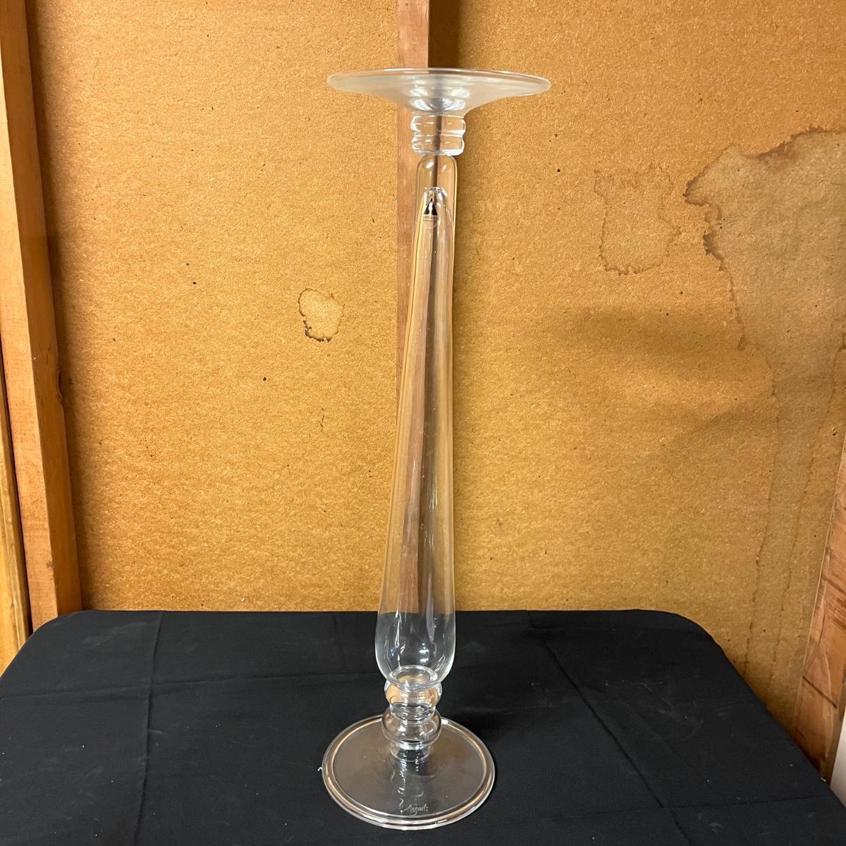 Lot includes a Signed Abigail’s Bonaparte Pillar candlestick that measures 7”D x 25.5”D. Also includes a similar glass candlestick that is not signed that measures 7”D x 21.5”.