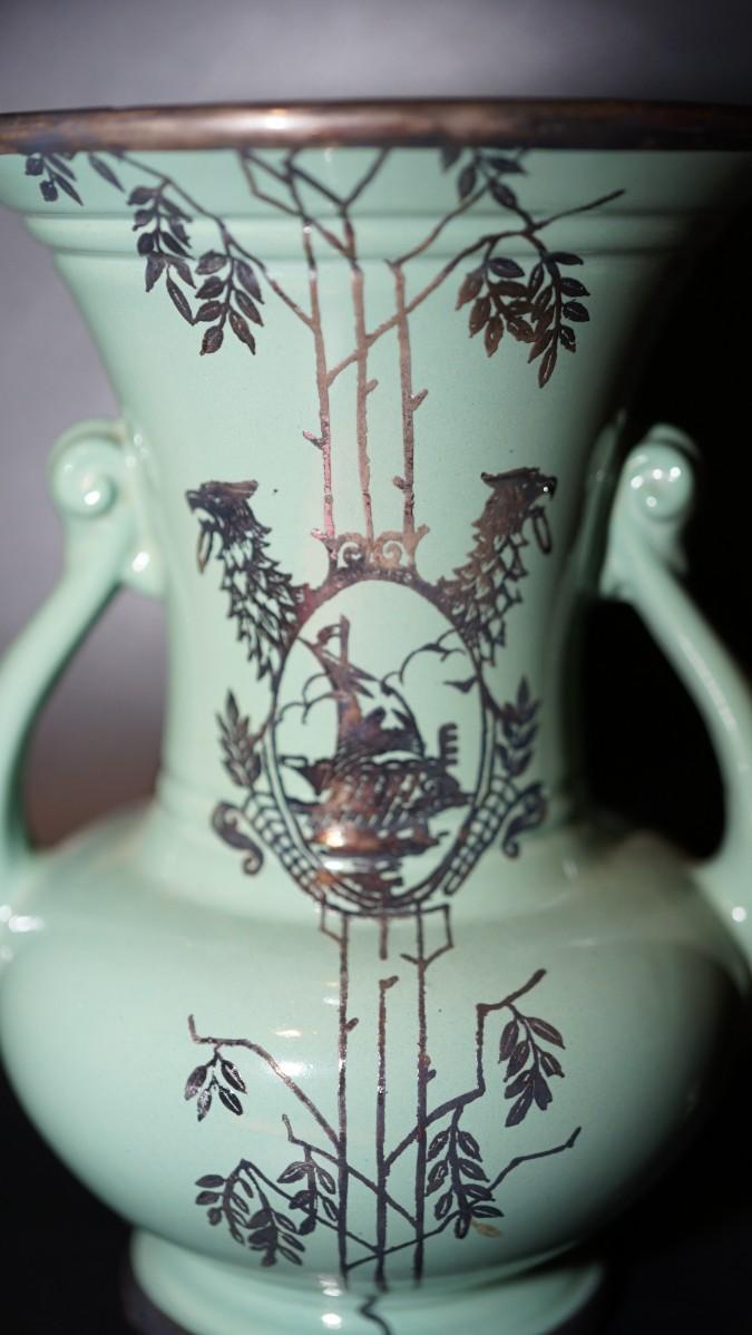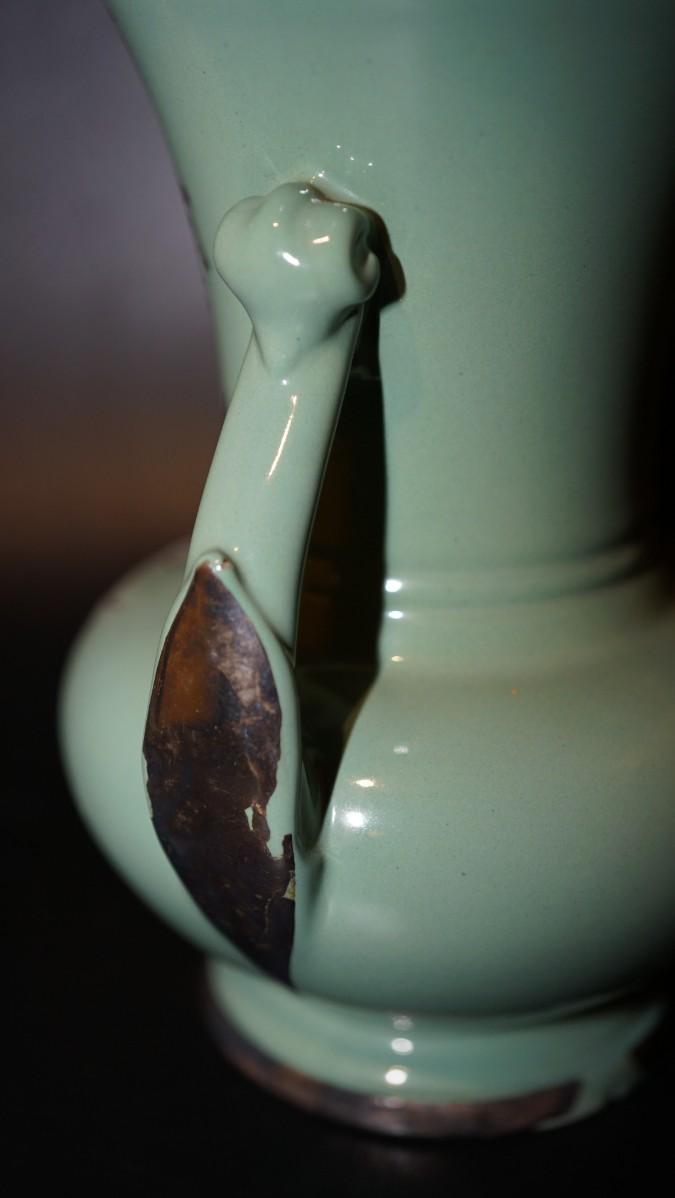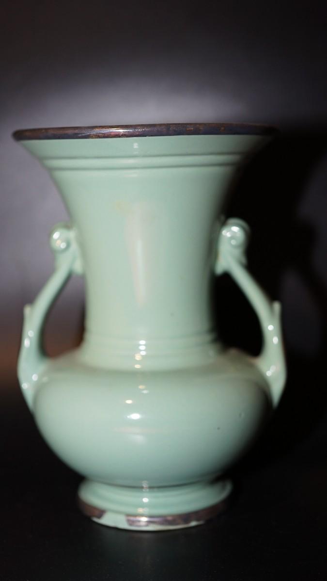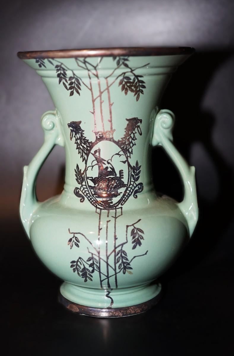light teal glazed handled vase with silver overlay in pattern of branches and leaves . appears to be a sail boat in center