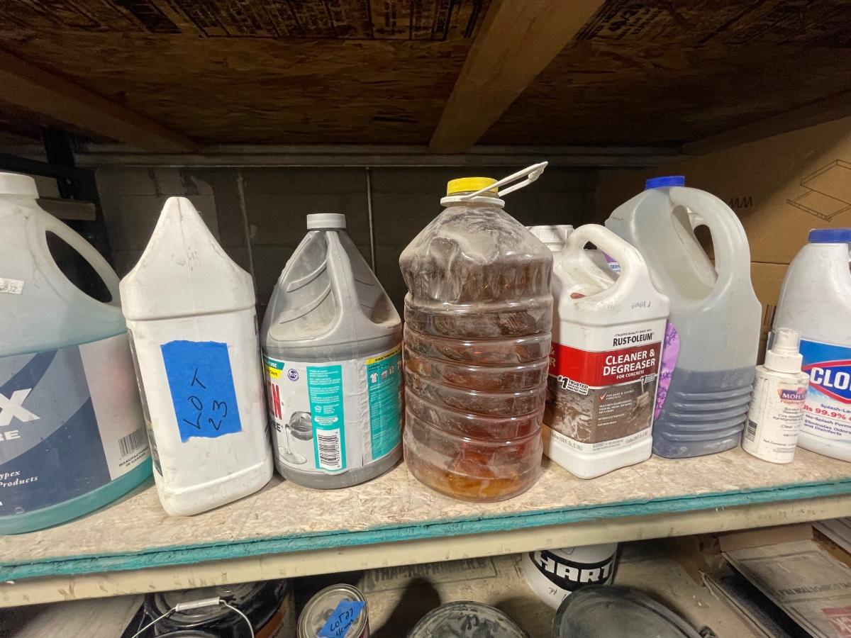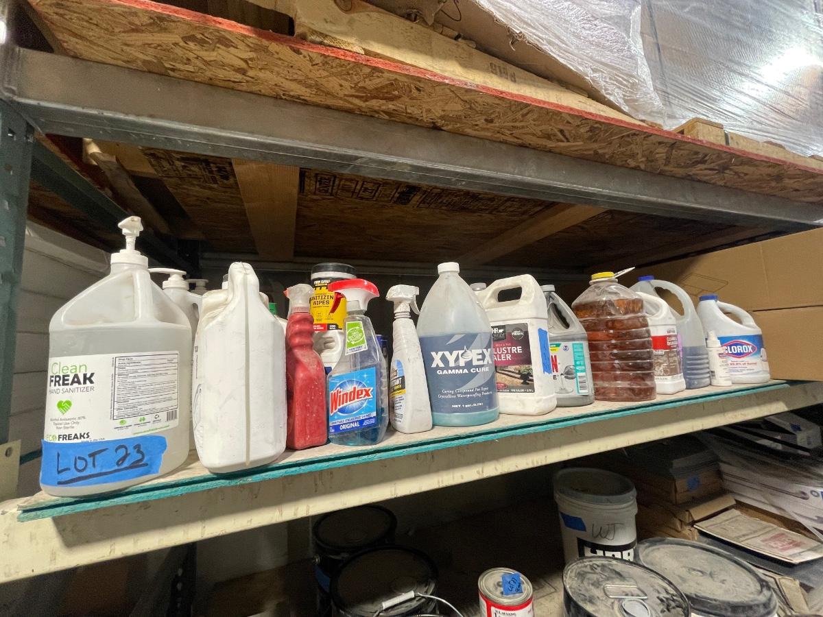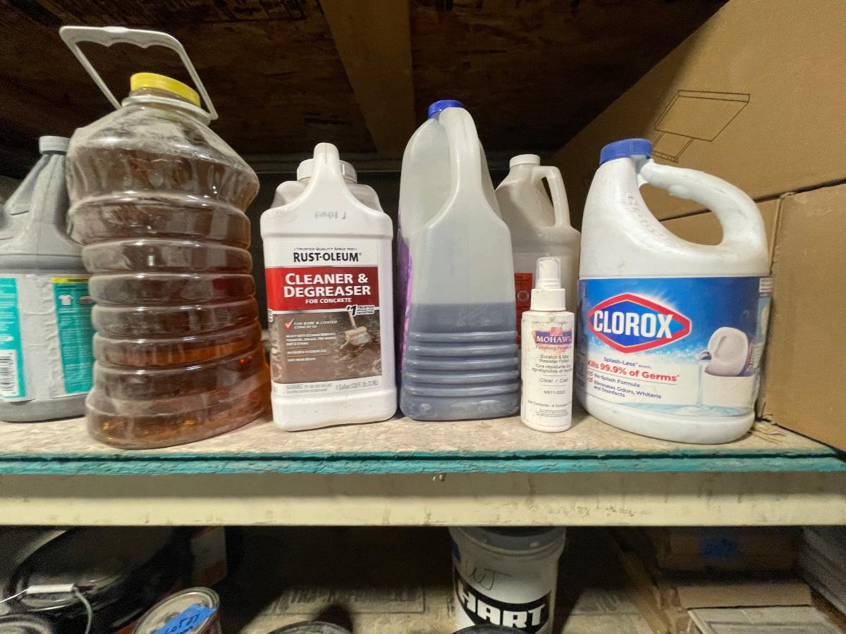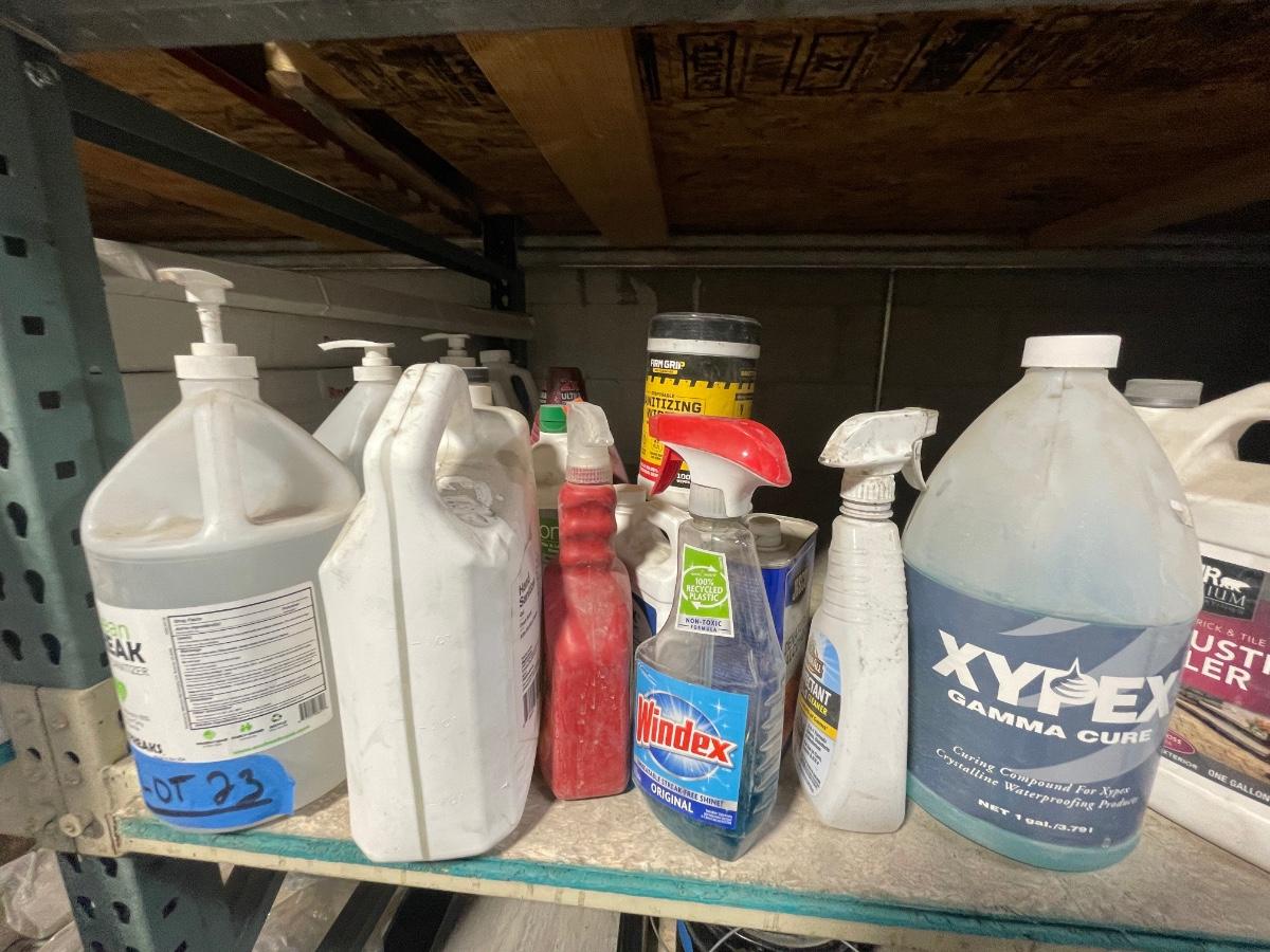 Full Shelf of 18 Bottles incl. 3 lg Hand Sanitizer, Cleaners, sealers, degreasers, windex, bleach, Lysol?