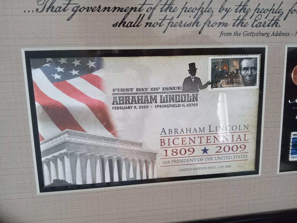 FIRST DAY OF ISSUE CANCEL ENVELOPE, LINCOLN .42 STAMP AND NEW ISSUE PENNIES