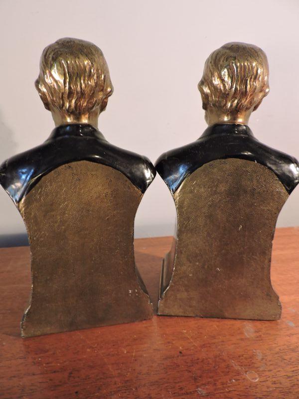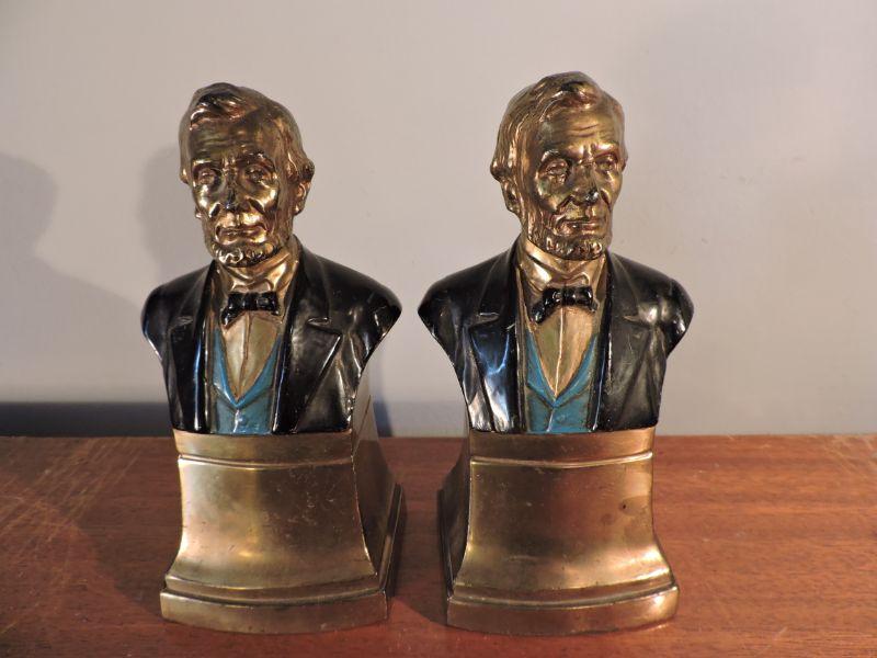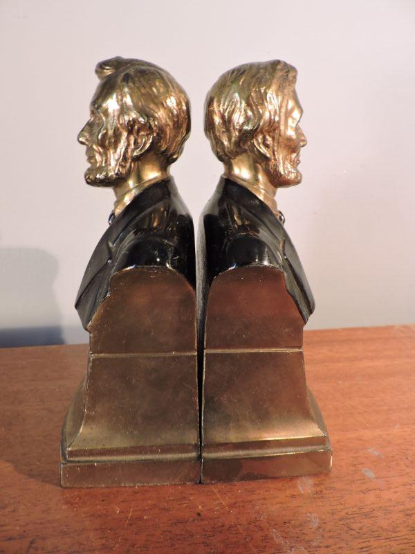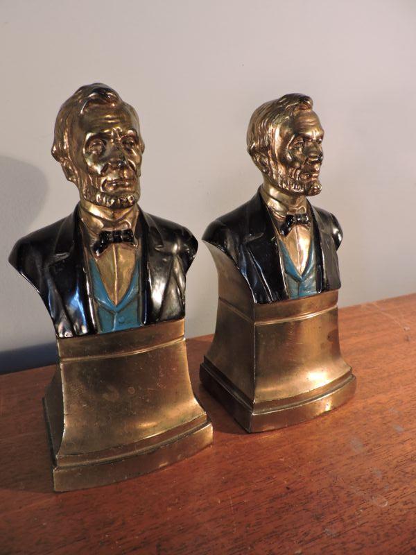Vintage cast Abraham Lincoln painted brass bookends made by Crescent Metal Works. **Please read Terms and Conditions before placing a bid. Pick up is Sunday, November 24 from 9am to 3pm or Tuesday, November 26 from 4pm-7pm in Mantua, NJ. All sales are final. All sales are as is, where is. Please review all photos. Any props included in photos are not included in listing. All measurements are approximate.