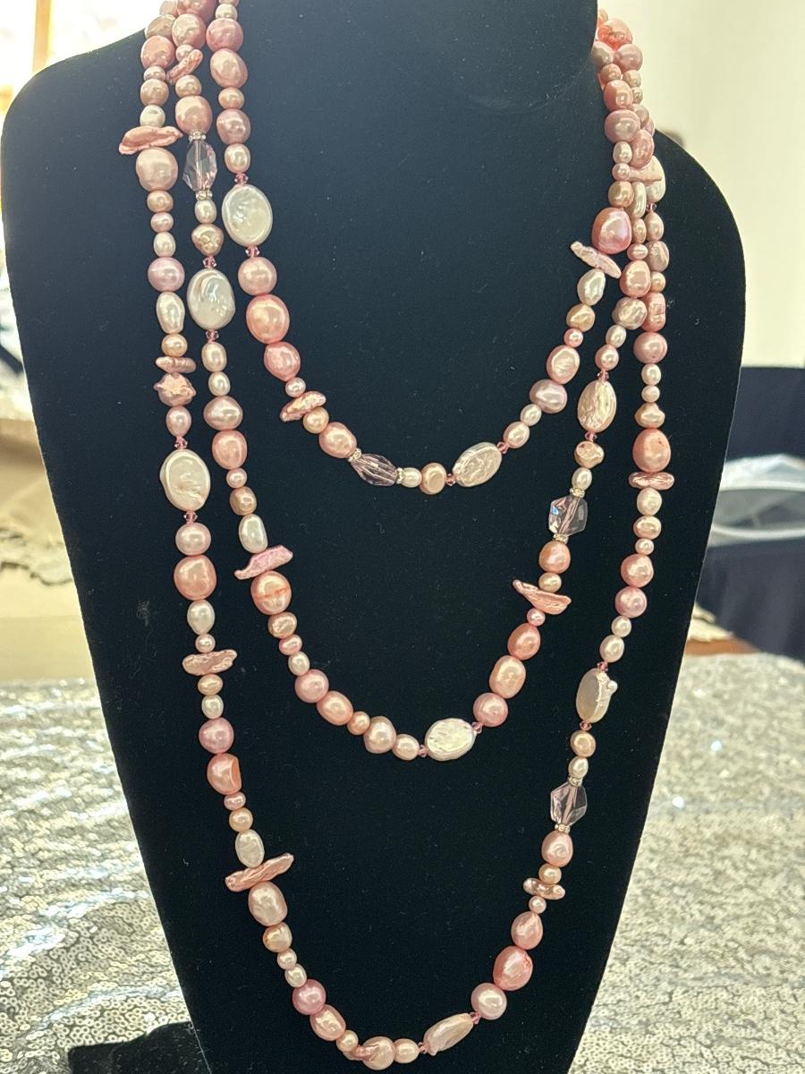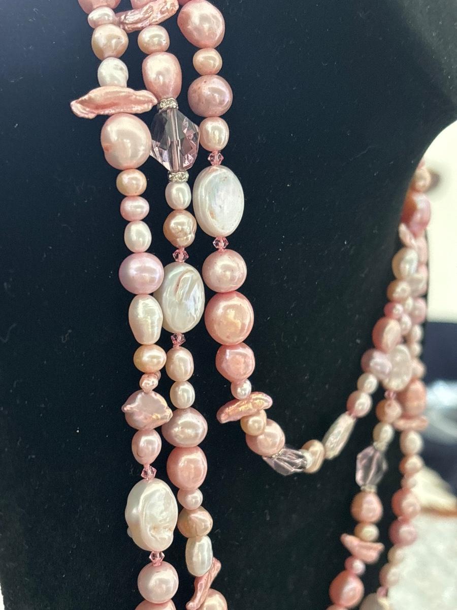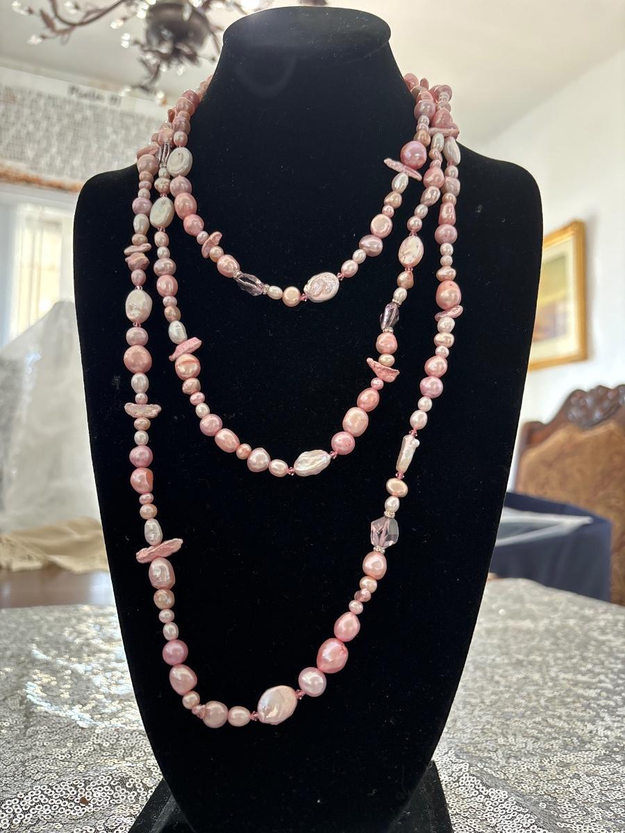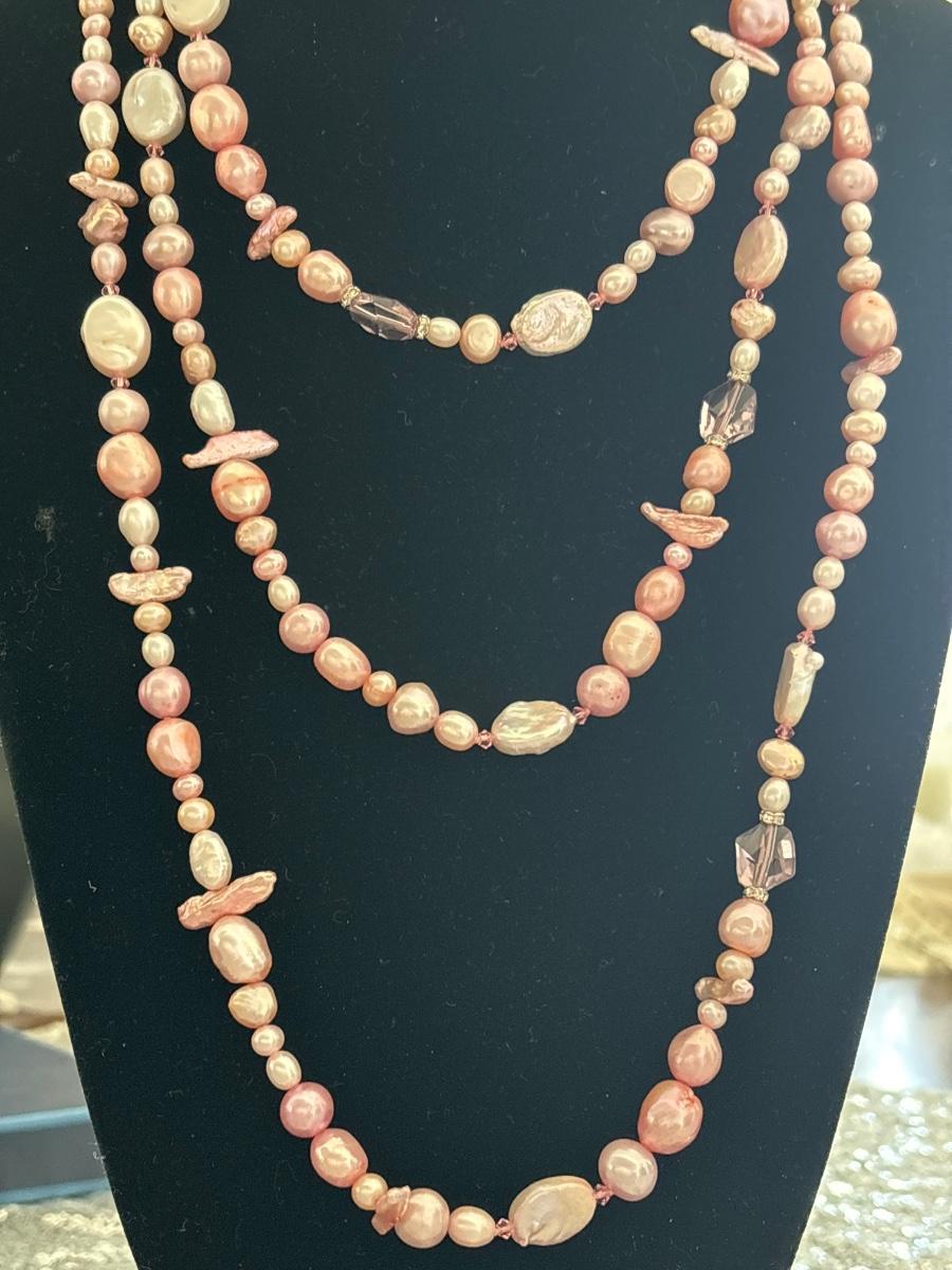 Absolutely beautiful Large Oprah/Lariat length, pearl necklace, natural iridescent pearls with light pink crystals