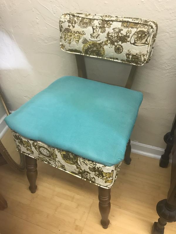 Absolutely CUTE Sewing Chair! There is one disclosure, there is a tear on the upper left-side and right-side on vinyl. Otherwise, this chair is a great add-on to that sewing room! LOCAL PICK UP ONLY, no shipping. 29" x 17: x 18". 17.8 lbs.
