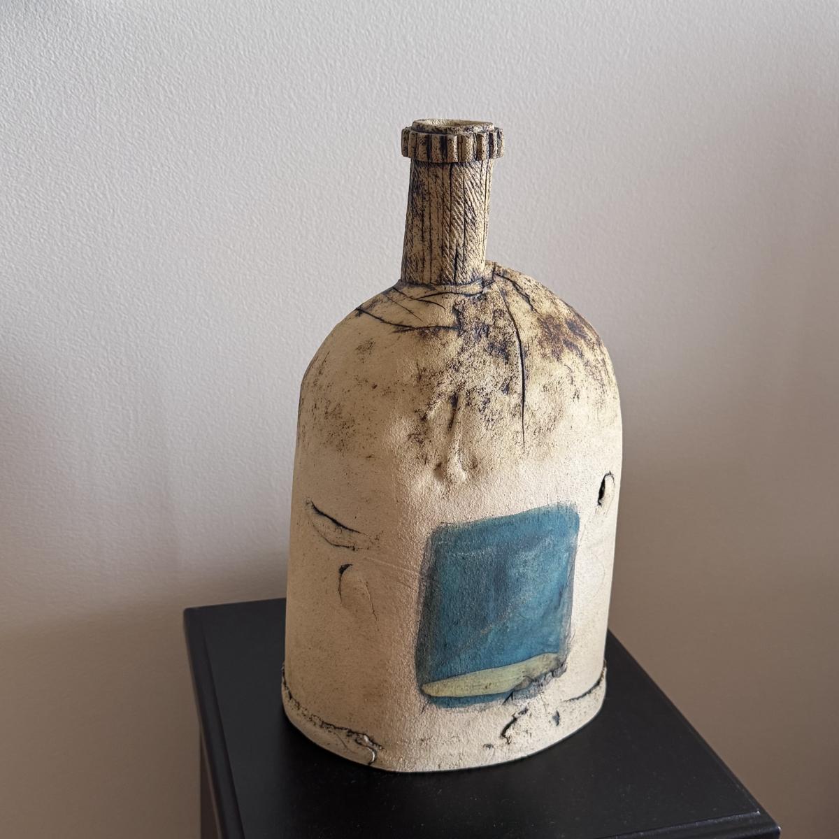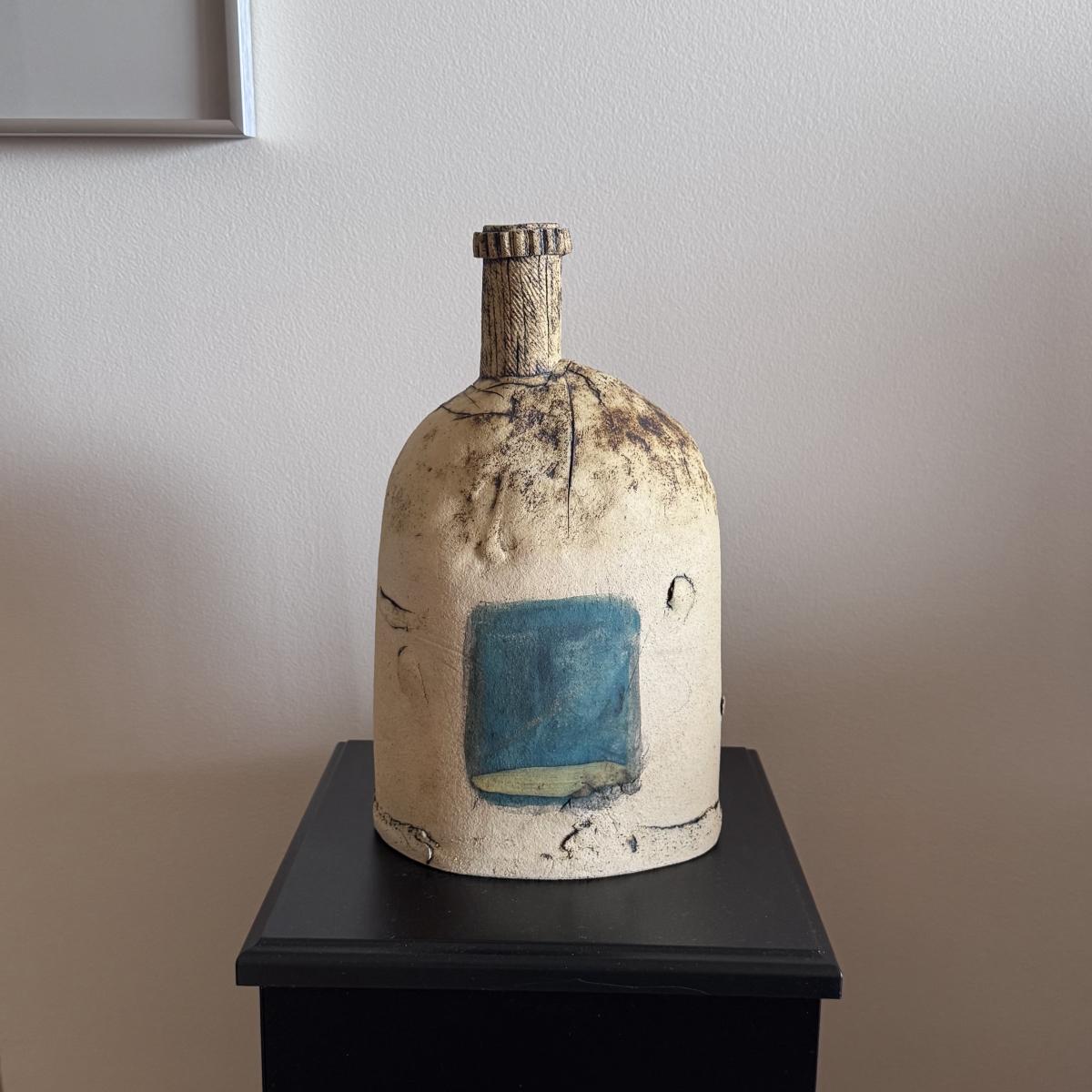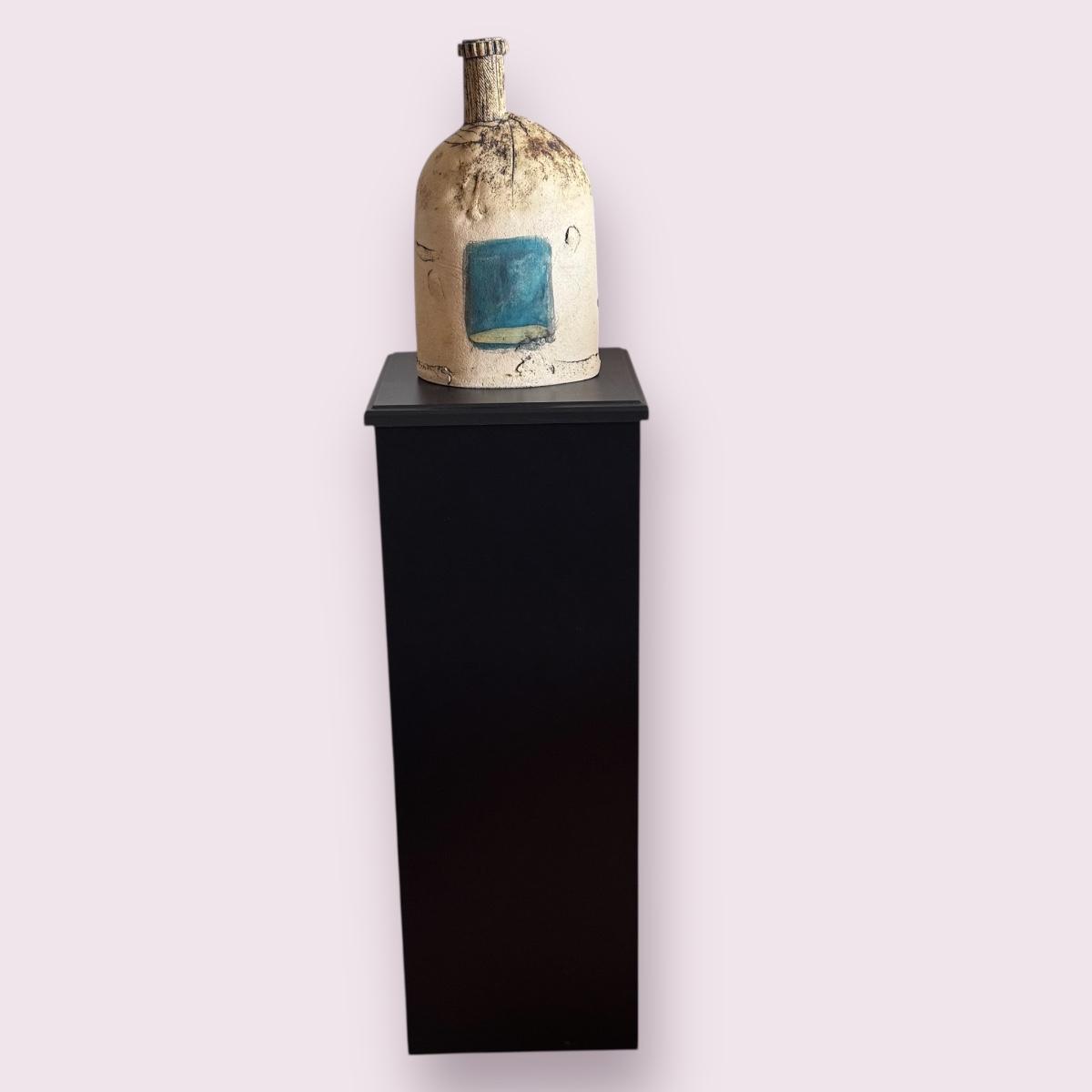This lot includes one ceramic sculpture that resembles a vase. It has blue and green accents and a signature and date on the bottom. The stand is wooden and painted black. The top of the stand is removable and has a bag of cardboard attached to it, likely to weigh down the top. The sculpture measures 7” x 5” x 13”H and the stand measures 11” square x 30”H.
