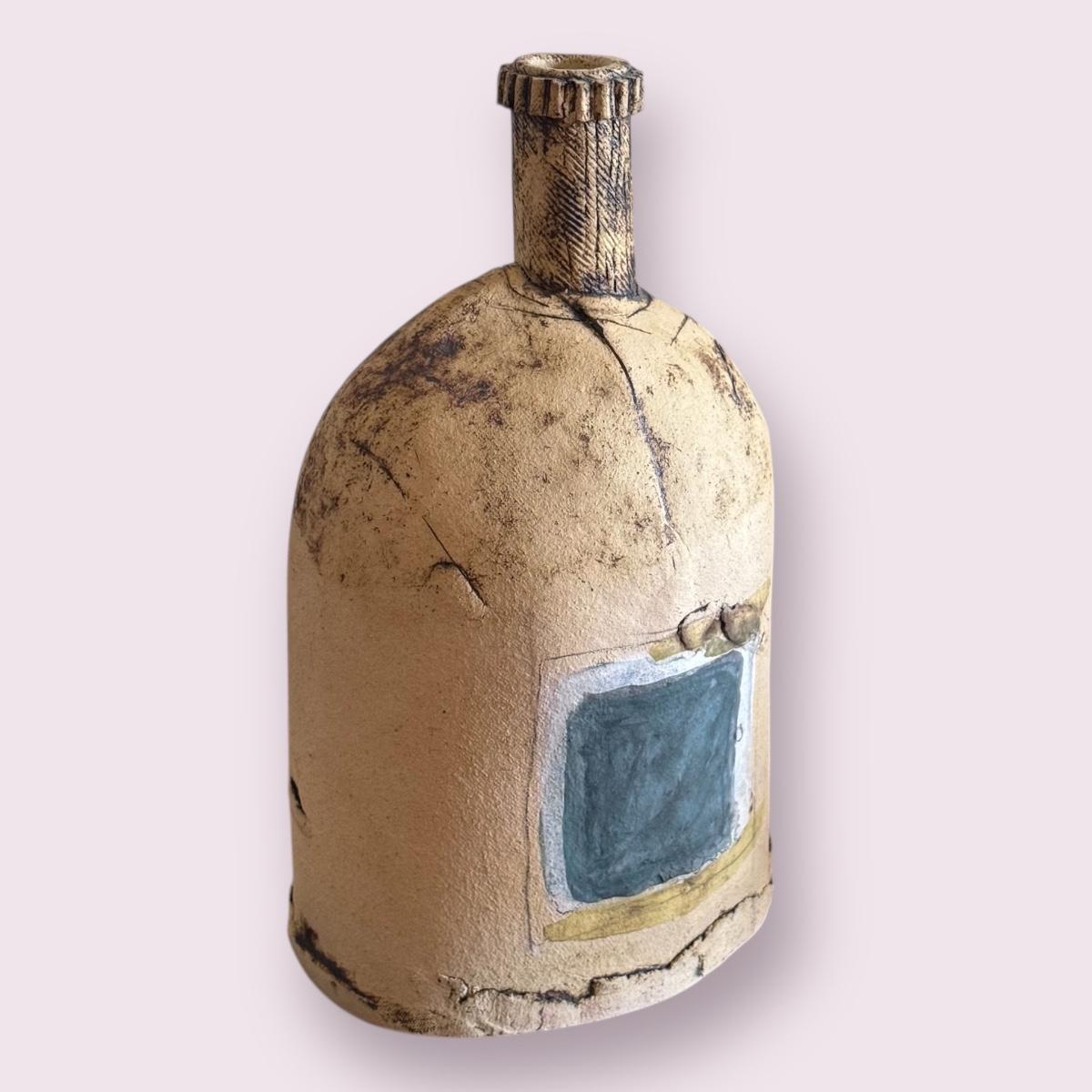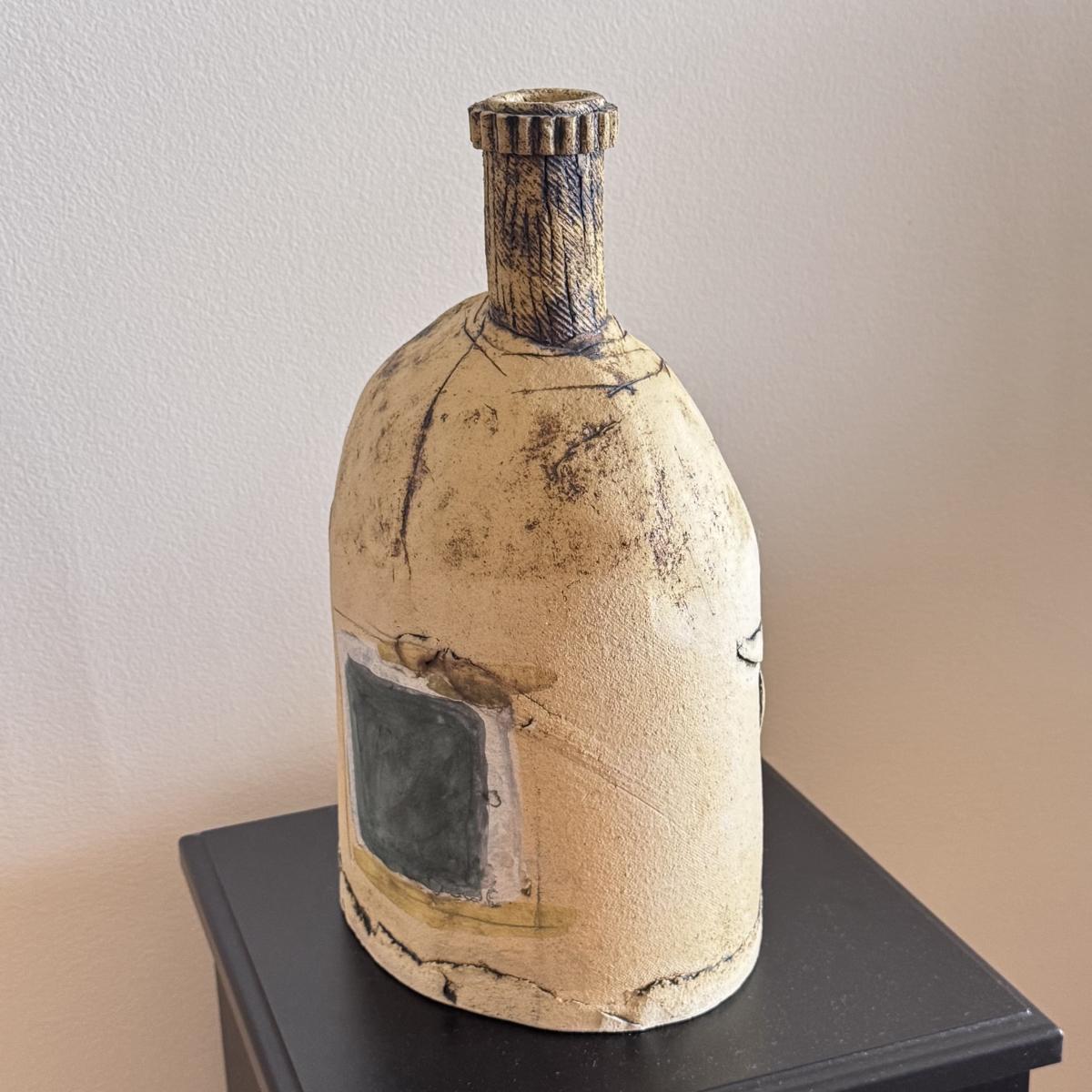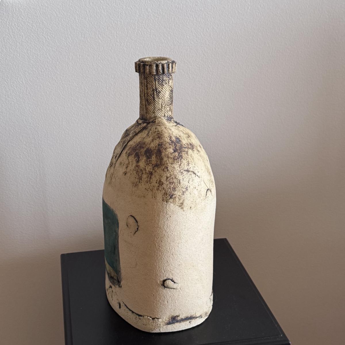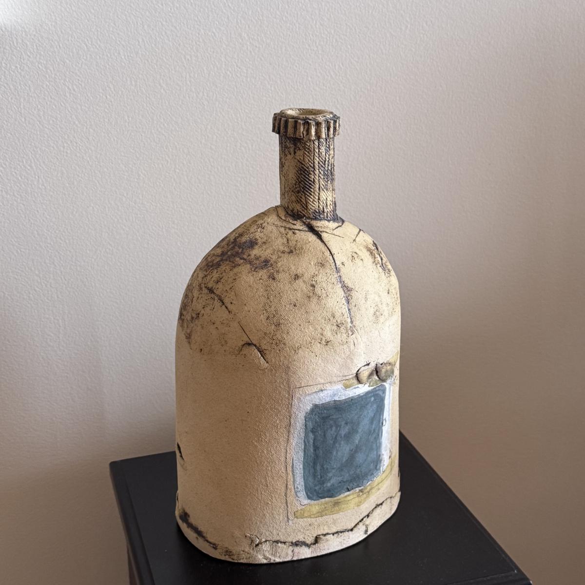 This lot includes one ceramic sculpture that resembles a vase. It has blue and green accents and a signature and date on the bottom. The stand is wooden and painted black. The top of the stand is removable and has a bag of cardboard attached to it, likely to weigh down the top. The sculpture measures 7” x 5” x 13”H and the stand measures 11” square x 30”H.