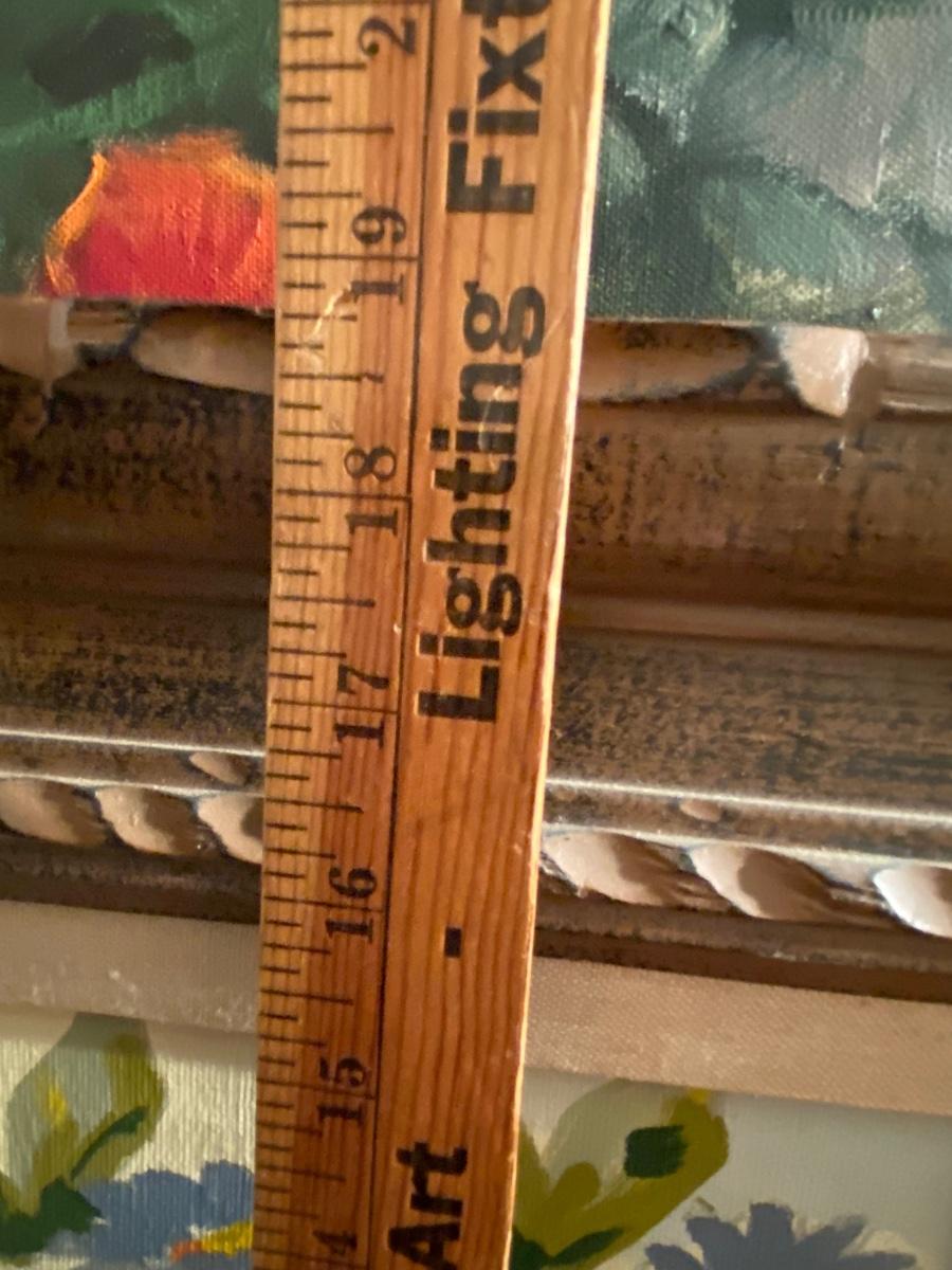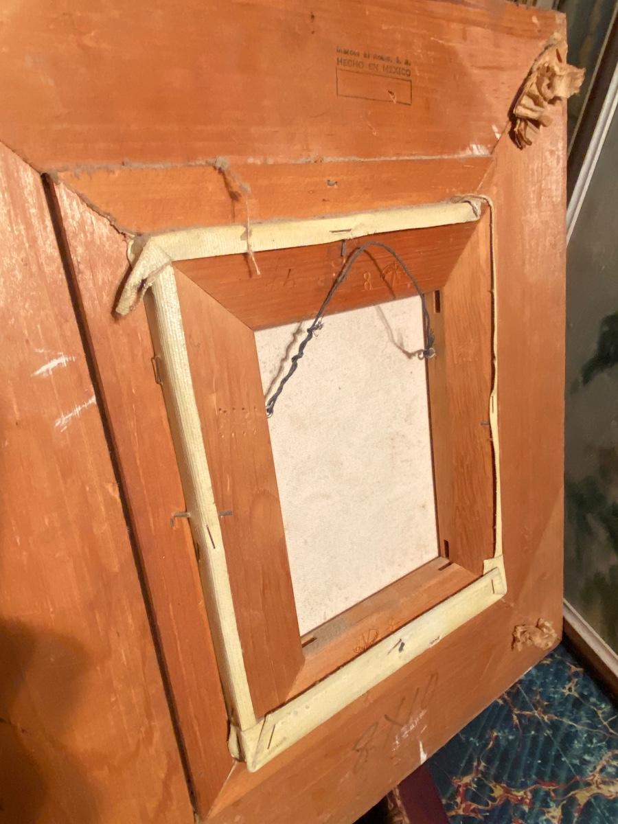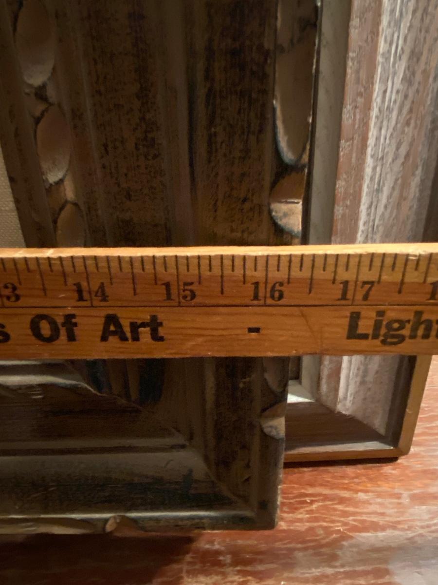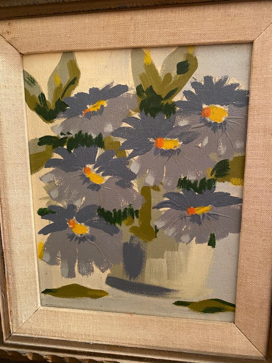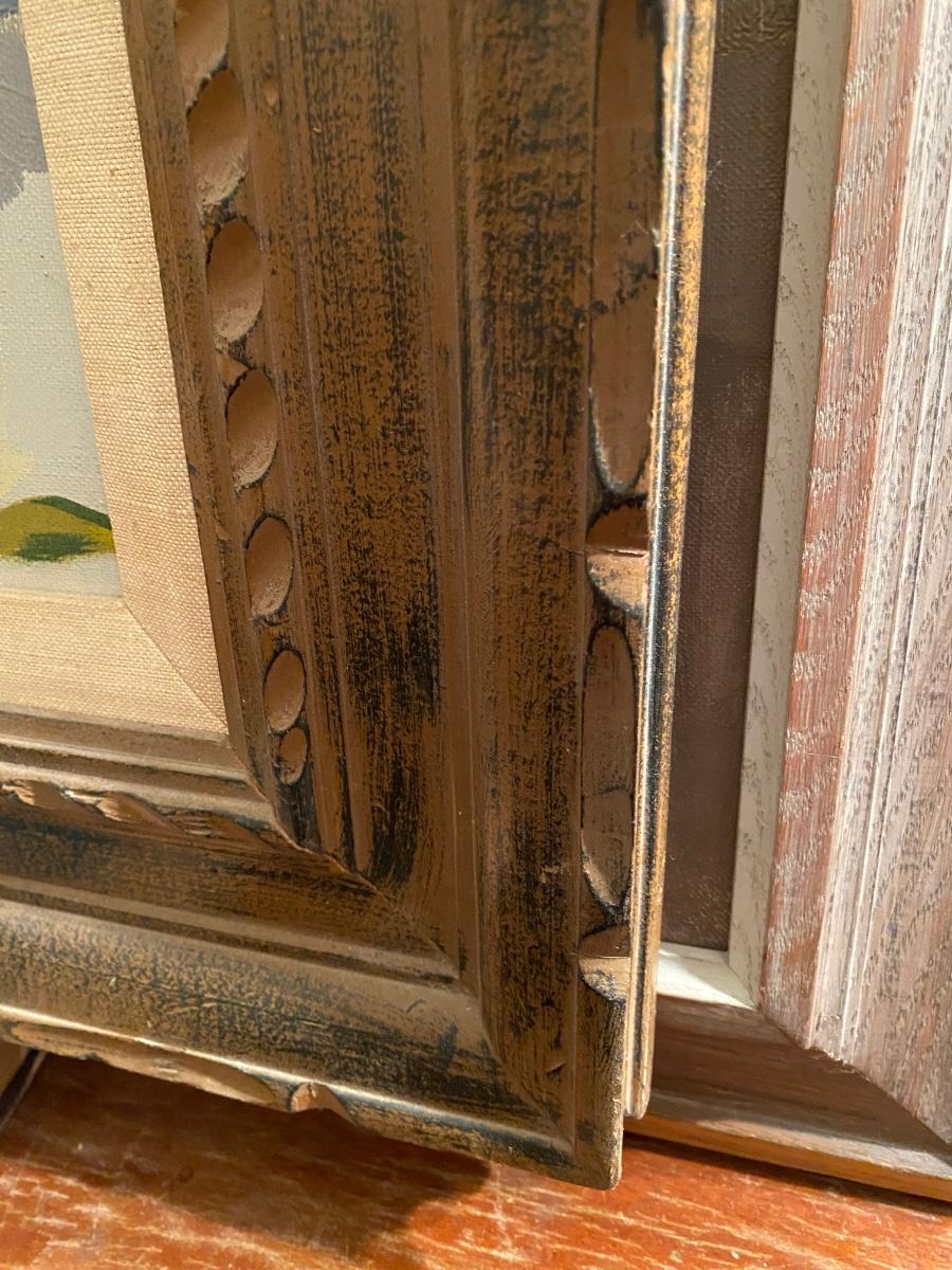 Abstract flowers in a white bowl settled in a Chunky carved wood frame . 19x16