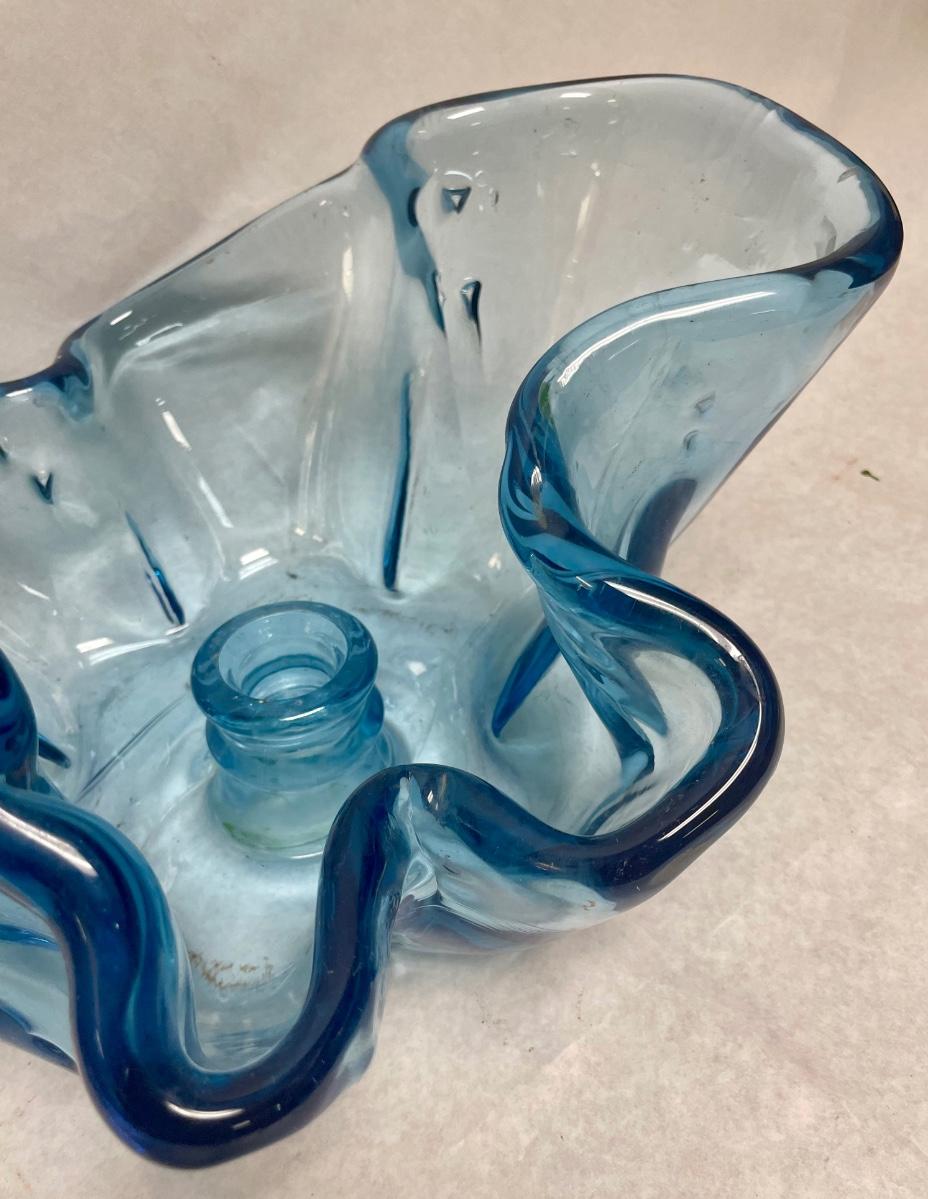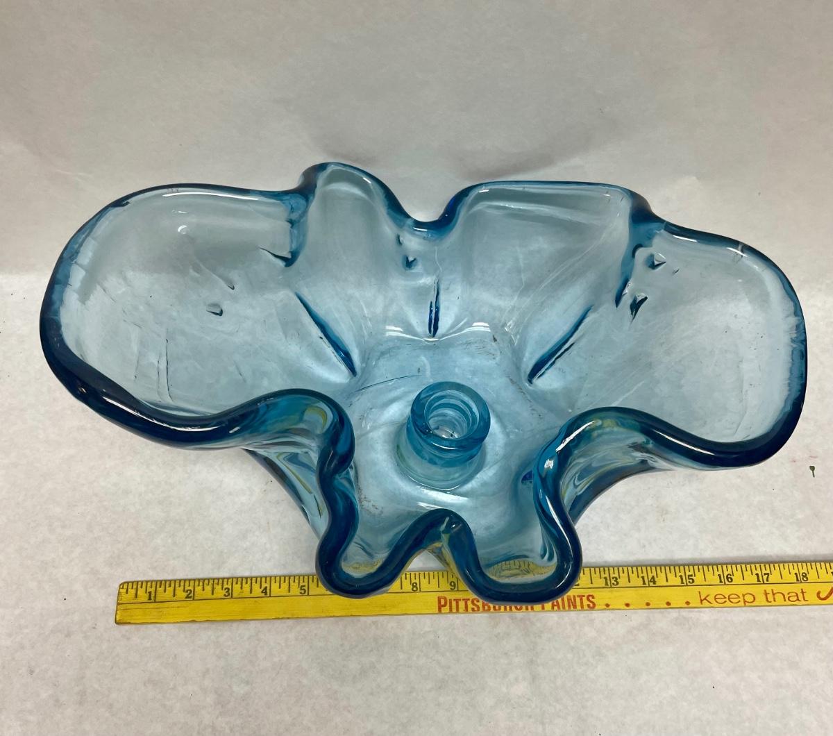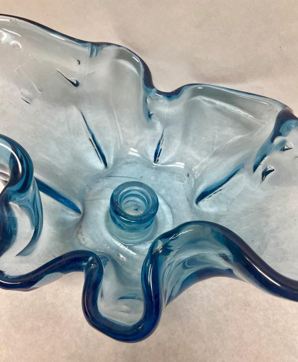Made from a 5-gallon glass water bottle. Blue colored glass with abstract scalloped edges. Very heavy. Approx. 18" across the widest part.